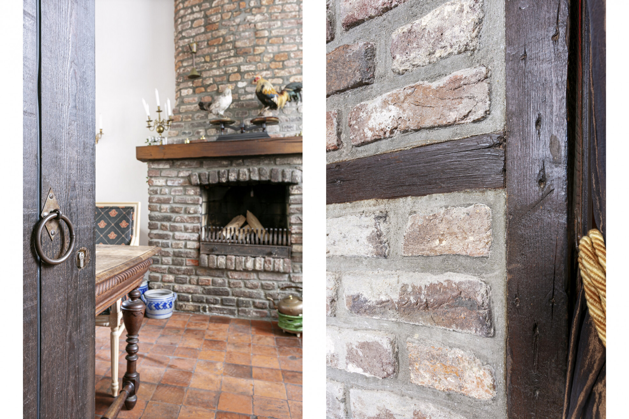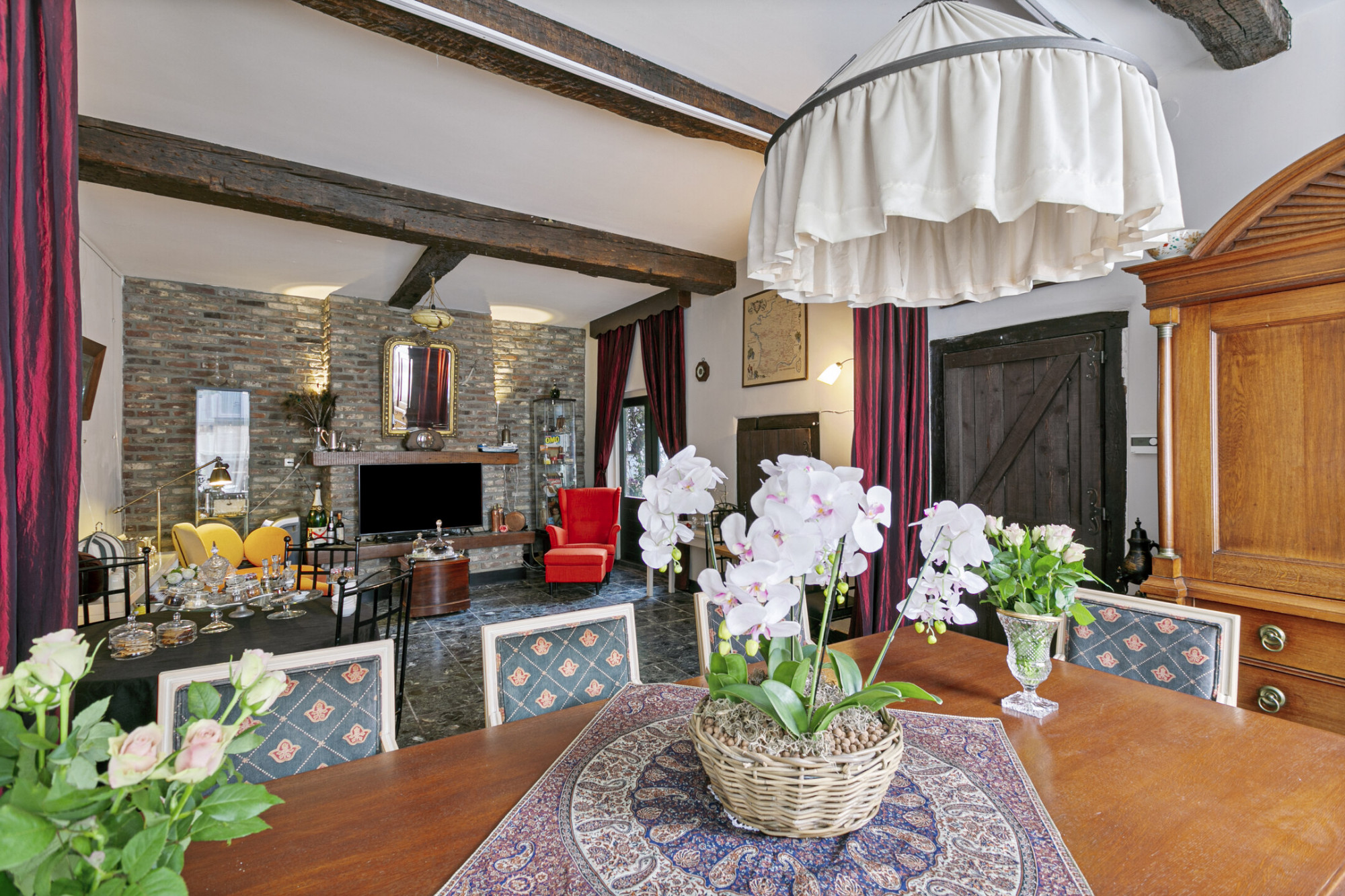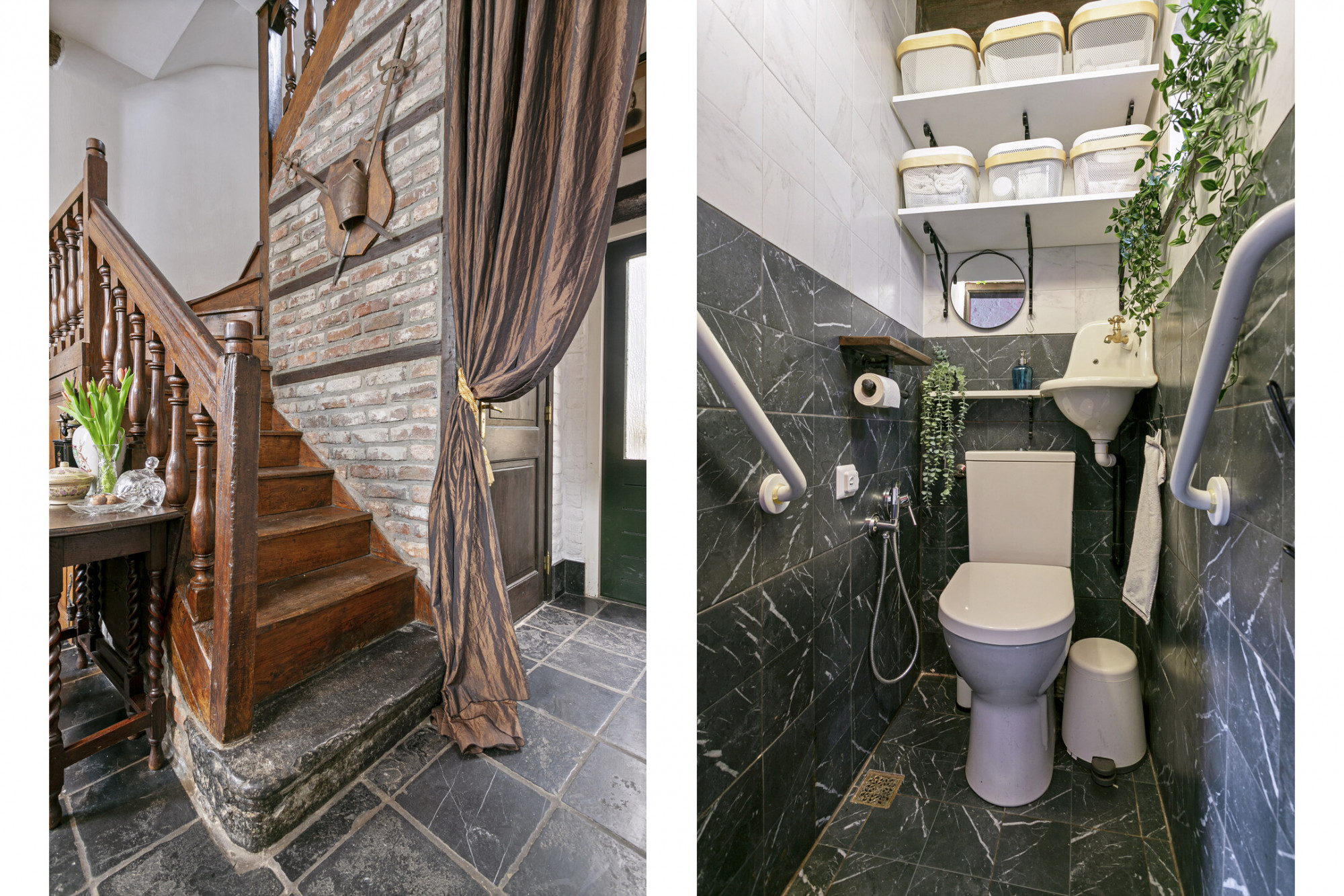 Bij binnenkomst ademt de ruimte direct sfeer. De trappartij, waarbij het originele houtwerk nog te zien is, springt direct in het oog. Onder de trappartij bevindt zich het gastentoilet met klassiek fonteintje. Middels nieuwe doch authentieke deuren komt u rechts in de keuken voorzien van alle denkbare gemakken. De antieke boeren plavuizenvloer is voorzien van vloerverwarming en er is tevens een haardpartij aanwezig. Aan de linkerzijde van de entree bevindt zich de living met openslaande deuren naar de patiotuin. Ook hier is een haardpartij en zijn er authentieke elementen zichtbaar zoals de balkenstructuur. Tevens is de kelder vanuit de living bereikbaar.