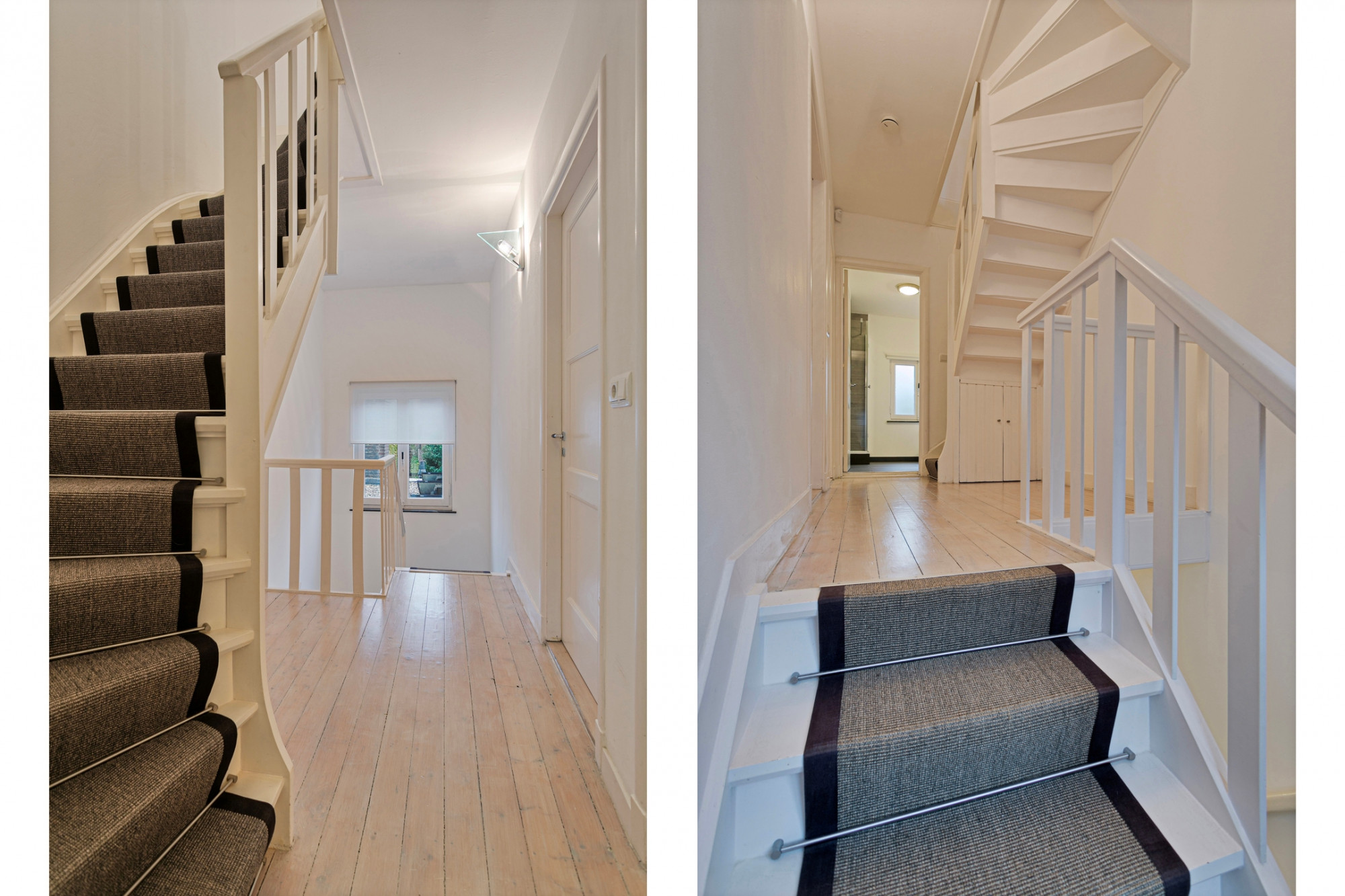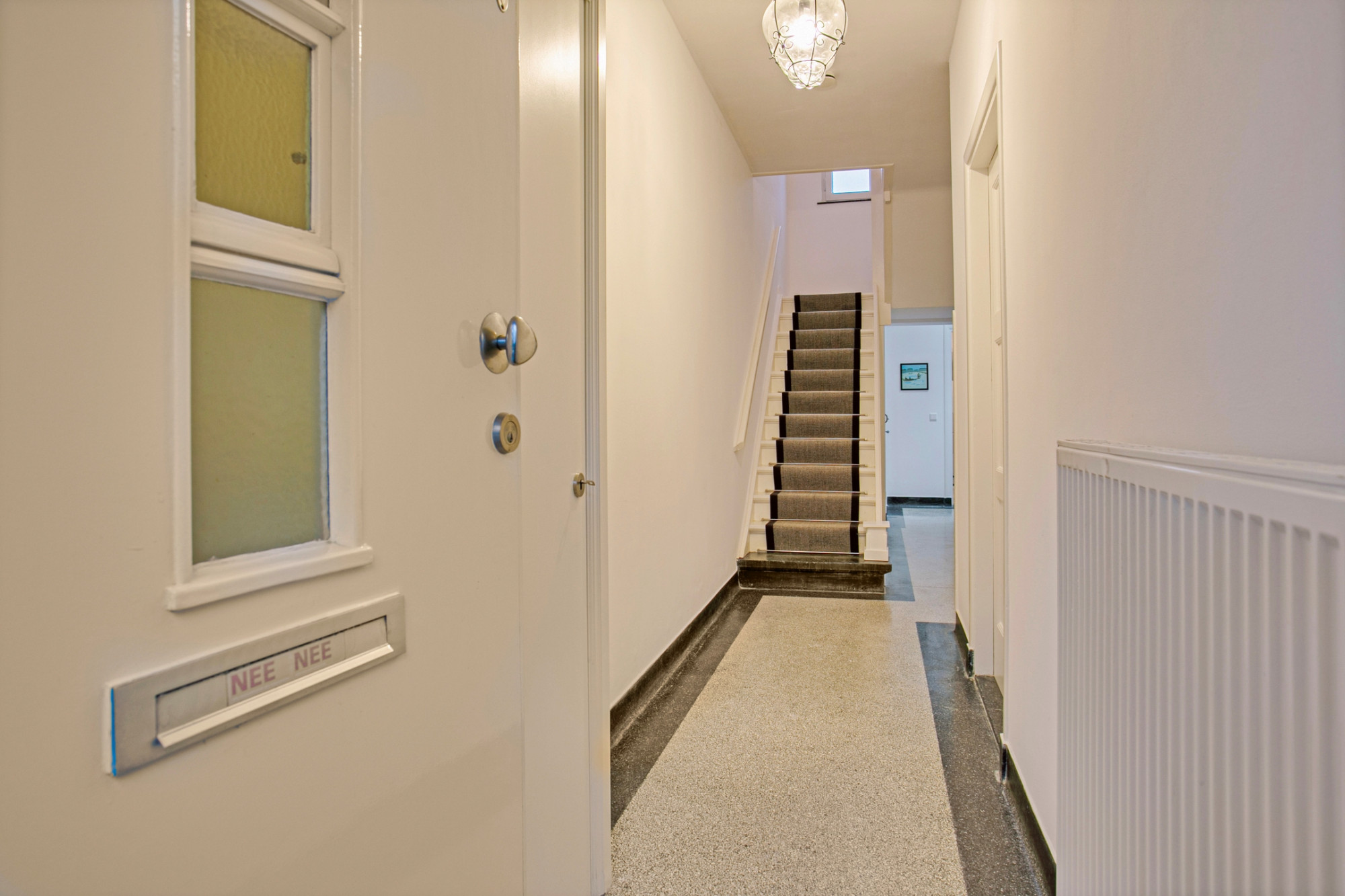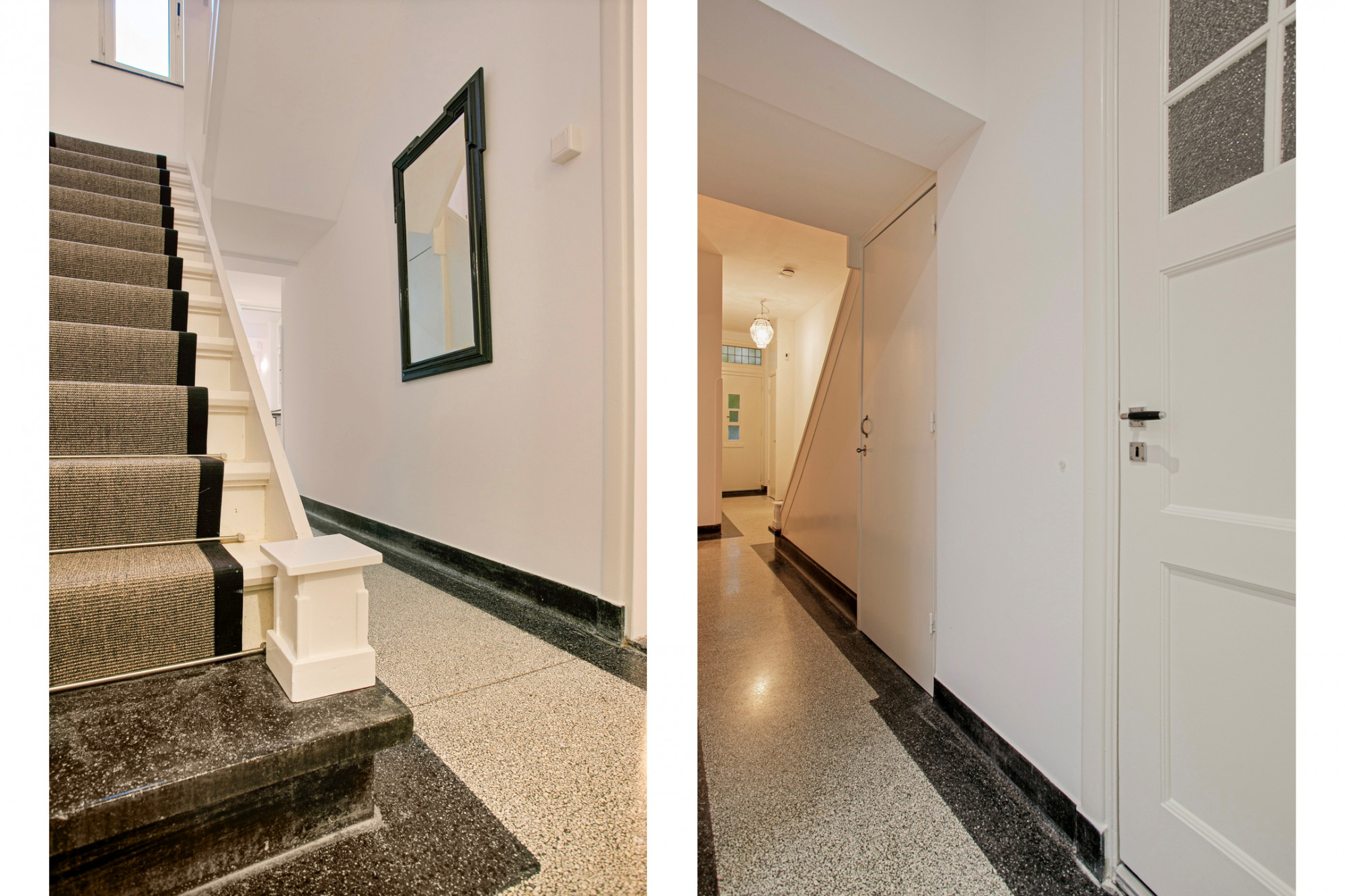 Via de voortuin bereik je de entree/hal (15m²) van deze mooie woning. De hal heeft een originele terrazzovloer, met aansluitend de kelder, het toilet met fonteintje en een openslaande deur naar de woonkamer en keuken. Vanuit de hal zie je de stijlvolle originele houten bordestrap met traploper.