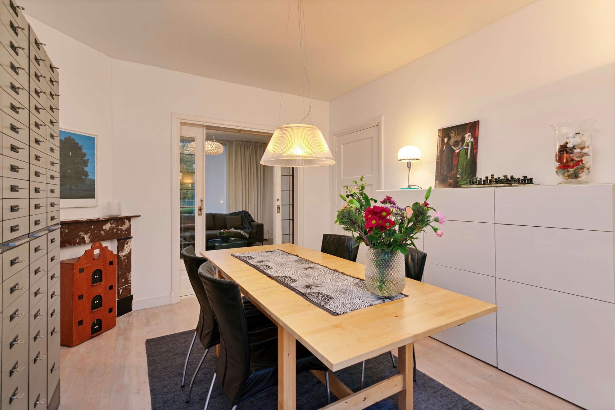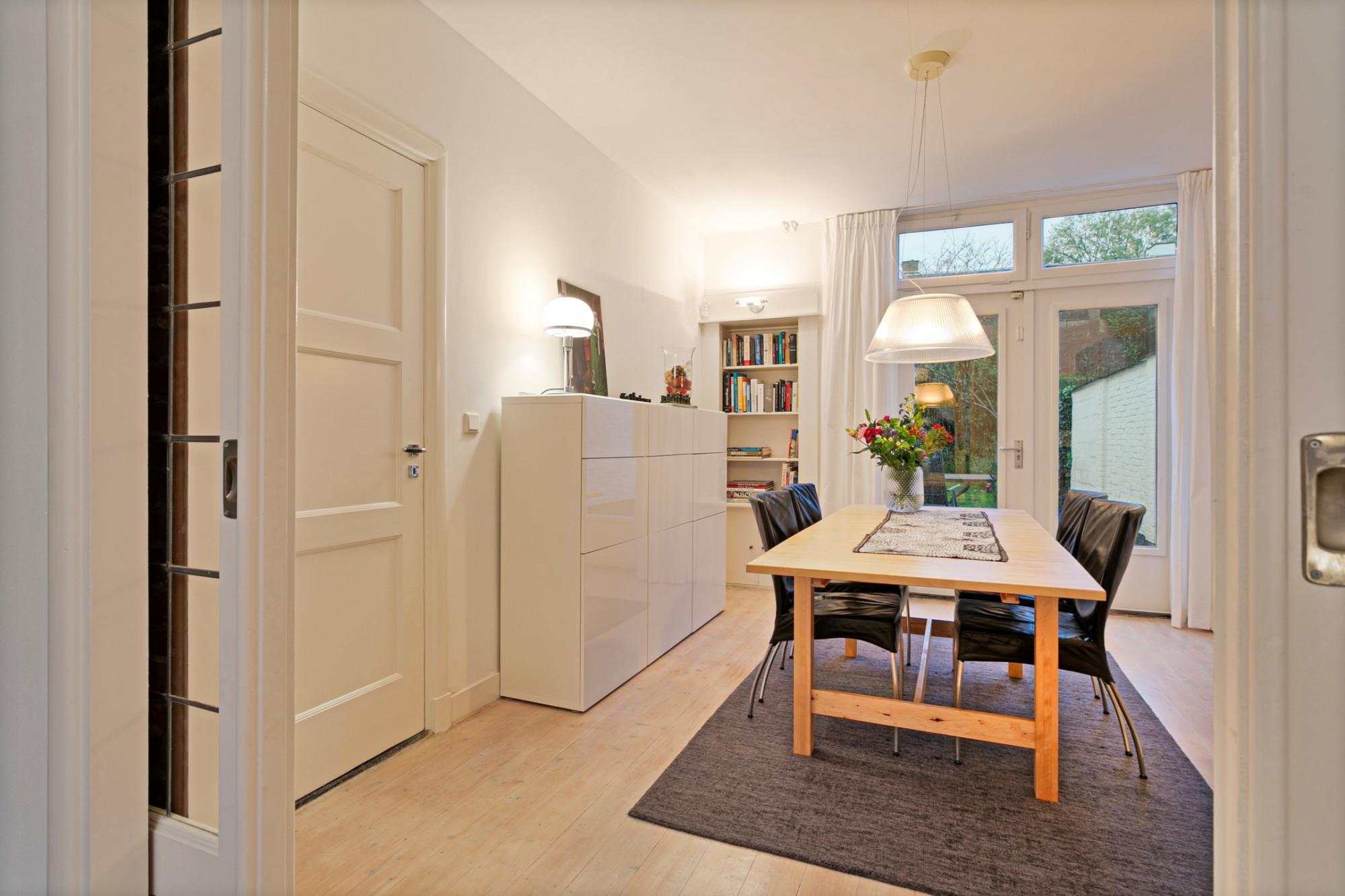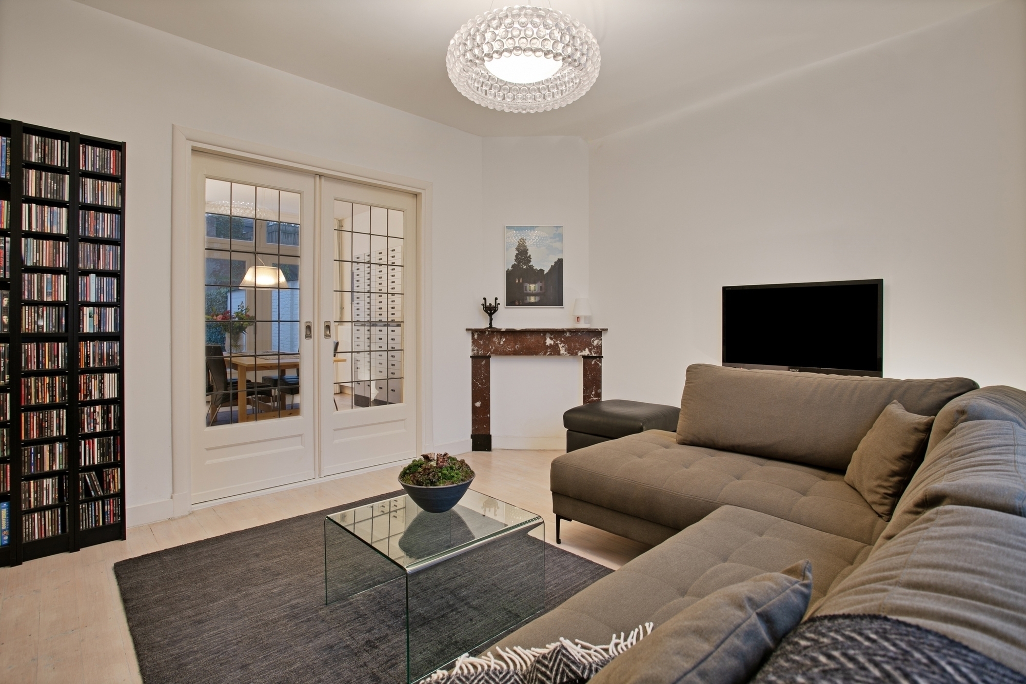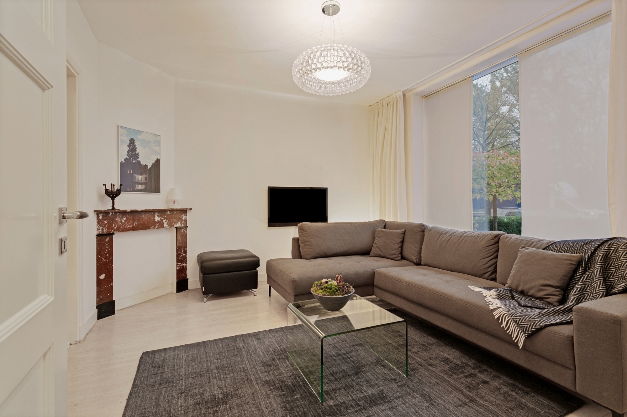 De woonkamer (29m²) met dubbele schouw en een originele plankenvloer is stijlvol ingericht en geniet van veel lichtinval. De woonkamer is gescheiden in een zit- en eetgedeelte middels een glas in lood schuifdeur. Het eetgedeelte biedt door de openslaande deuren een aangename verbinding met de groene tuin.