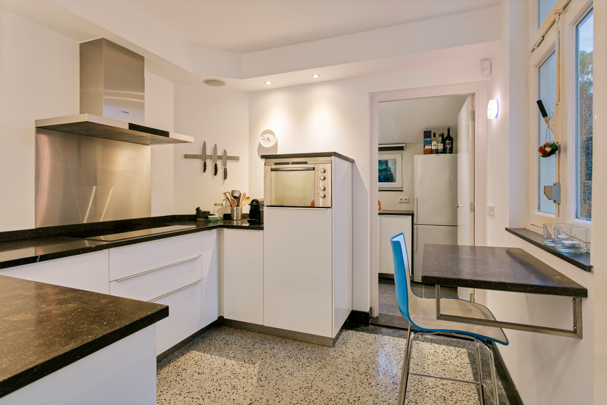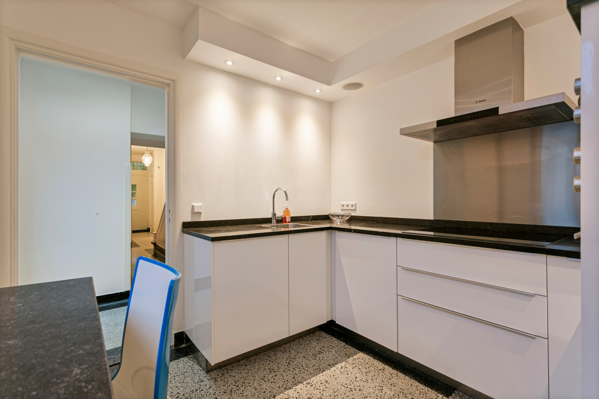 De gesloten keuken (8m²) is aan de achterzijde van de woning gelegen, beschikt eveneens over een mooie terrazzovloer en is afgewerkt met een blauwsteen werkblad. De keuken is voorzien van alle benodigde (inbouw)apparatuur, te weten: spoelbak, 5-pits keramische kookplaat met afzuigkap, vaatwasser, koelkast en een combi oven.