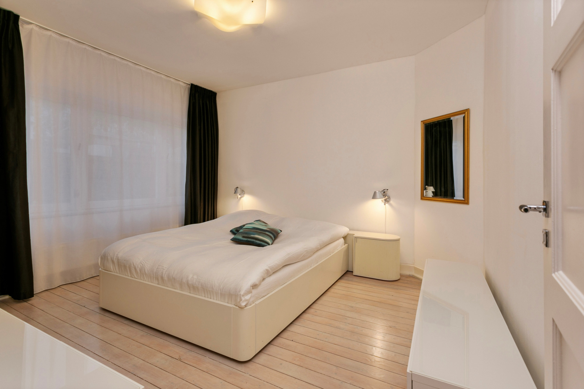 Via de stijlvolle houten bordestrap loop je naar de overloop, met een trapkast op de eerste verdieping. Deze verdieping herbergt een tweetal grote slaapkamers. Slaapkamer 1 (15m²) aan de voorzijde, is voorzien van een erker met uitzicht over de straat. Deze slaapkamer is thans in gebruik als walk-in closet en is daarvoor zeer geschikt vanwege het vele lichtinval. Slaapkamer 2 (14m²) is aan de achterzijde gelegen en biedt uitzicht op de tuin. De nette badkamer (6m²) is zeer ruim en uitgerust met een inloopdouche, dubbele vaste wastafel en het tweede toilet.