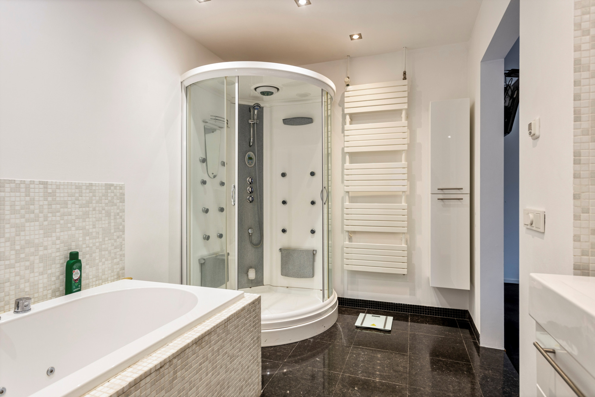 Overloop met toegang tot twee slaapkamers, separaat toilet met wandcloset en trapopgang naar de tweede verdieping. Slaapkamer 1 met walk-in-closet (5m²) is gelegen aan de achterzijde met aansluitend badkamer. Deze slaapkamer beschikt eveneens over een airco. Slaapkamer 2 is gelegen aan de voorzijde en beschikt over een oppervlakte van 13m². De moderne badkamer (10m²) met vloerverwarming is voorzien van een massagedouche/stoomcabine, whirlpool, dubbele vaste wastafel en toegang naar het dakterras.