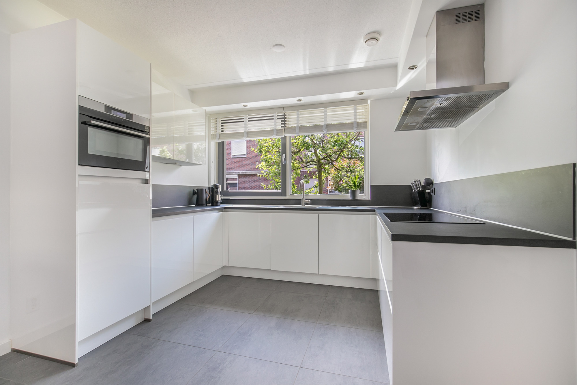 Entree/hal met meterkast en garderobe, modern toilet voorzien van wandcloset en fonteintje. Royale woonkamer (46m²) voorzien van een plavuizenvloer met vloerverwarming, trapkast en veel lichtinval door de aanwezigheid van een groot raam in de voorgevel en de grote raampartijen met openslaande tuindeur aan de achterzijde. Aan de voorzijde van de woning is de open keuken (7m²) gesitueerd. Deze moderne keuken (2018) beschikt over een inrichting in U-opstelling, voldoende opbergmogelijkheden en diverse (inbouw)apparatuur, te weten: afzuigkap, 5 pits inductie kookplaat, combi-oven, vaatwasser, twee vriezers, koelkast en een spoelbak.