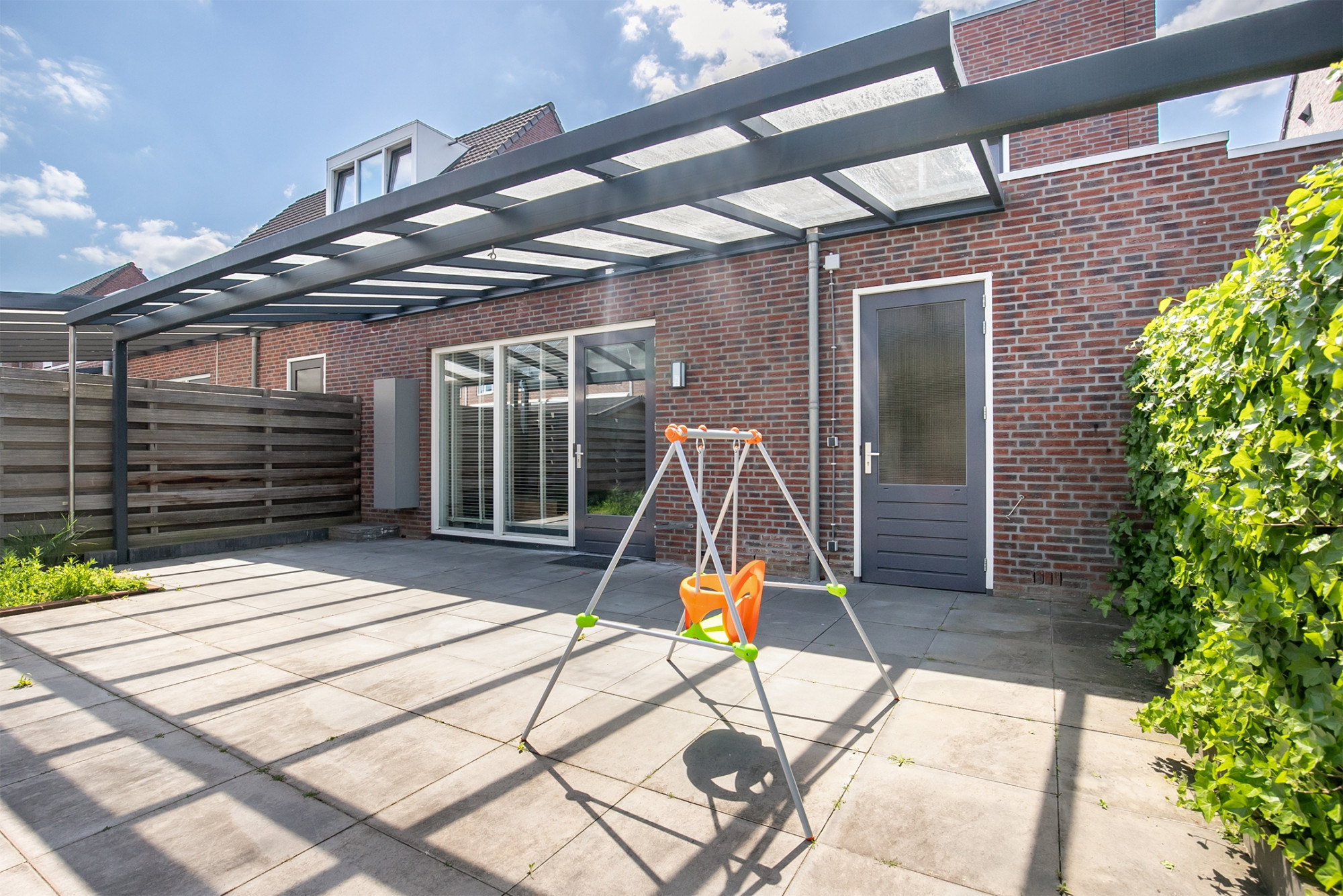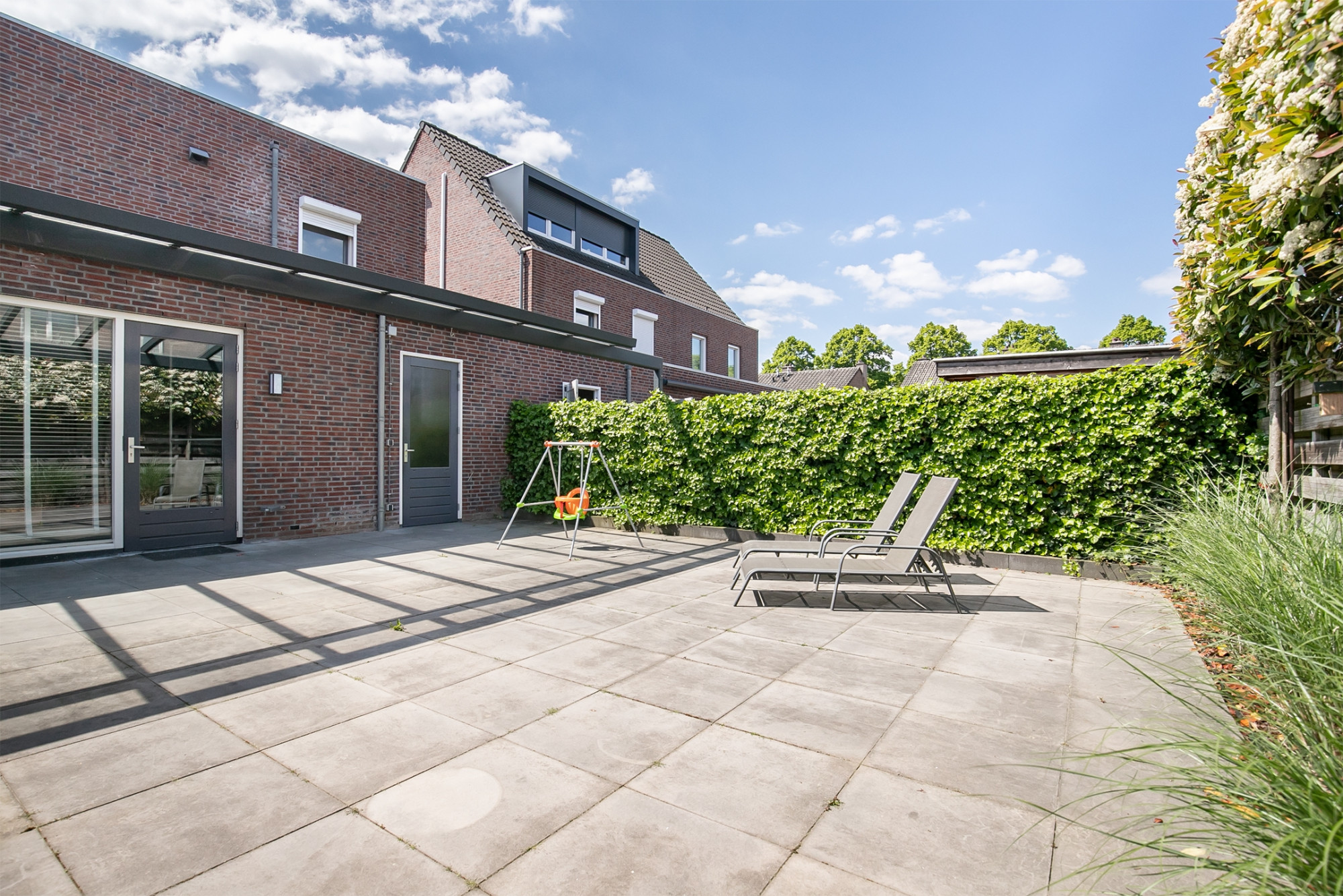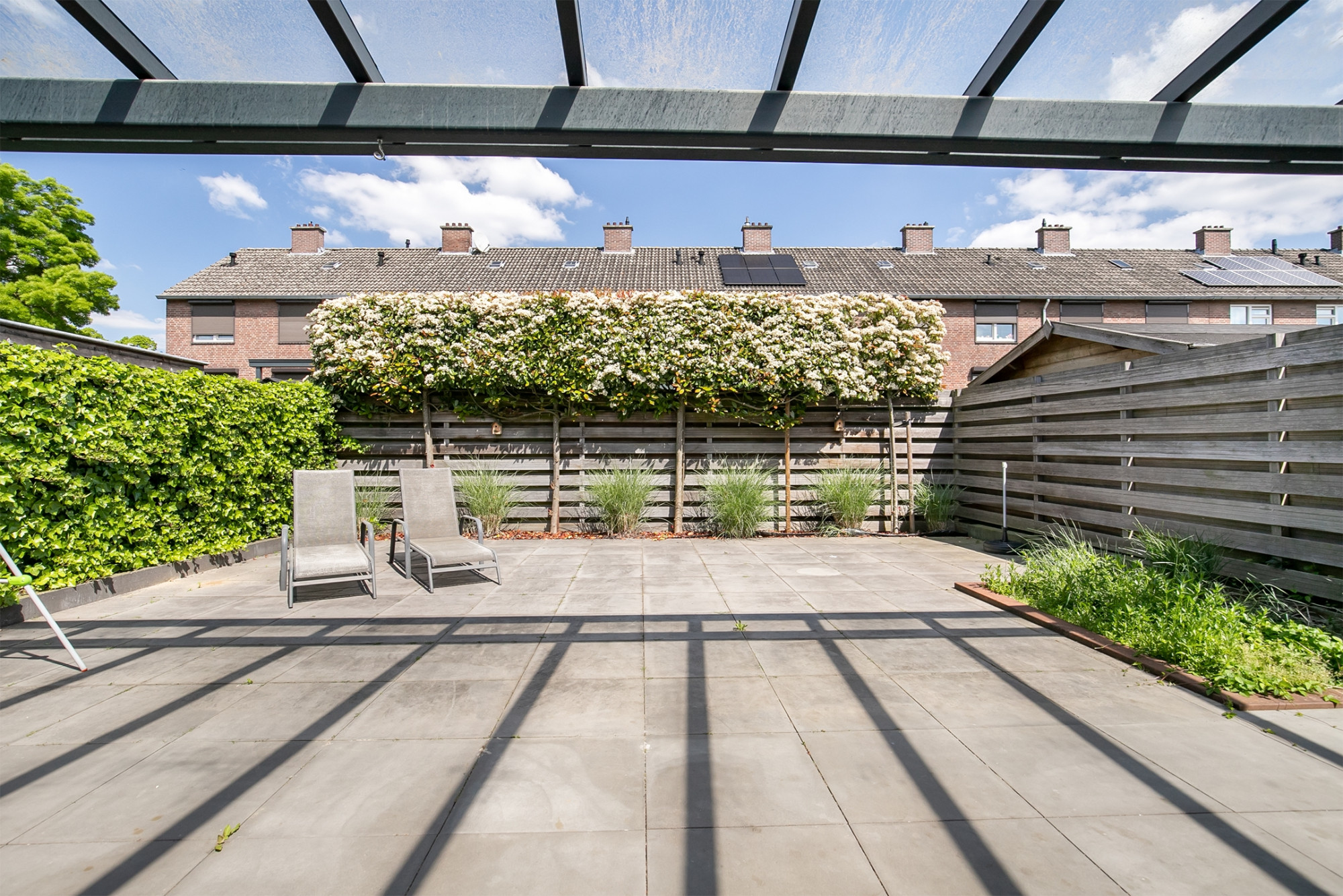 De achtertuin met terrasoverkapping (24m²) is onderhoudsvrij aangelegd en is bereikbaar via de garage en de openslaande deur vanuit de woonkamer.