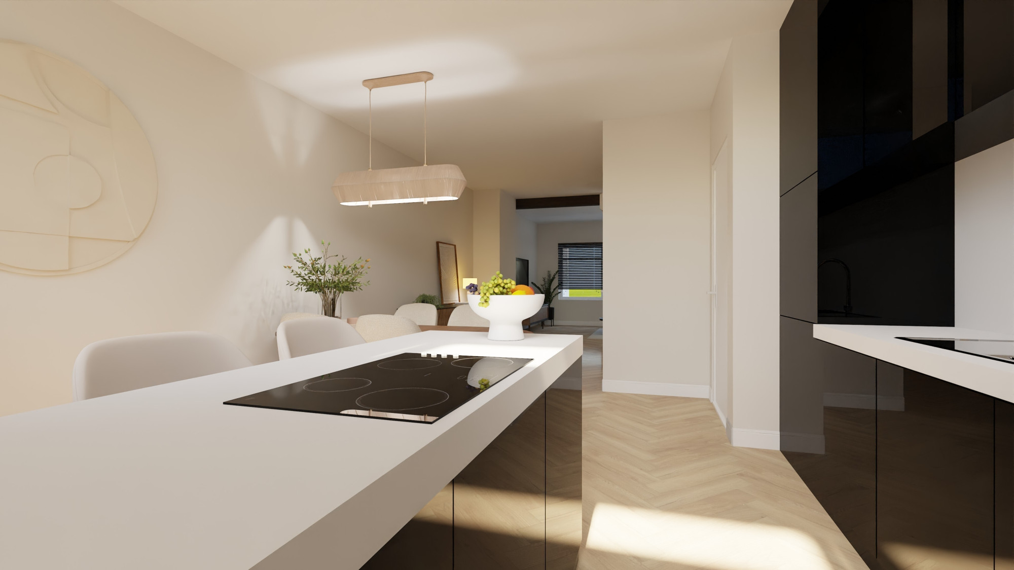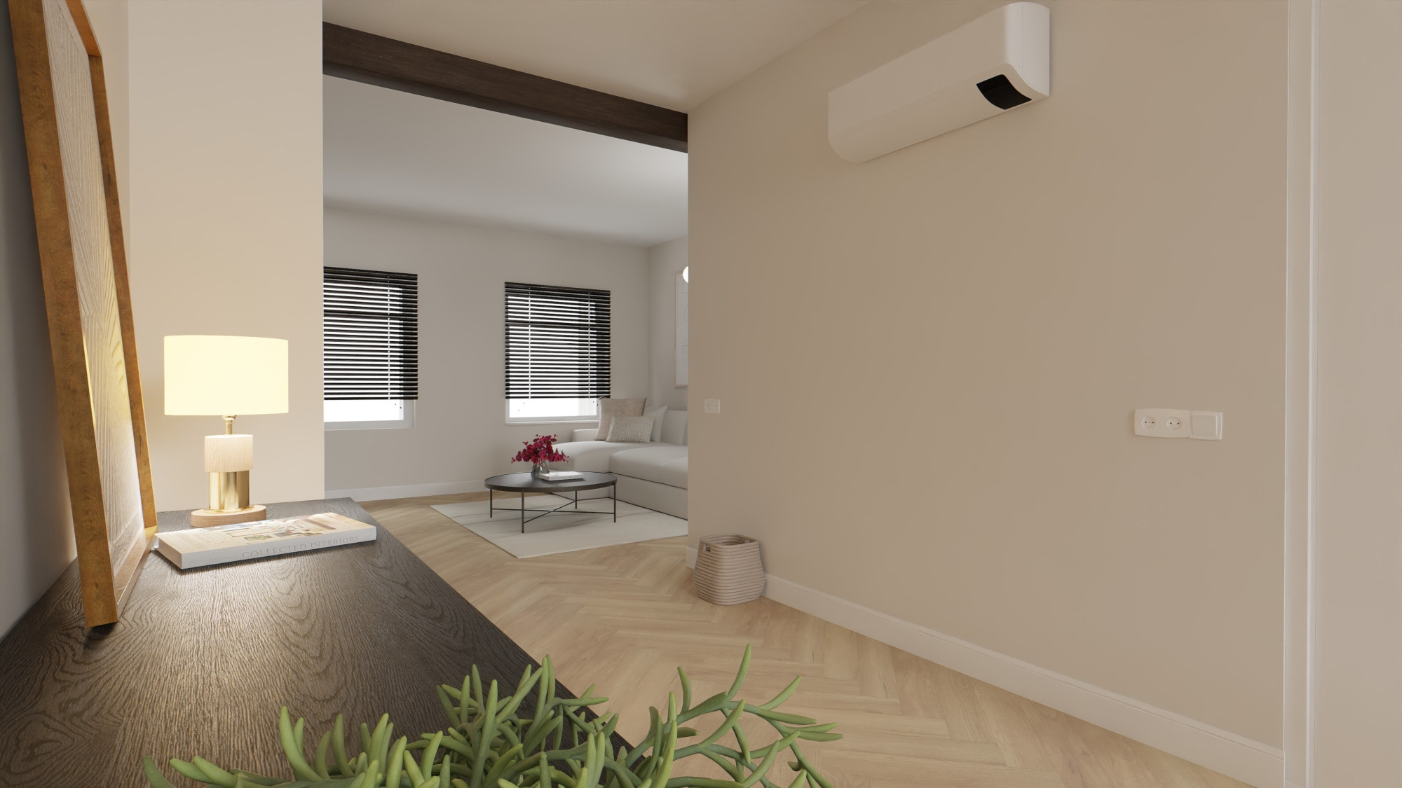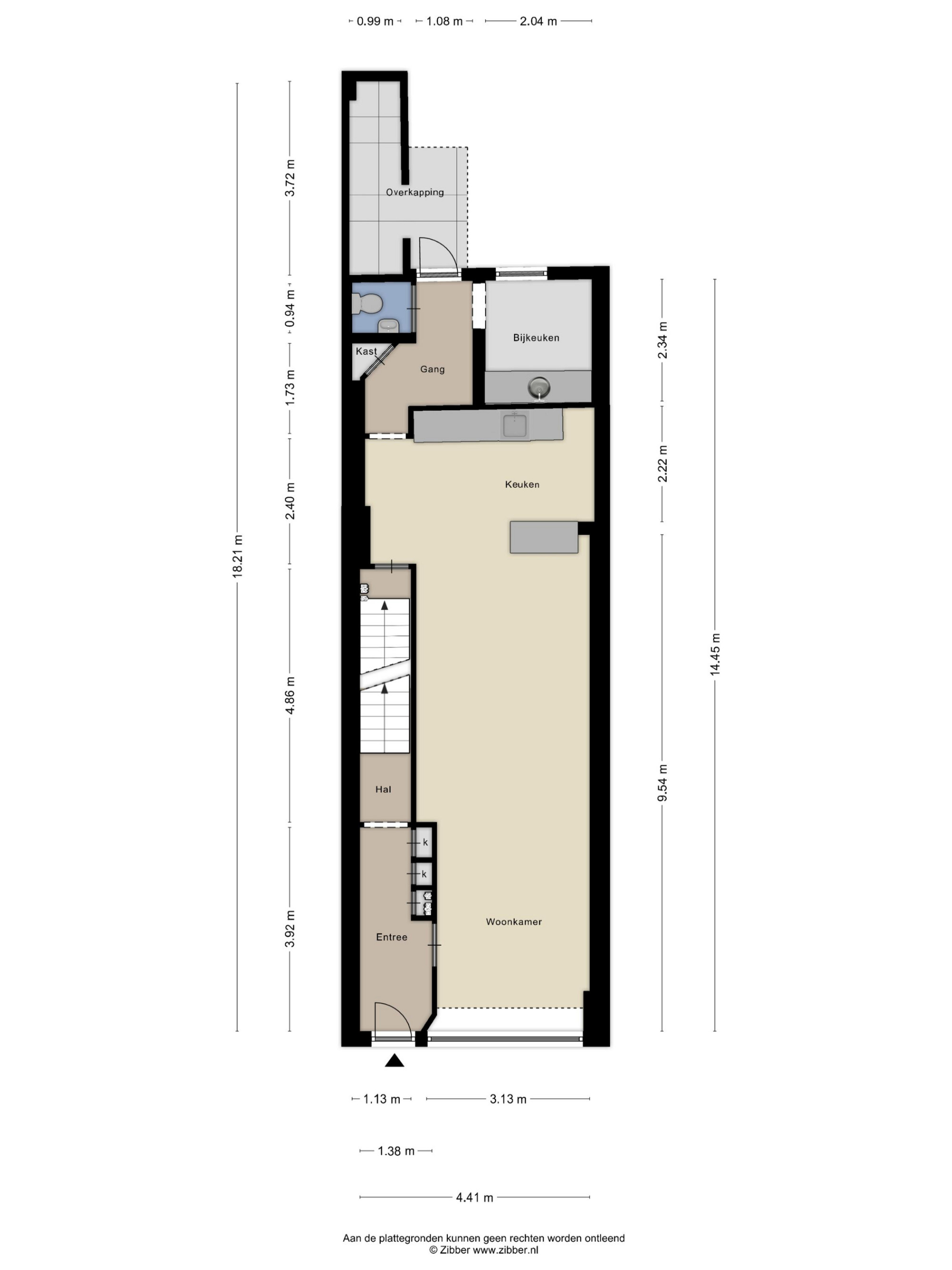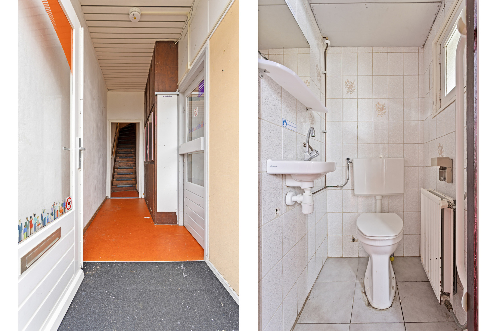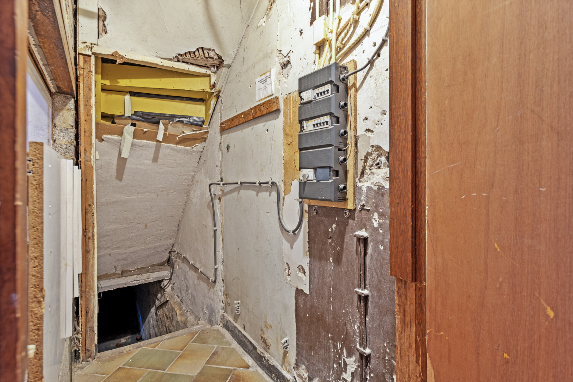 - Ontvangsthal met de meterkast, trappenhuis en toegang tot de woonkamer.