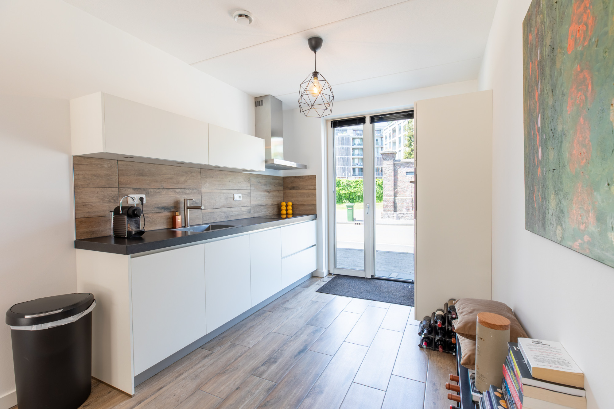 - De fraaie keukenopstelling is voorzien van composiet werkbladen, 4-pits inductie kookplaat, afzuigkap, combi magnetron/oven, vaatwasser en een koelkast.