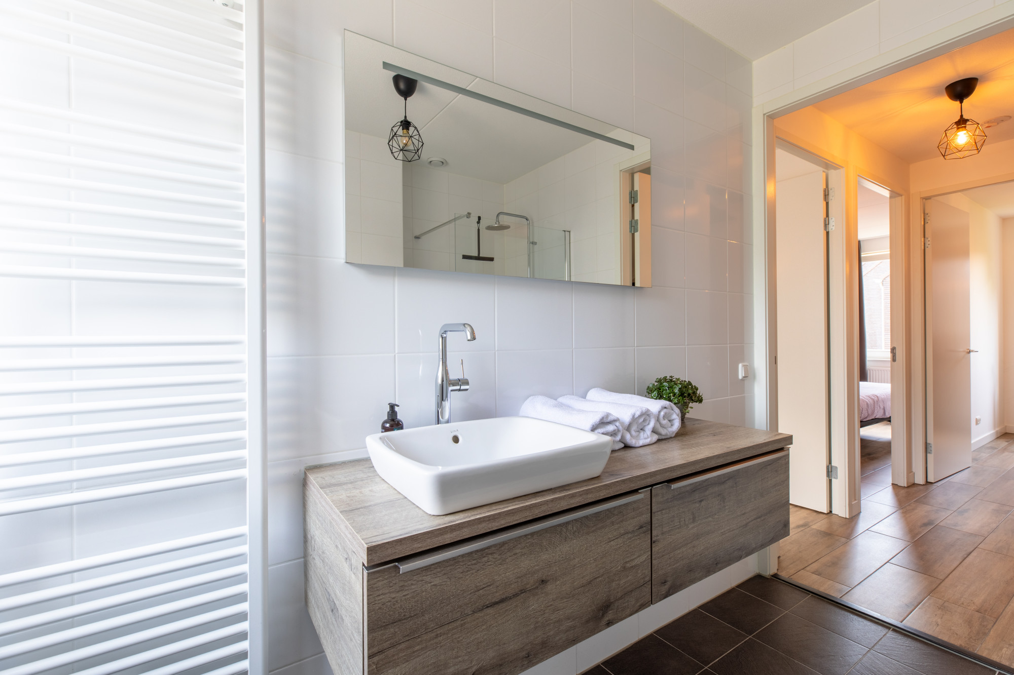- Geheel betegelde badkamer met inloopdouche, wastafelmeubel en 2e toilet.