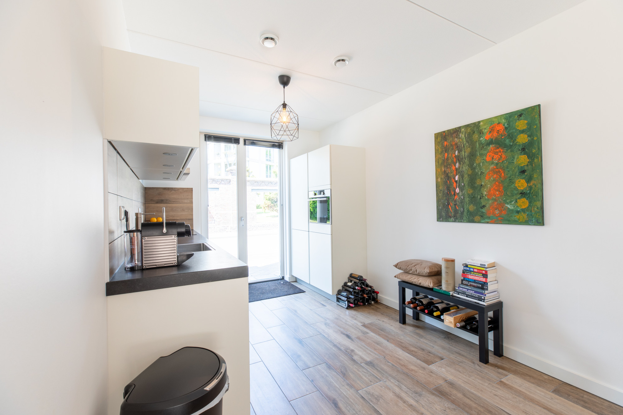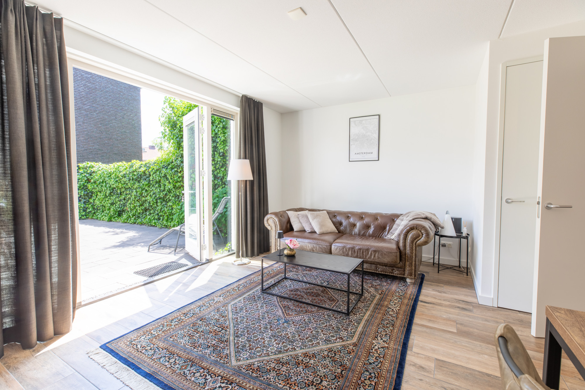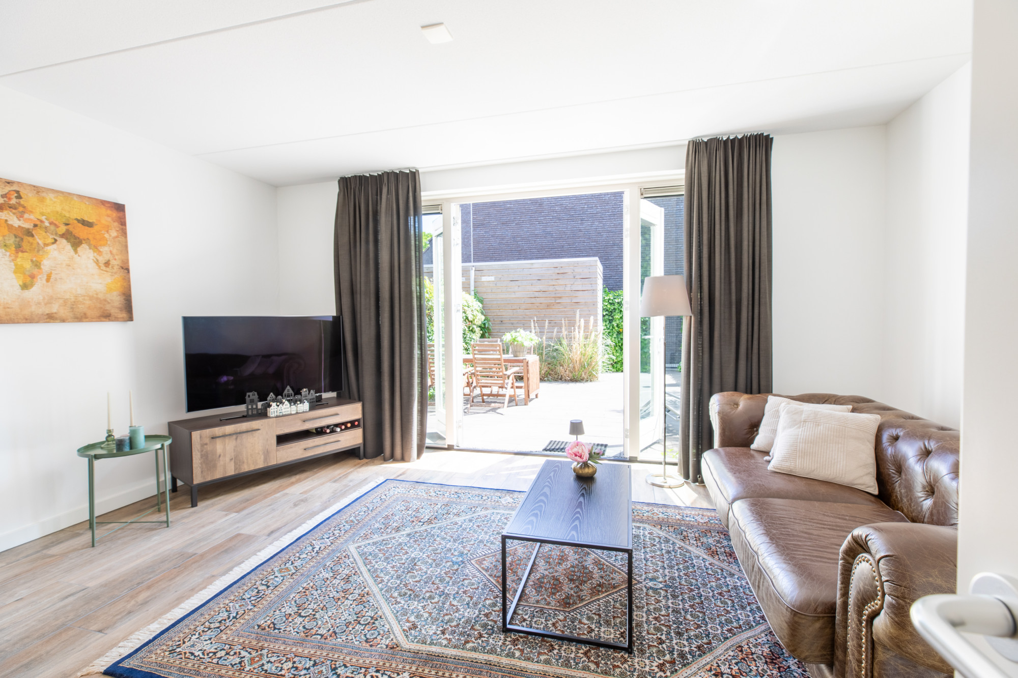 - Lichte woonkamer met muurkast en open keuken (totaal ca. 35 m²) en openslaande deuren naar de op het zuidoosten gelegen achtertuin.