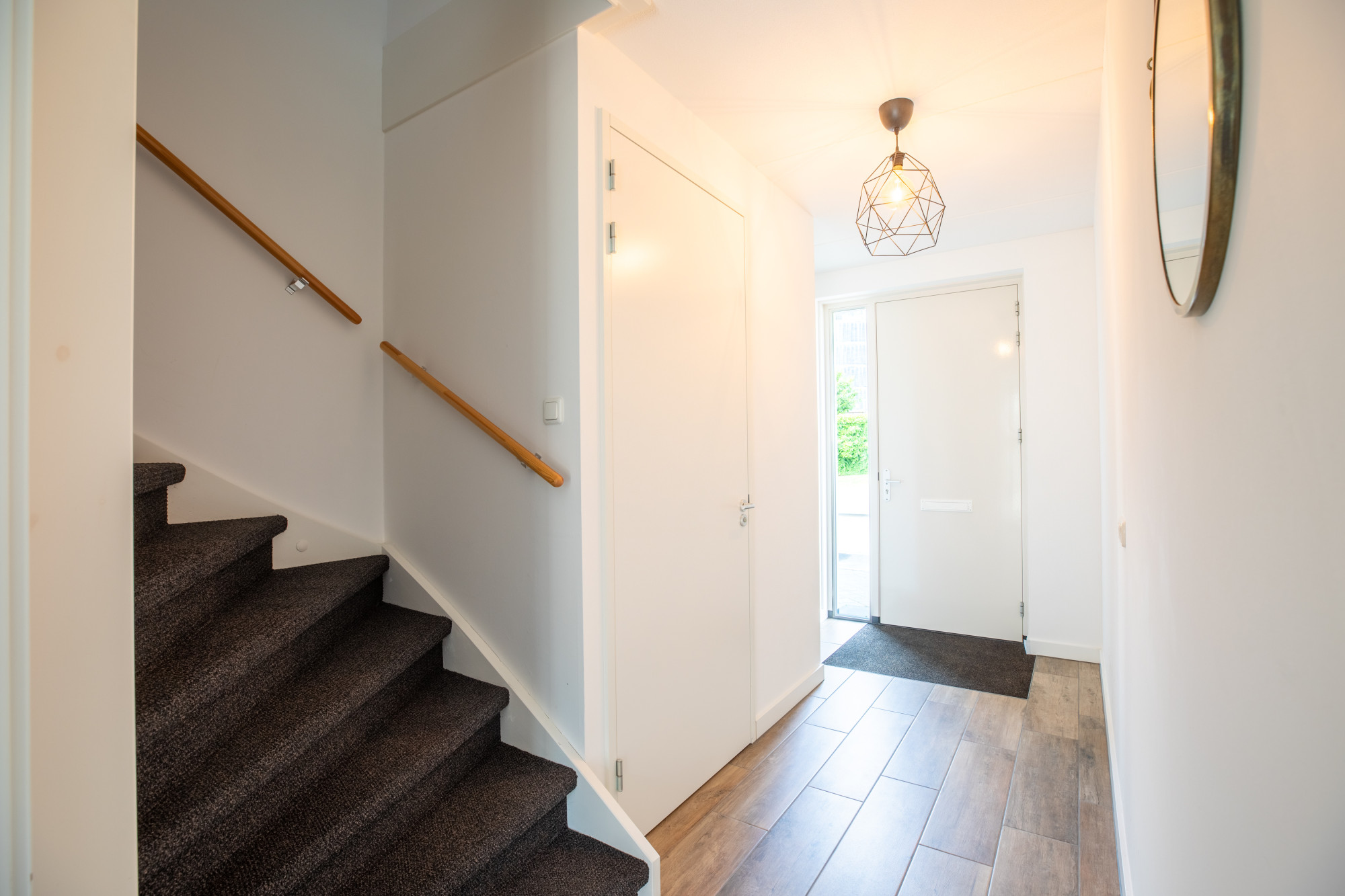 - Ontvangsthal met de meterkast, het trappenhuis en toegang tot de woonkamer.