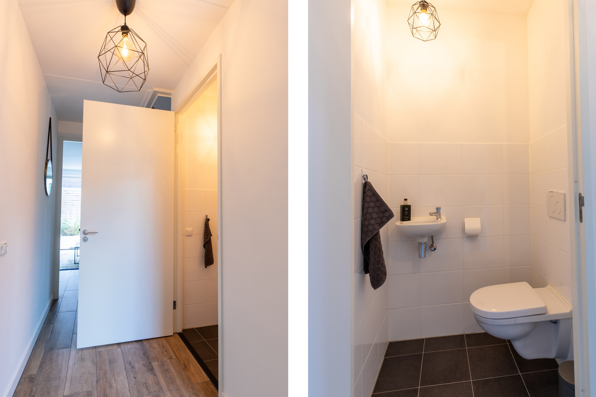 - Betegeld toilet met zwevend closet en fonteintje.
