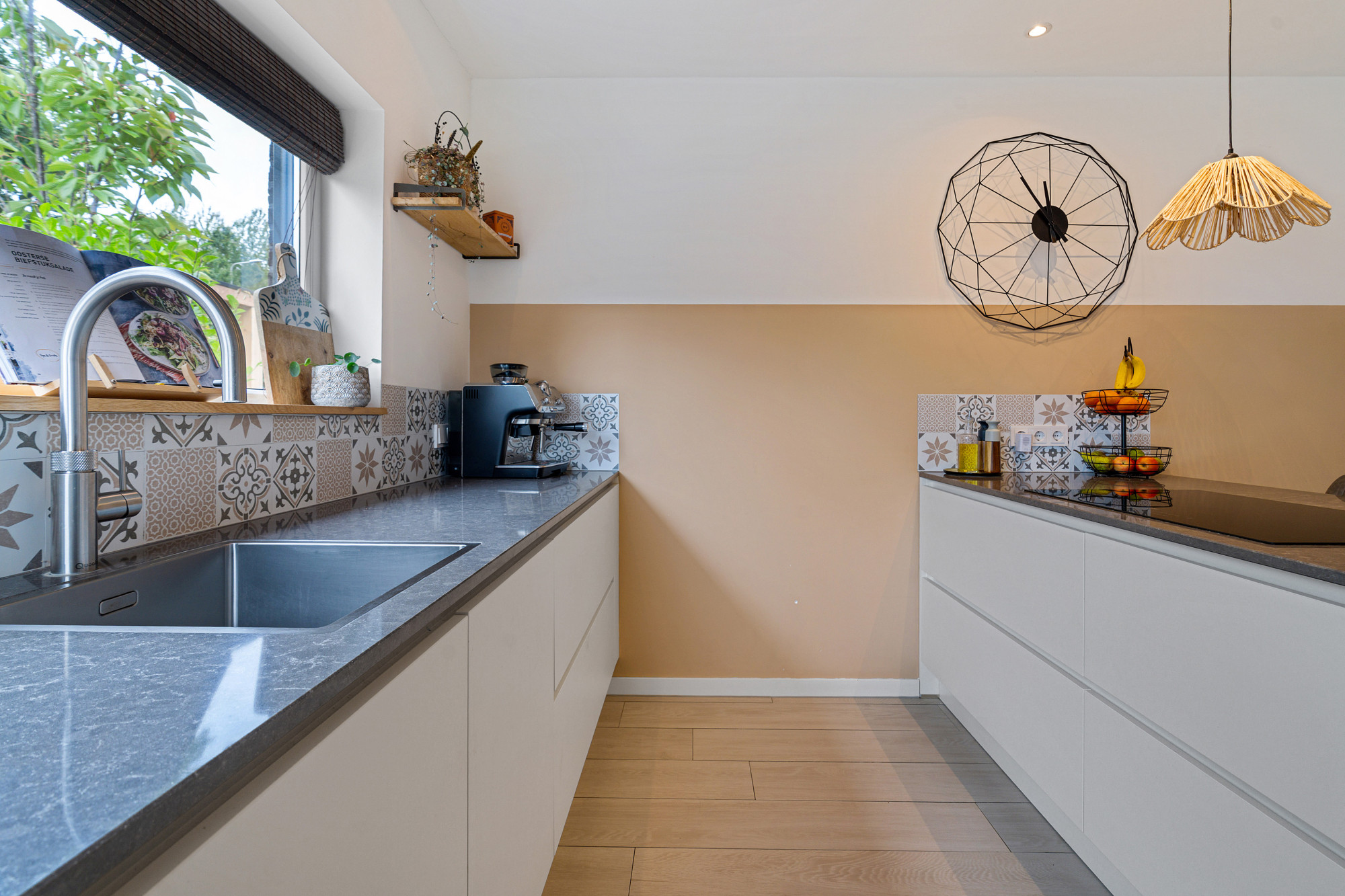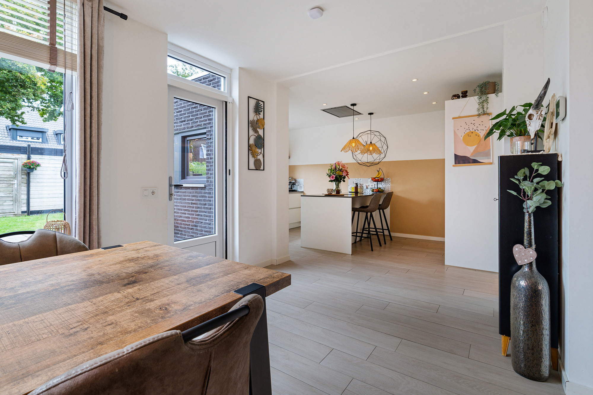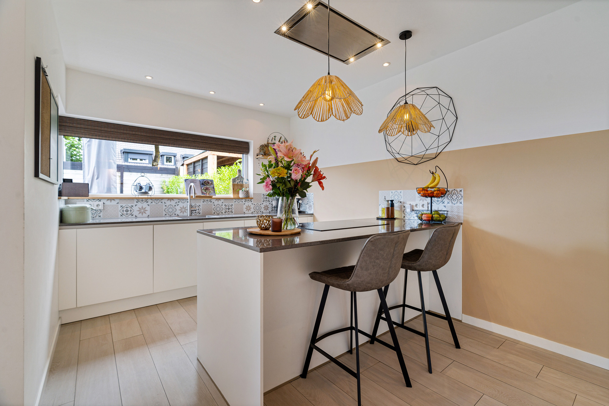 De lichte woonkamer heeft een aparte zit- en eethoek met toegang tot de tuin. In de aanbouw bevindt zich de moderne open keuken welke is voorzien van een kookeiland, 4-pits inductiekookplaat, afzuigkap, Quooker, combi-oven, vaatwasser, koelkast en diepvries. Vanuit de keuken is de praktische bijkeuken, met alle witgoedaansluitingen en bergruimte, te bereiken. De gehele begane grond is voorzien van een nette tegelvloer met vloerverwarming m.u.v. de bijkeuken. Deze heeft een nette pvc-vloer.
