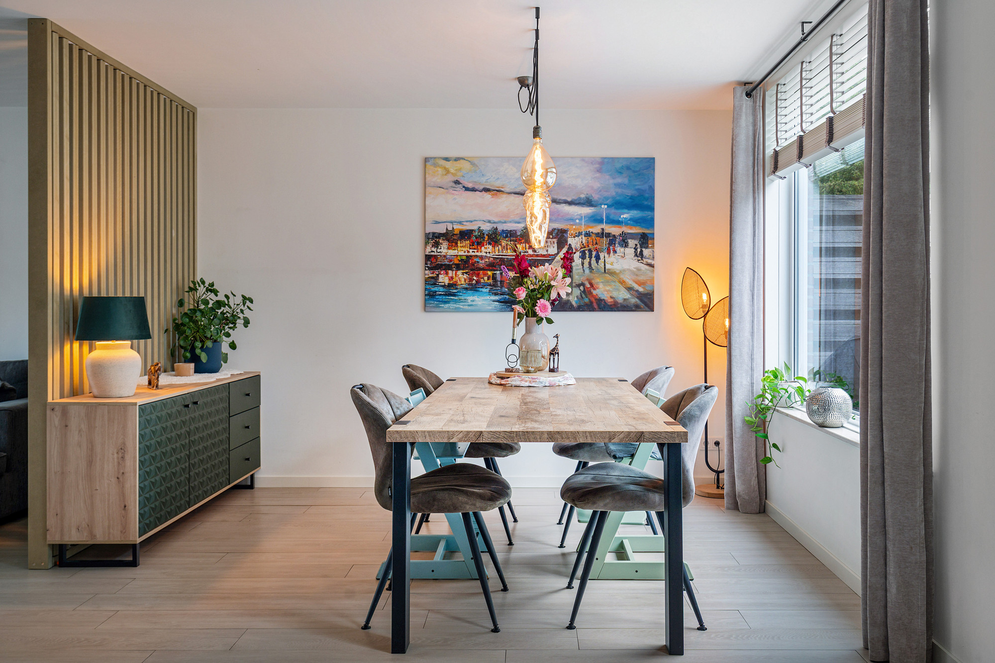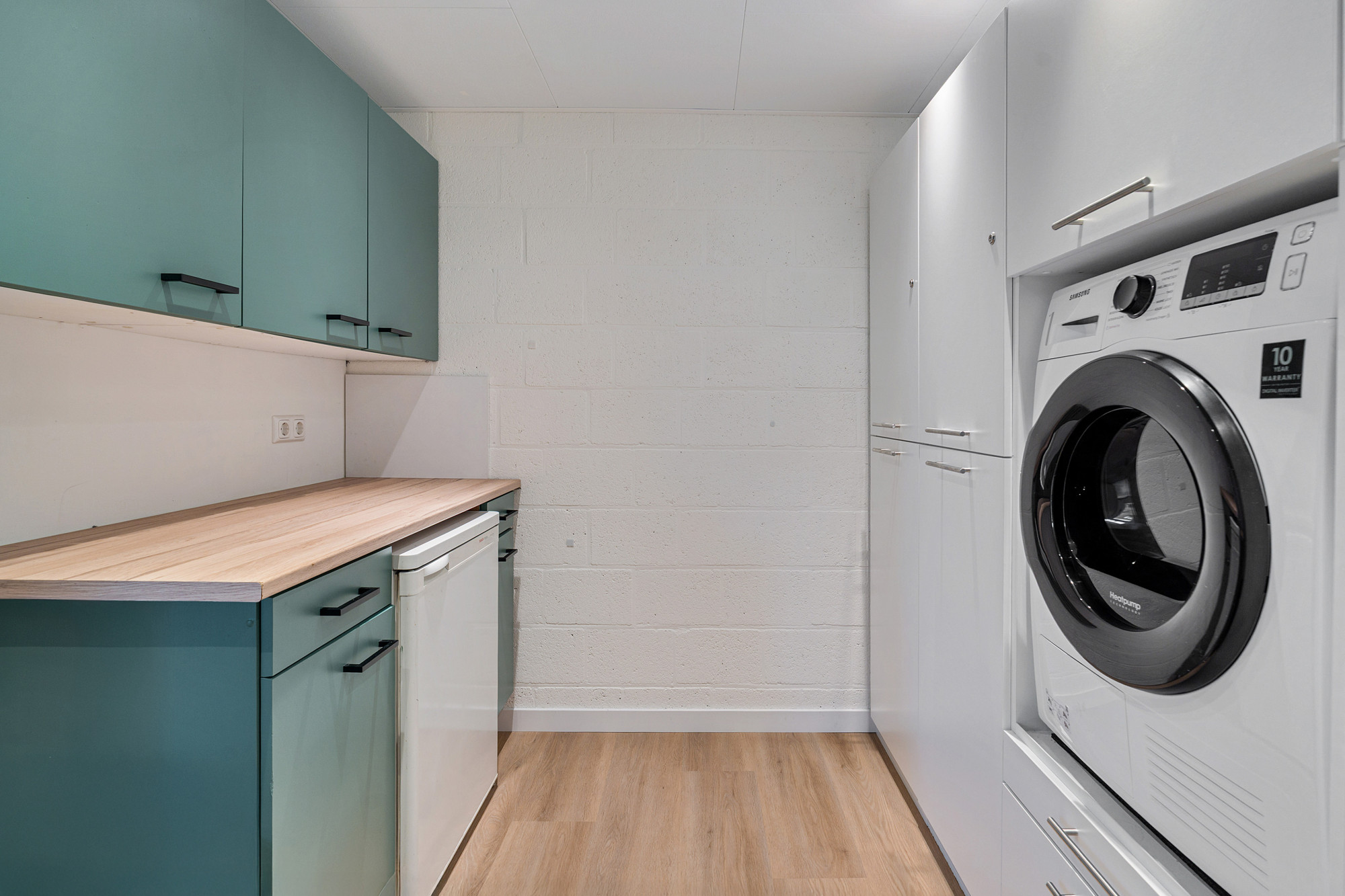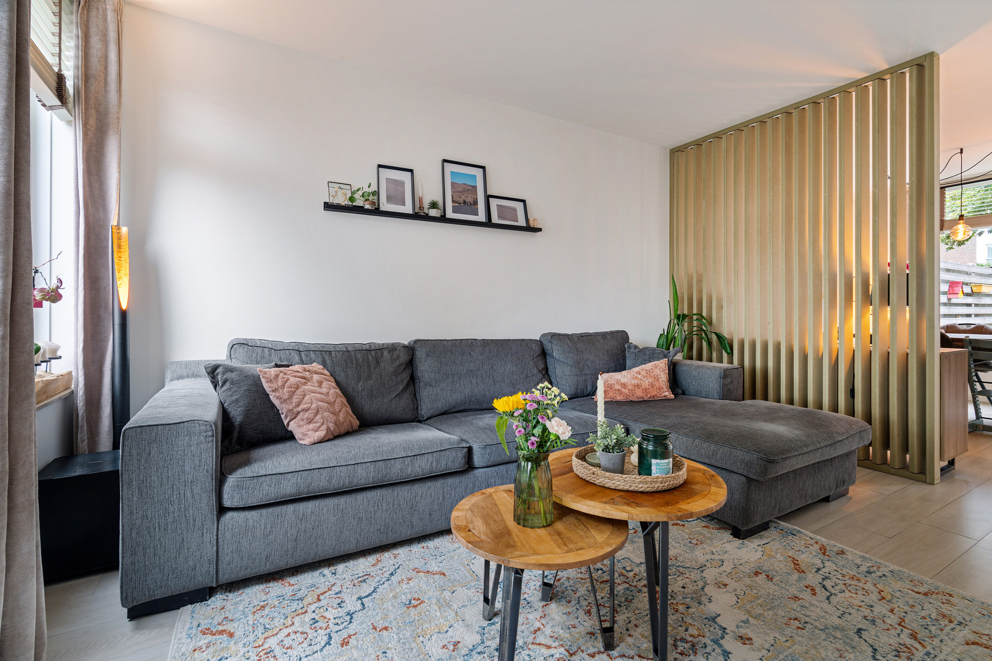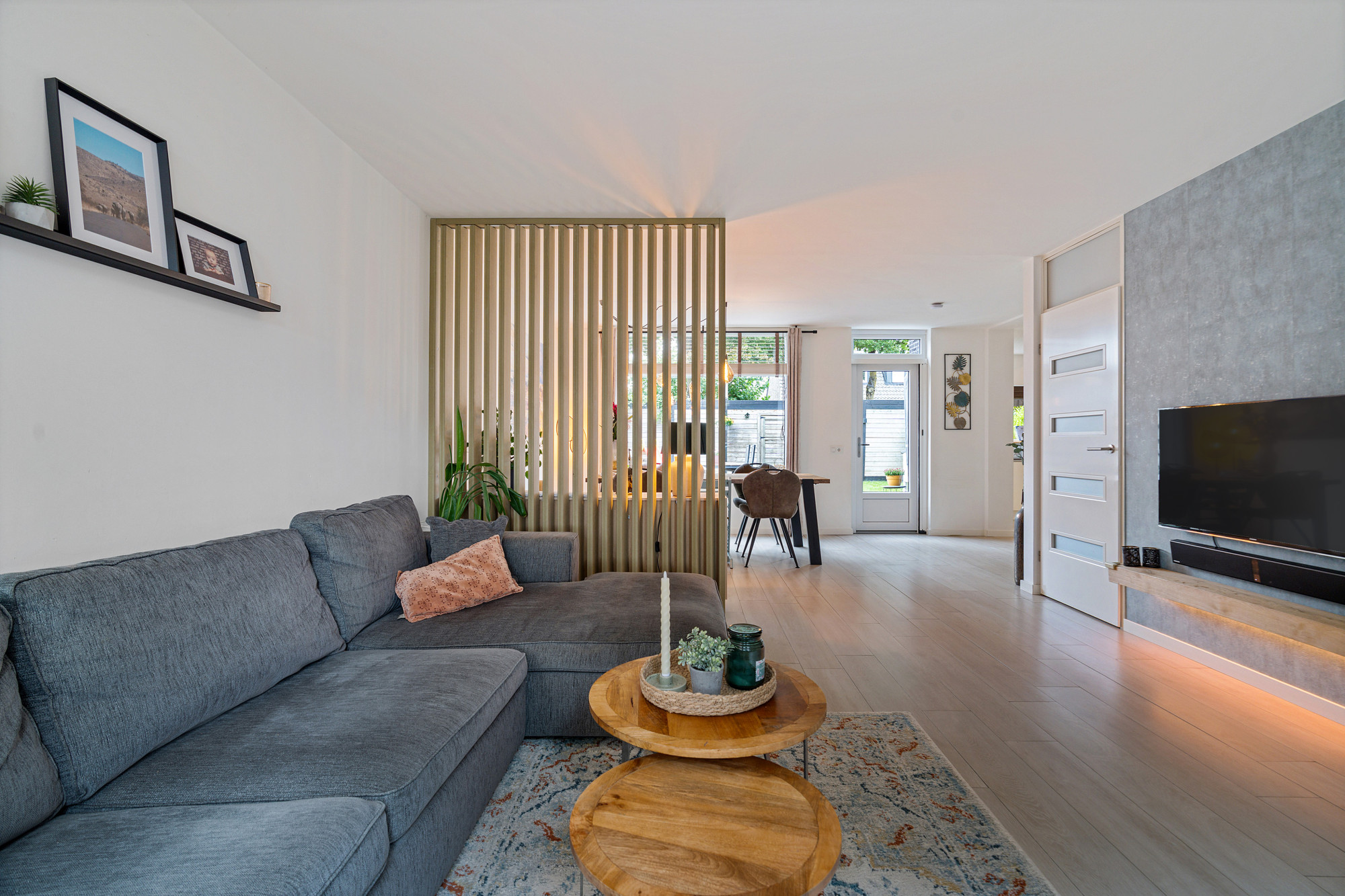 De lichte woonkamer heeft een aparte zit- en eethoek met toegang tot de tuin. In de aanbouw bevindt zich de moderne open keuken welke is voorzien van een kookeiland, 4-pits inductiekookplaat, afzuigkap, Quooker, combi-oven, vaatwasser, koelkast en diepvries. Vanuit de keuken is de praktische bijkeuken, met alle witgoedaansluitingen en bergruimte, te bereiken. De gehele begane grond is voorzien van een nette tegelvloer met vloerverwarming m.u.v. de bijkeuken. Deze heeft een nette pvc-vloer.