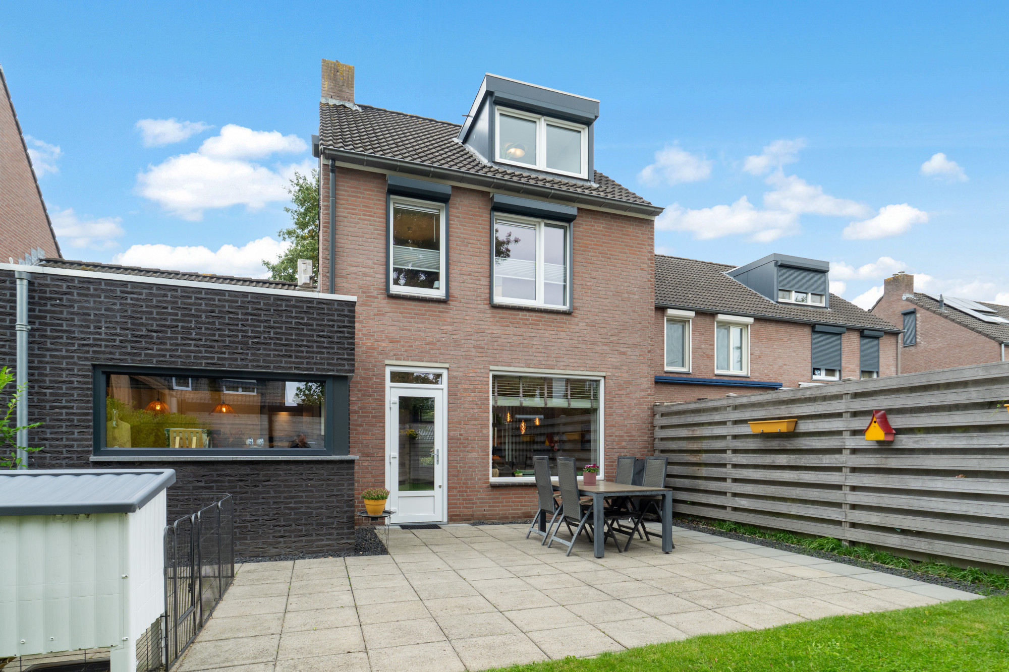 De achtertuin is ingericht met een terras, gazon en achteringang.