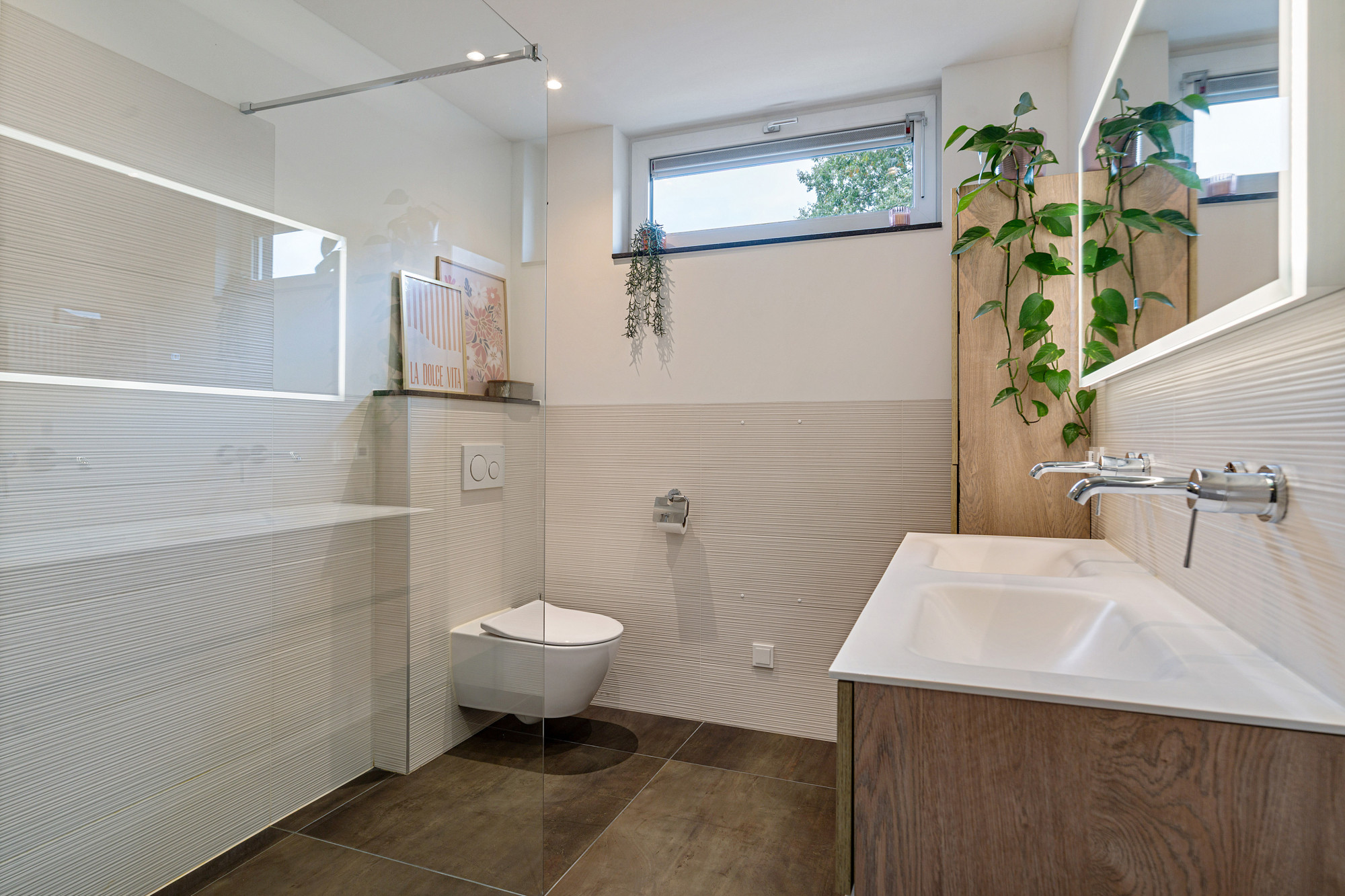 De badkamer is compleet uitgevoerd met een inloopdouche, toilet, dubbele wastafel met meubel en elektrische vloerverwarming.