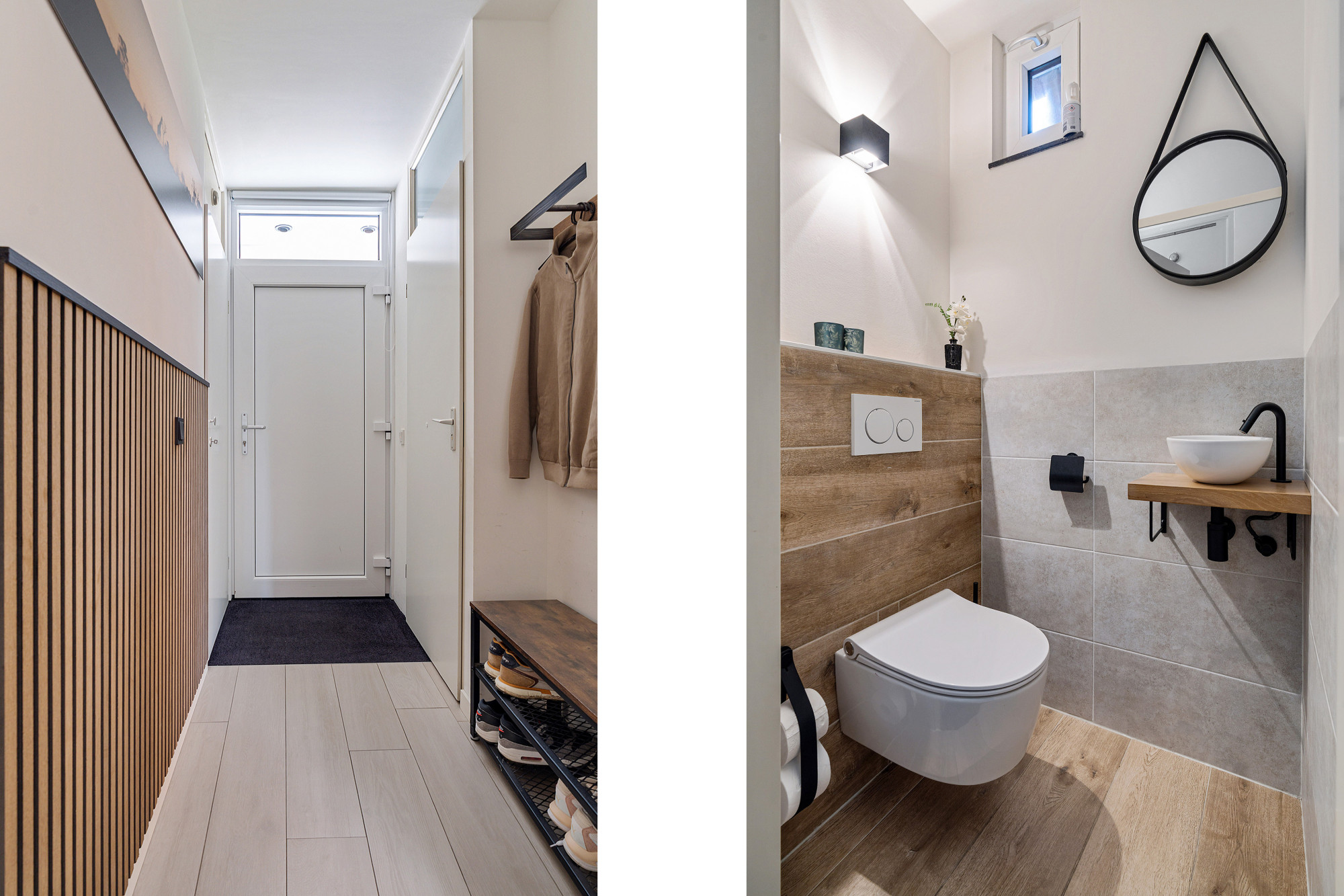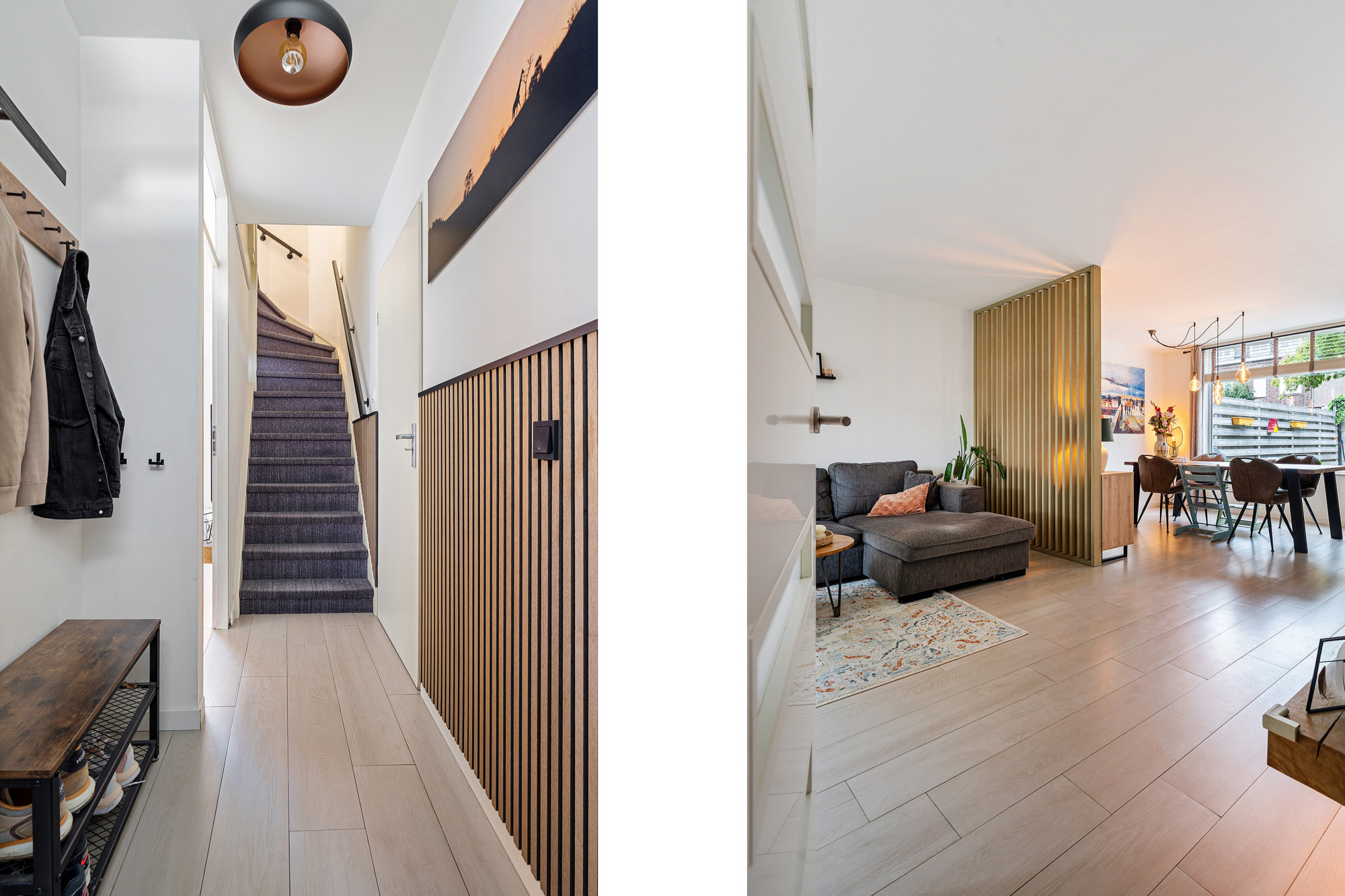 Via de overdekte entree kom je binnen in de hal met toegang tot de meterkast, het toilet met elektrische vloerverwarming, de trap naar de eerste verdieping, de woonkamer en garage/berging met vliering en elektrische sectionaalpoort.