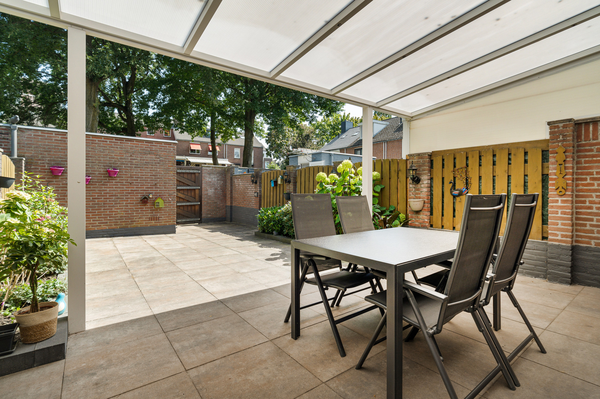 - Volledig betegelde achtertuin met overkapping, berging en achterom;