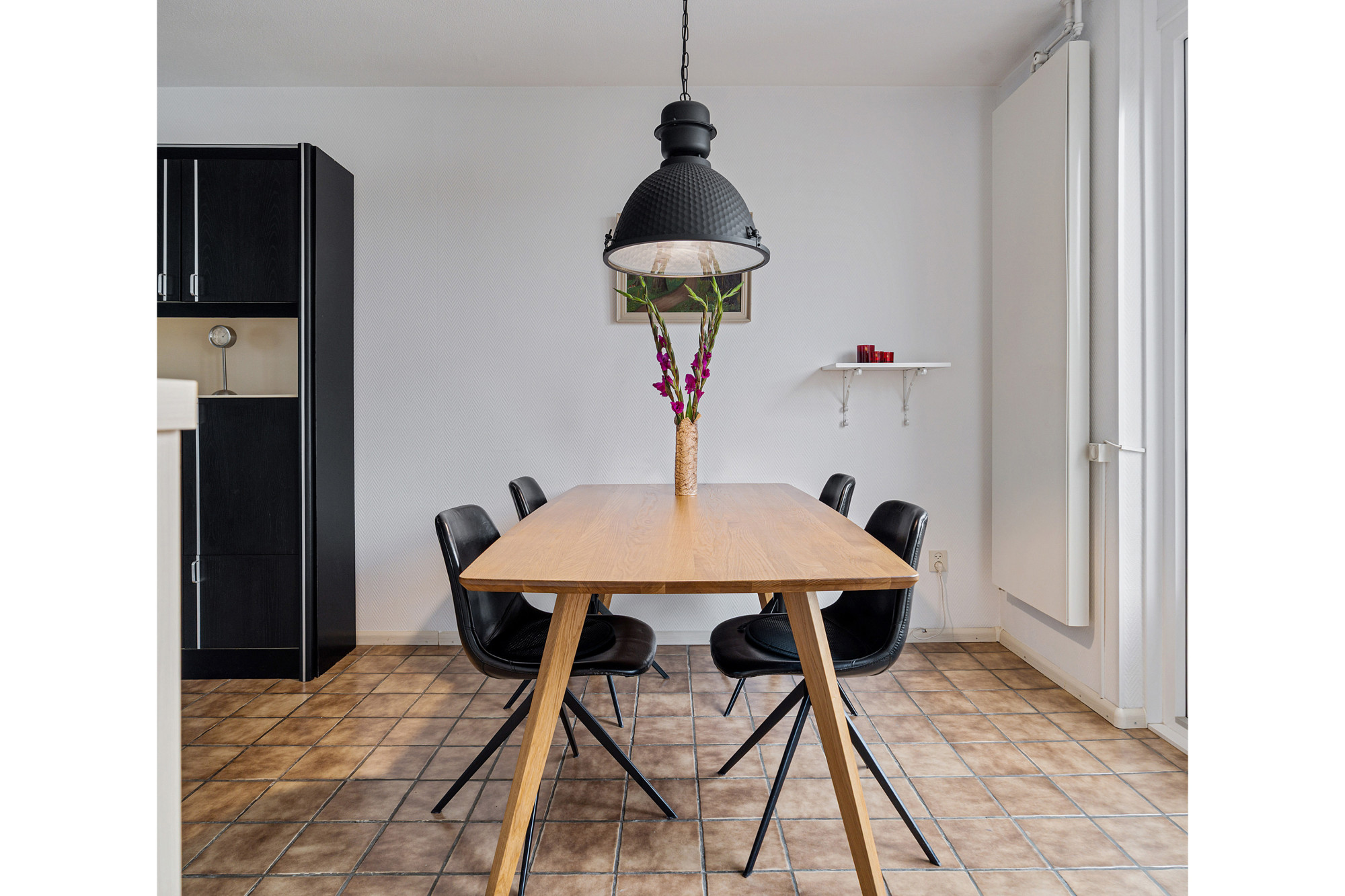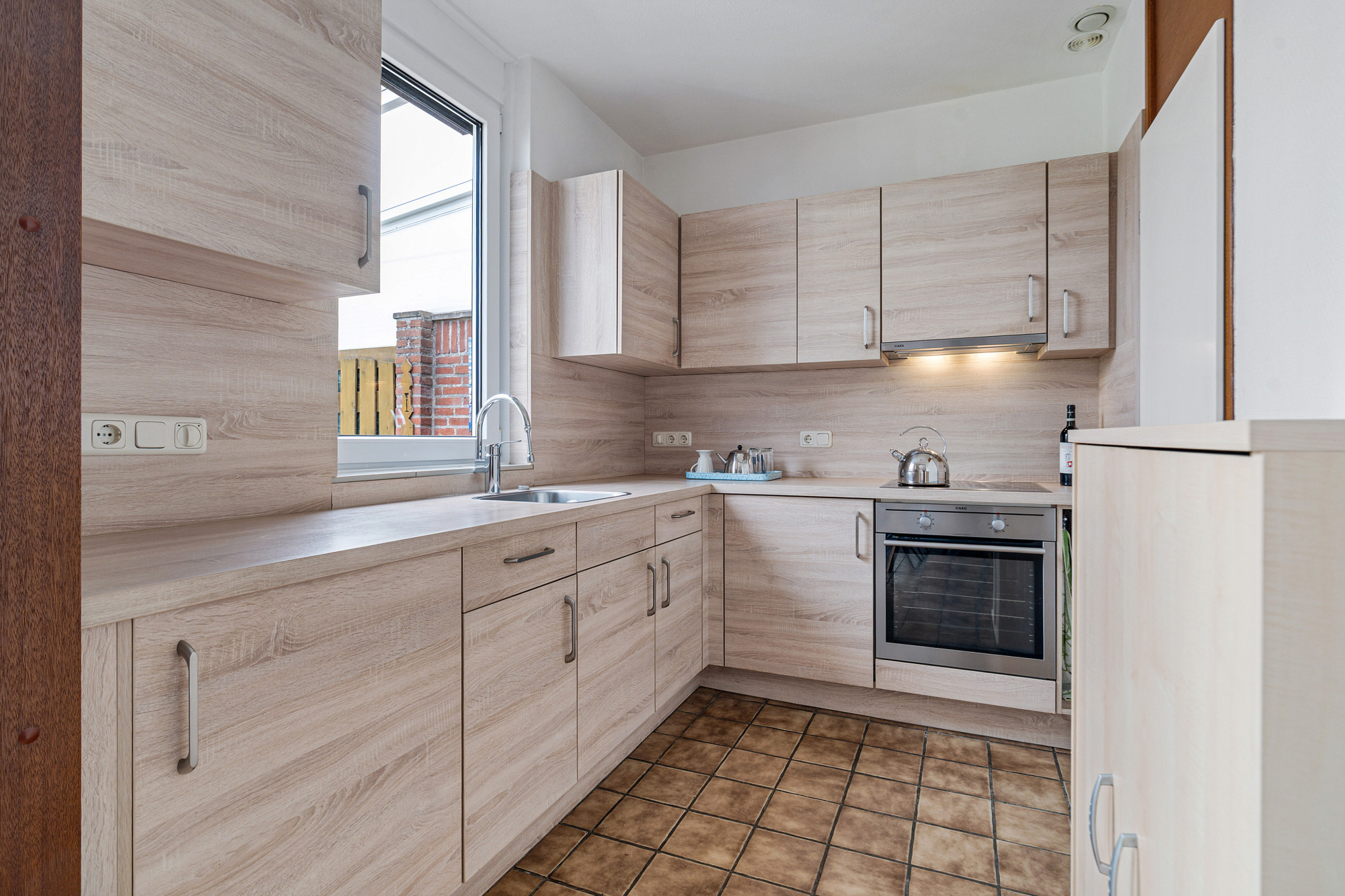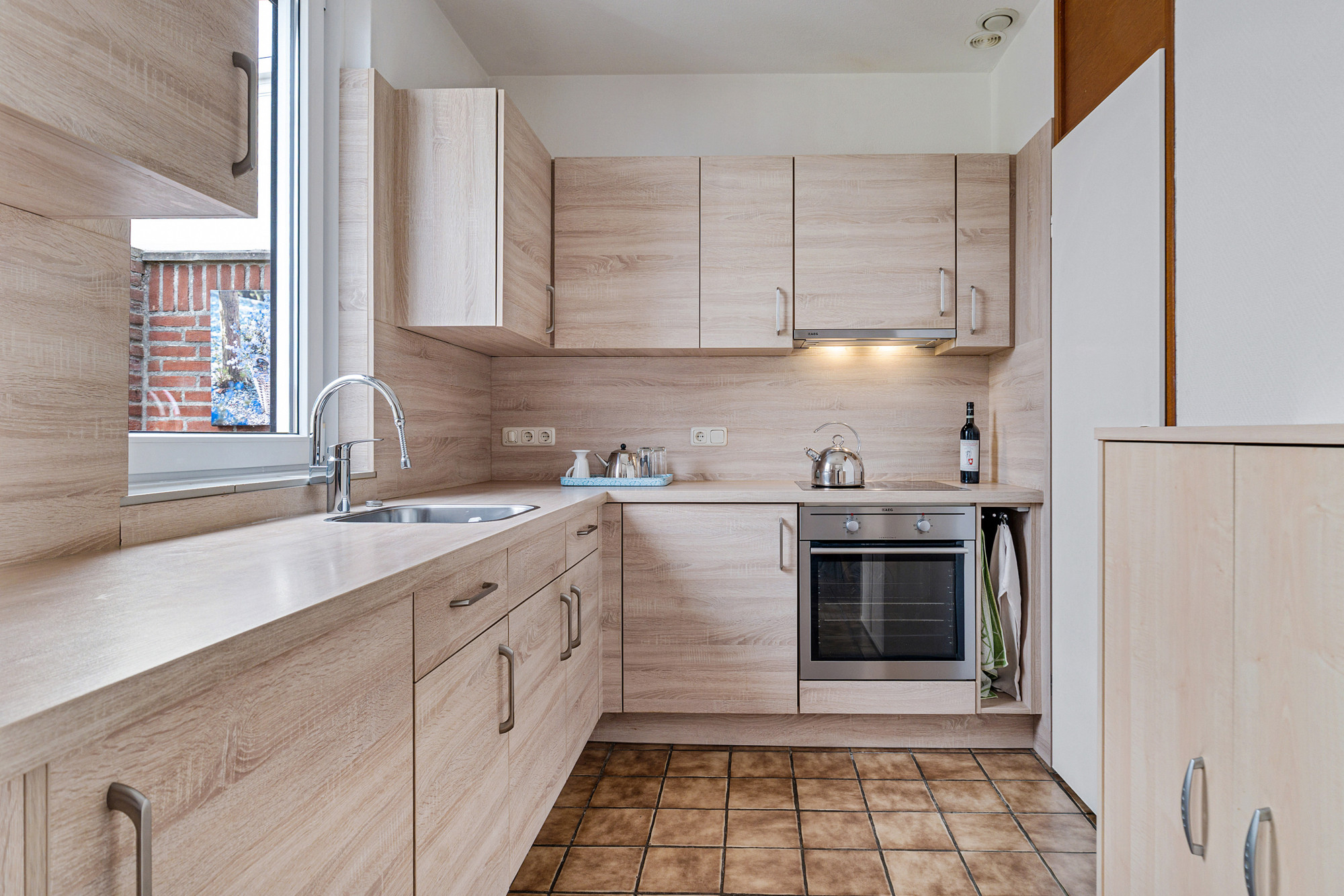 De keuken sluit aan op de woonkamer en is praktisch ingericht met oven, afzuigkap, spoelbak, boven- en onderkasten én een handige trapkast.
