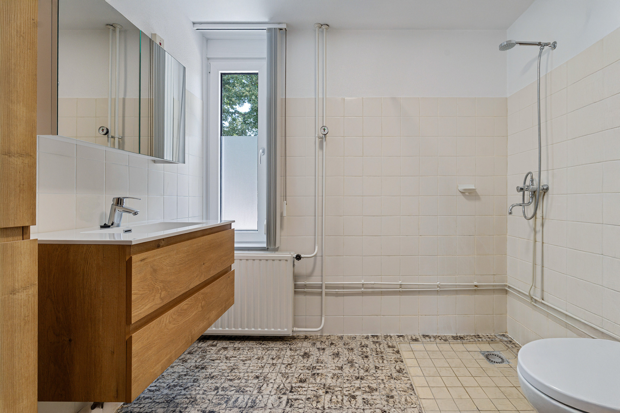 Op de eerste verdieping bereikt u via de overloop drie ruime slaapkamers, een kast en de badkamer. De slaapkamers zijn licht en comfortabel, geschikt voor kinderen, werk of logees. De badkamer is voorzien van een inloopdouche, wastafel met meubel en toilet. Via een deur op de overloop is de trap naar de zolder bereikbaar.