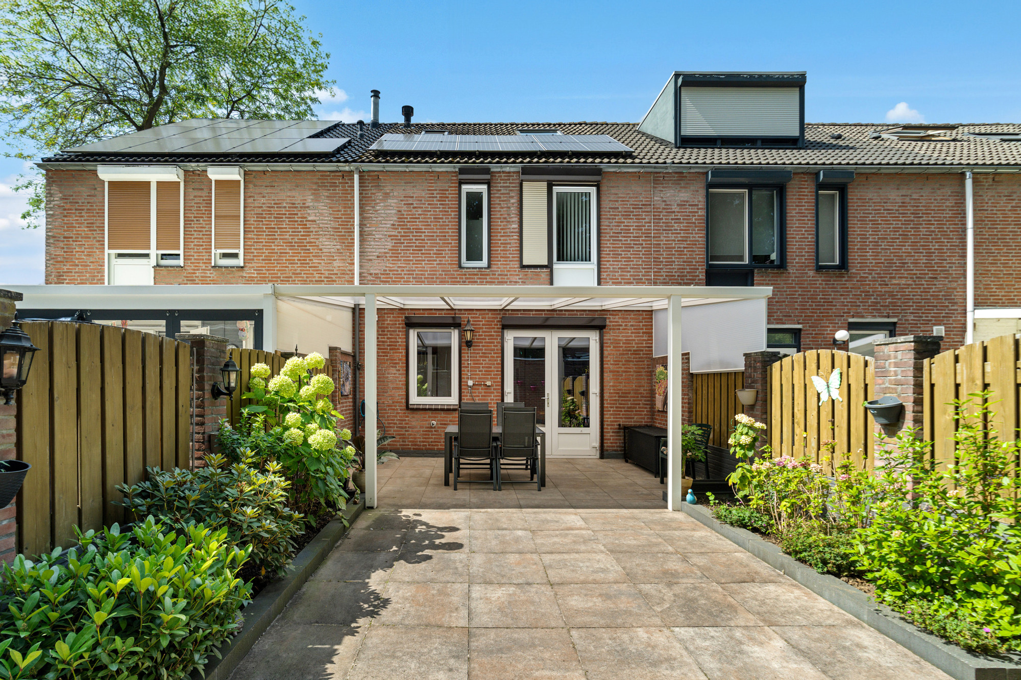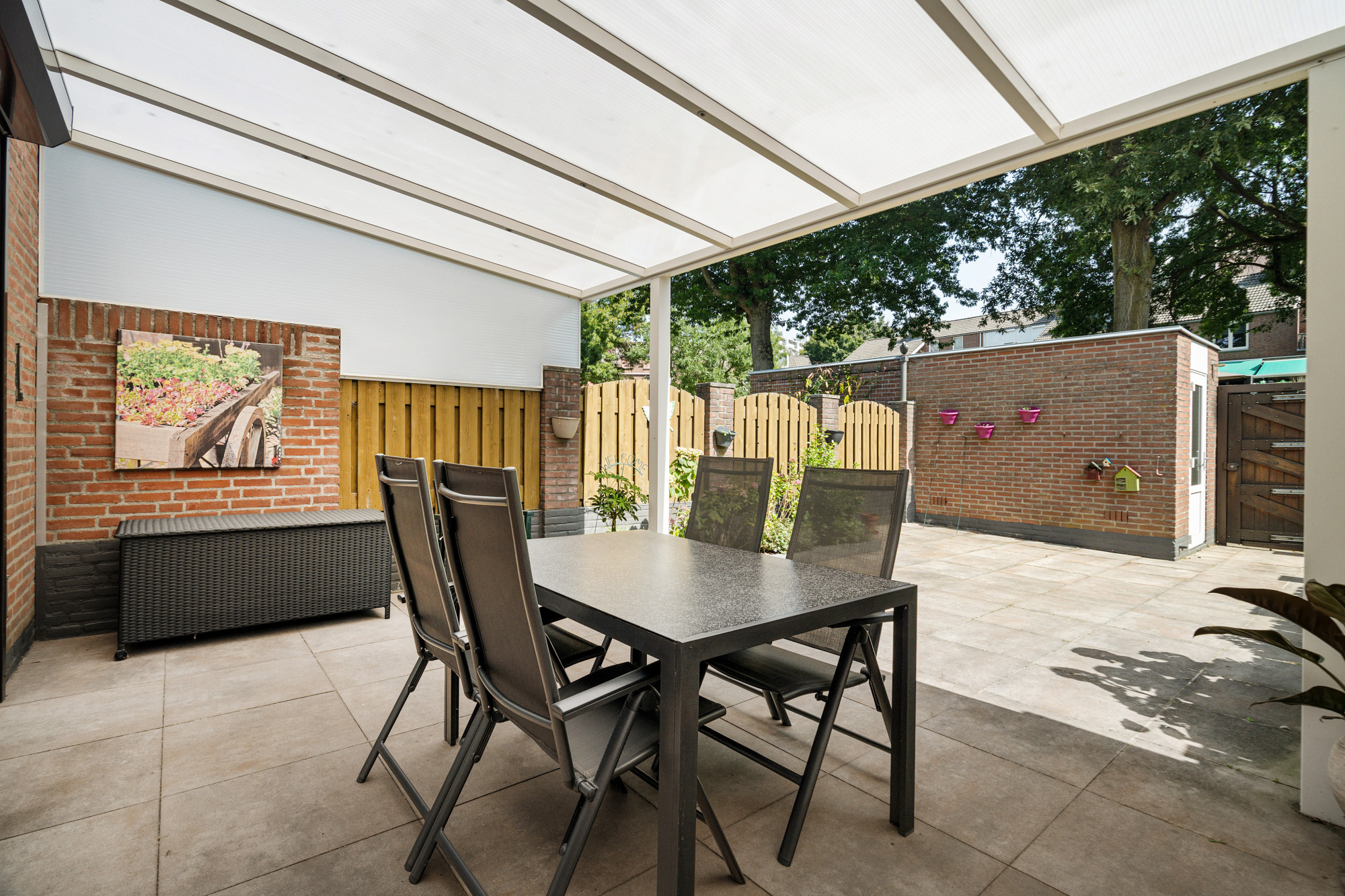 De achtertuin is volledig betegeld, onderhoudsvriendelijk en voorzien van bloemperken aan de zijkanten. U komt de tuin binnen onder de overkapping, waardoor u altijd een beschutte plek heeft om te ontspannen. De tuin is volledig omsloten door een houten schutting en biedt veel privacy. Via een achterom is de tuin eveneens bereikbaar.