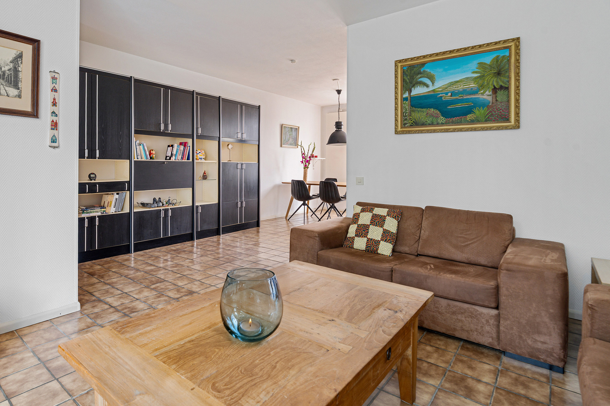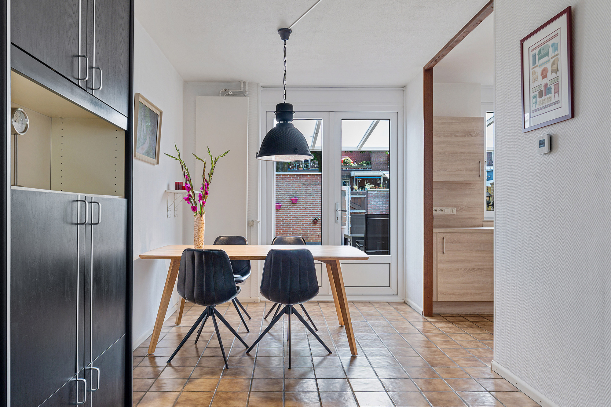 De woonkamer is licht en loopt van voor tot achter, met voldoende ruimte voor een zit- en eethoek. Vanuit het eetgedeelte leiden twee glazen deuren direct naar de tuin, waardoor er een fijne verbinding ontstaat tussen binnen en buiten.