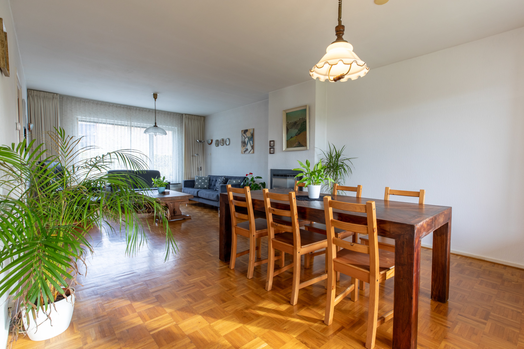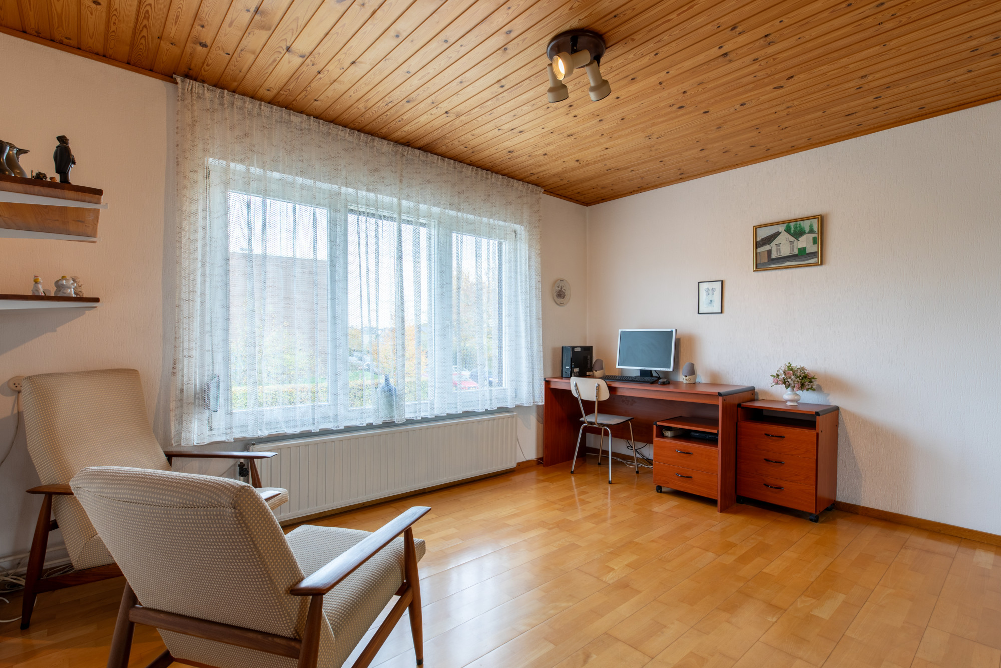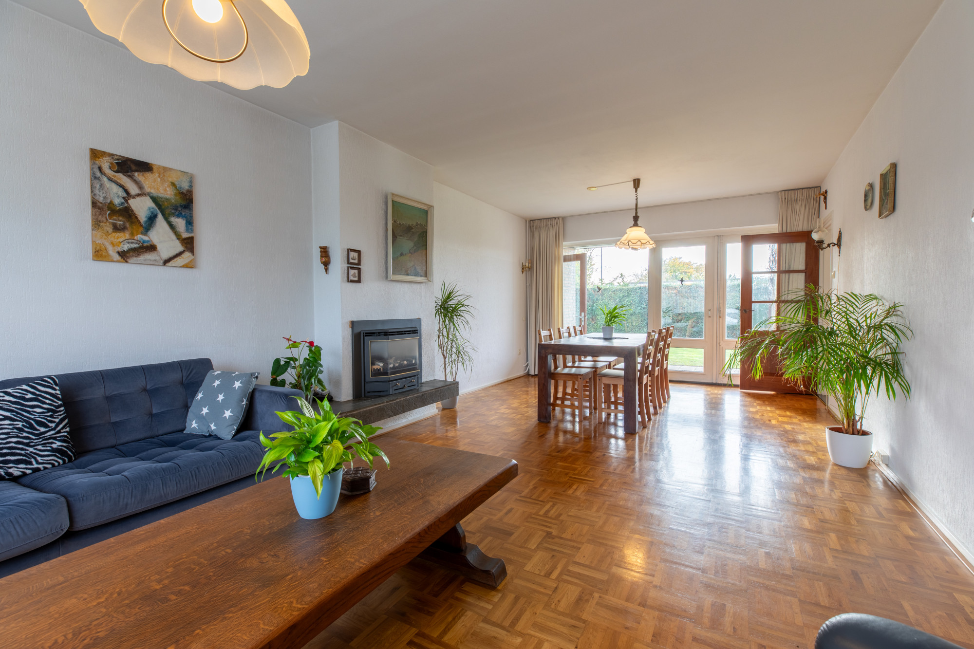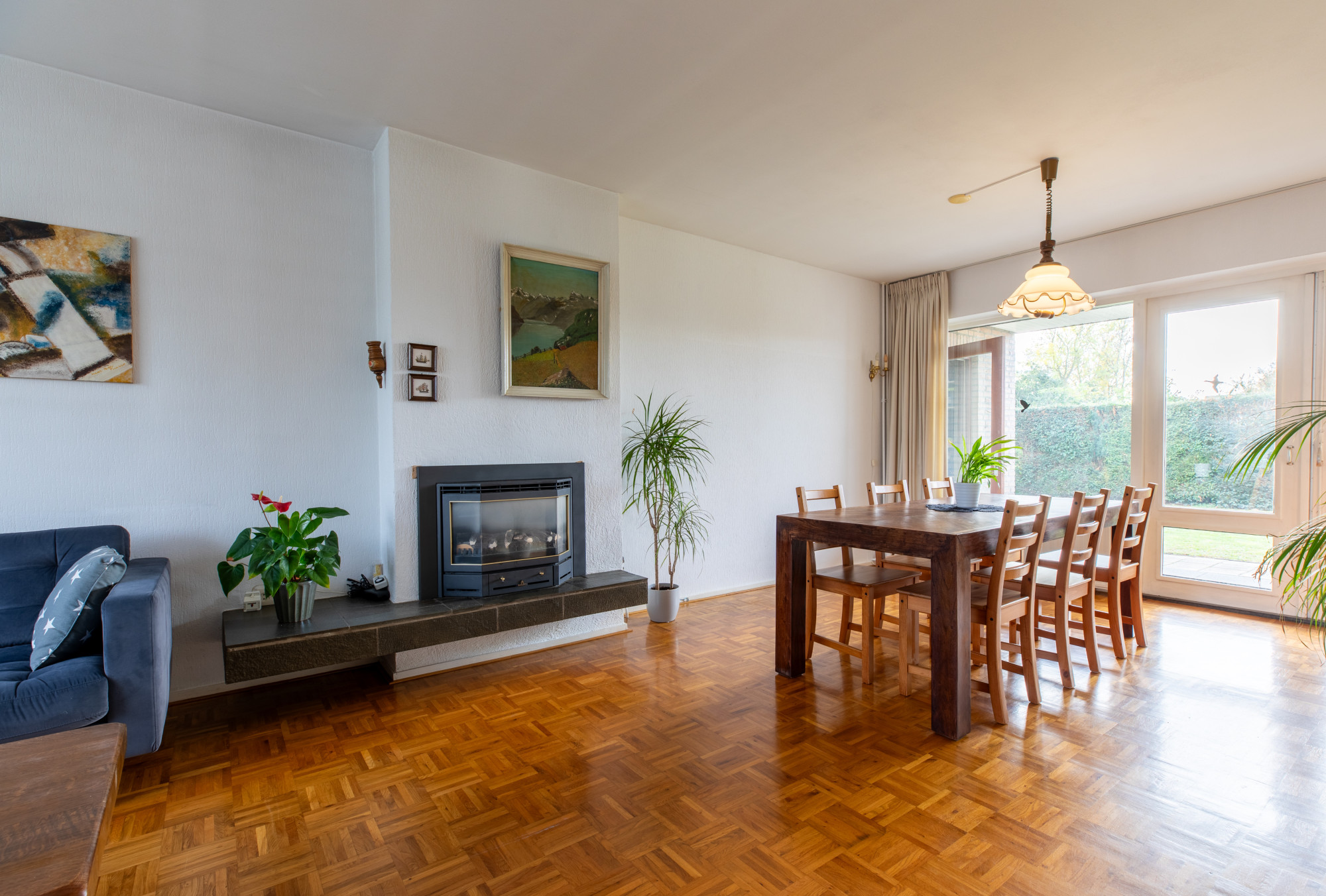 - Doorzon woonkamer van ca. 31 m² met parketvloer, gashaard en openslaande deuren naar de achtertuin.