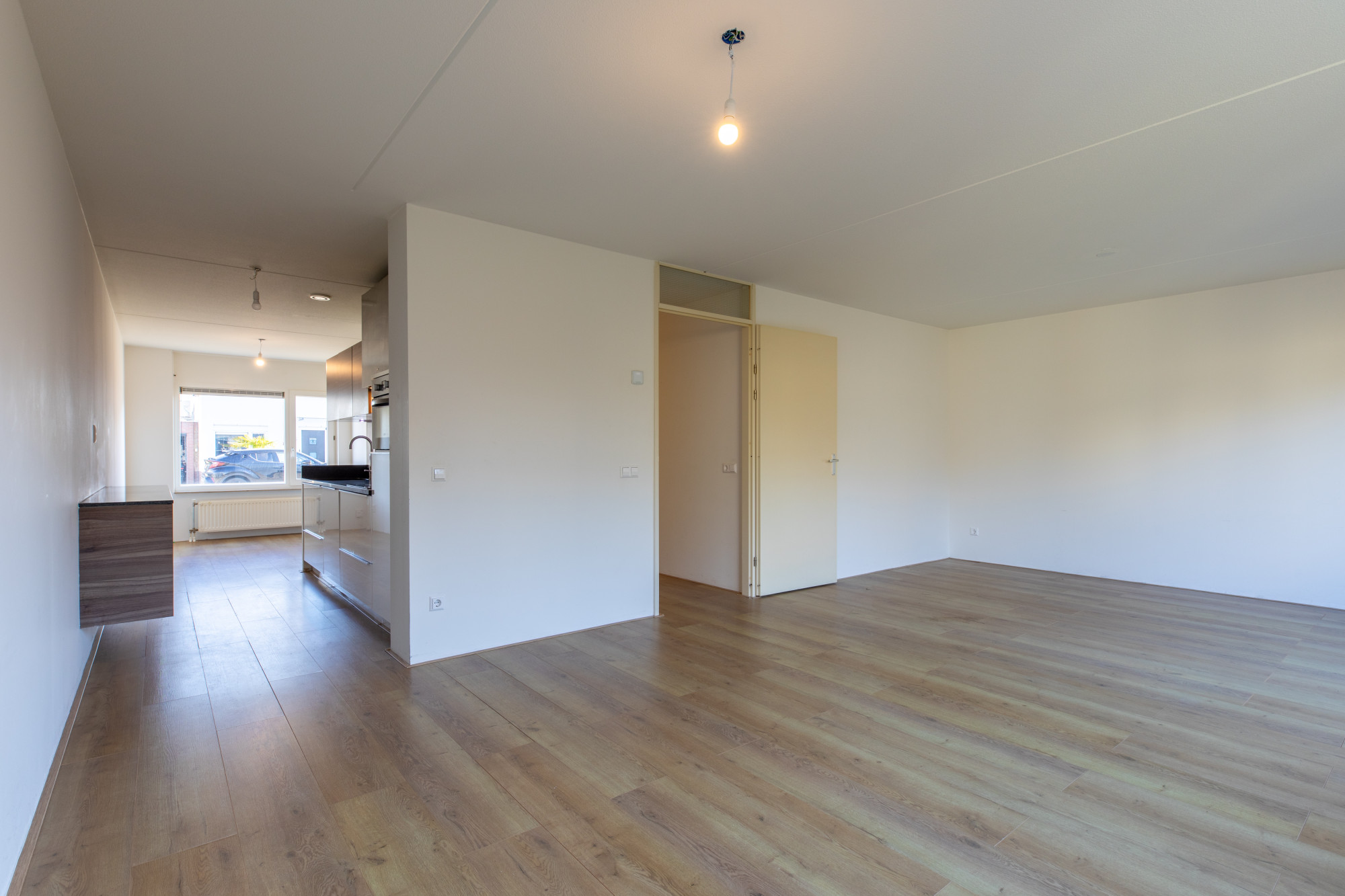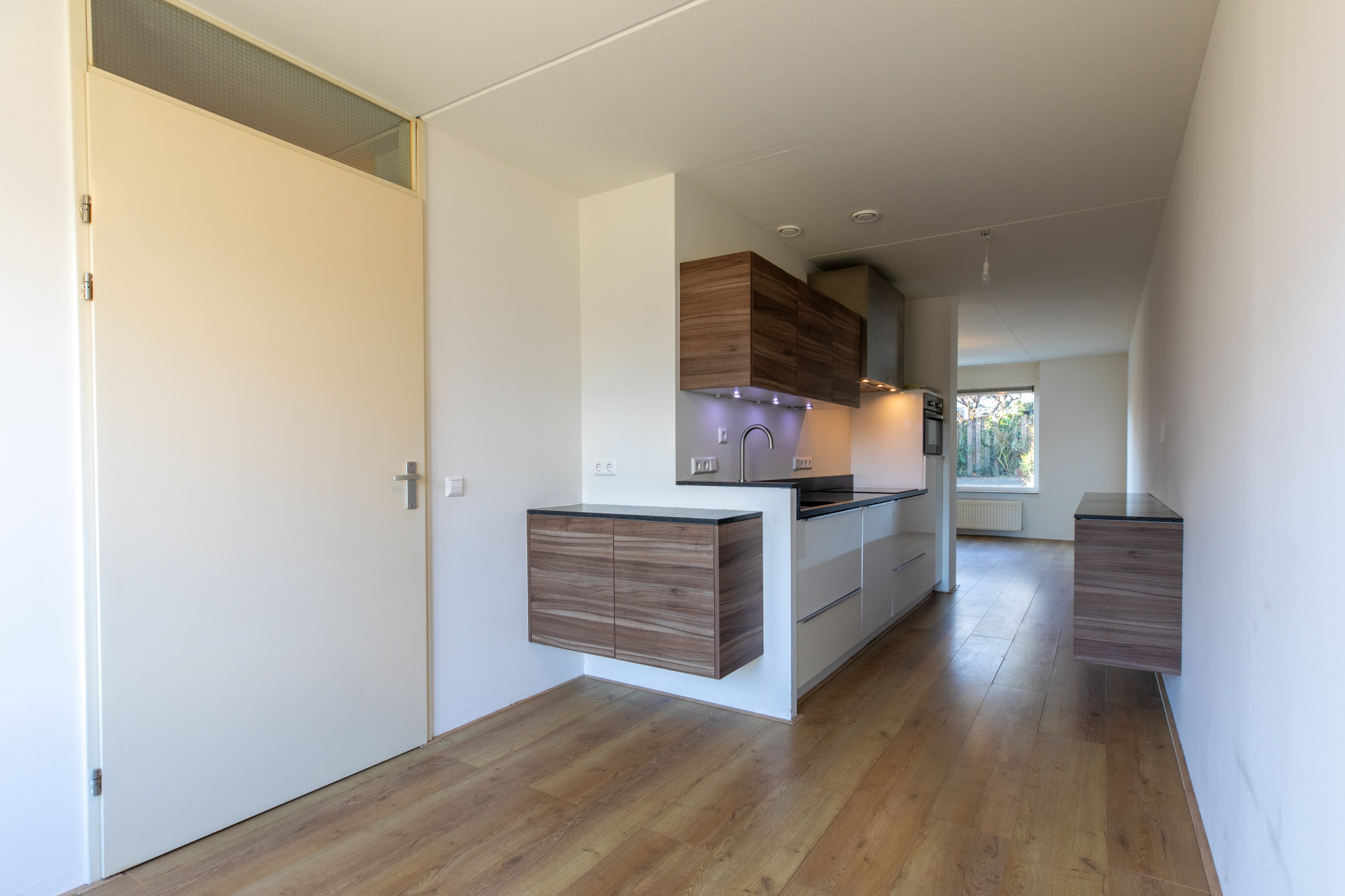 - Ruime woonkamer met open keuken en openslaande deuren naar de achtertuin. De keurige keuken is voorzien van diverse inbouwapparatuur.