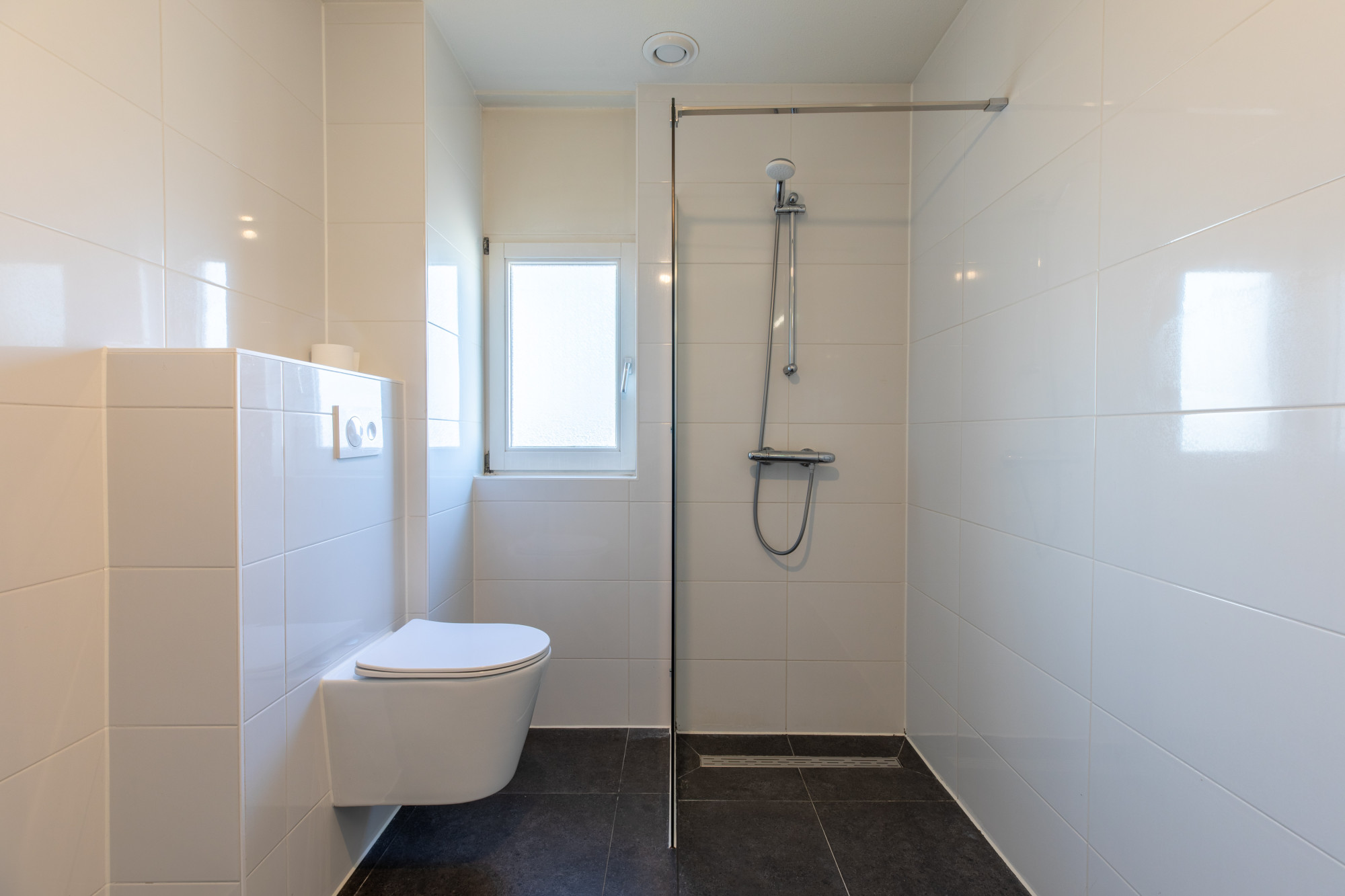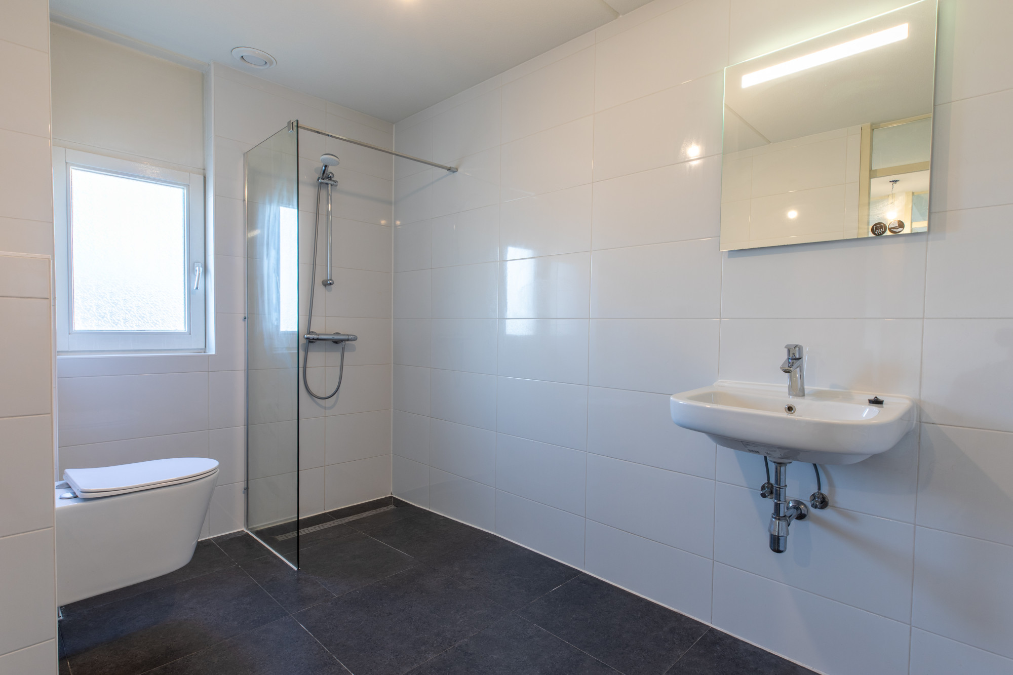 - Geheel betegelde badkamer voorzien van inloopdouche, wastafel en wandcloset.