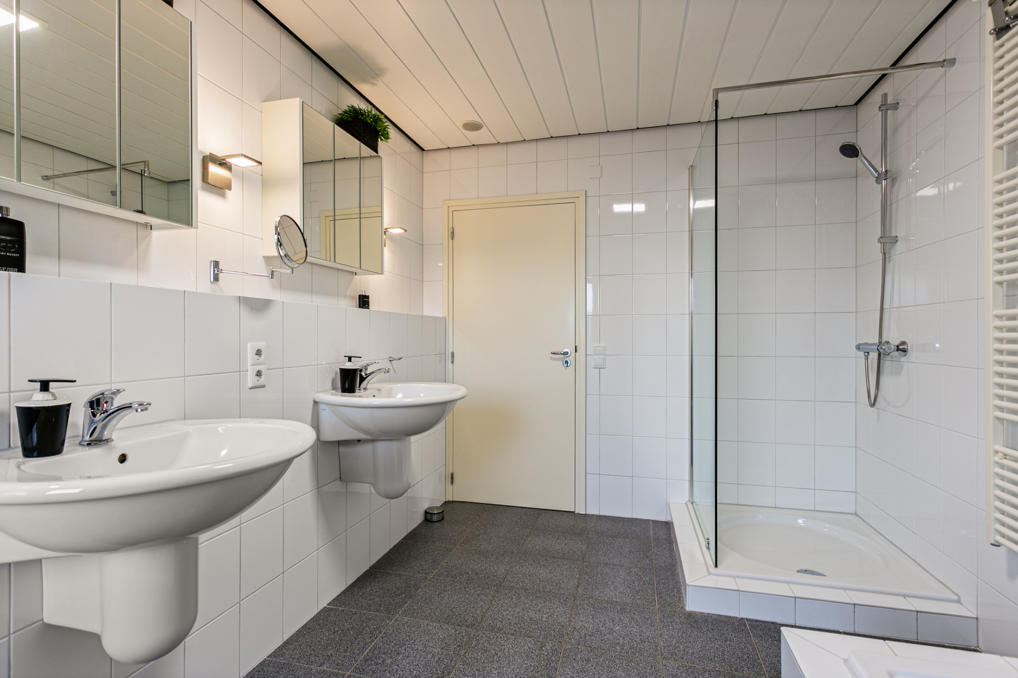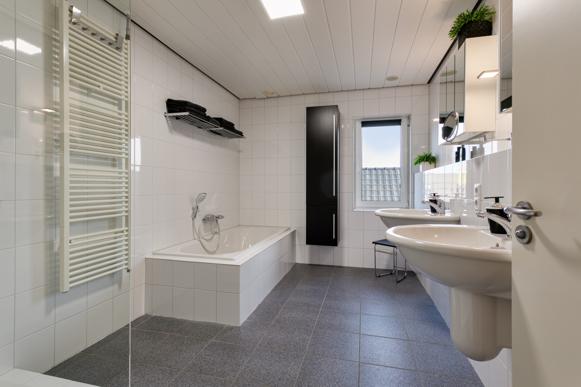 Hier bevinden zich naast de royale overloop maar liefst 5 ruime kamers (4 slaapkamers en een kantoor), een apart toilet en een keurig verzorgde badkamer (voorzien van vloerverwarming) voorzien van een ligbad, dubbele wastafel en douche.
