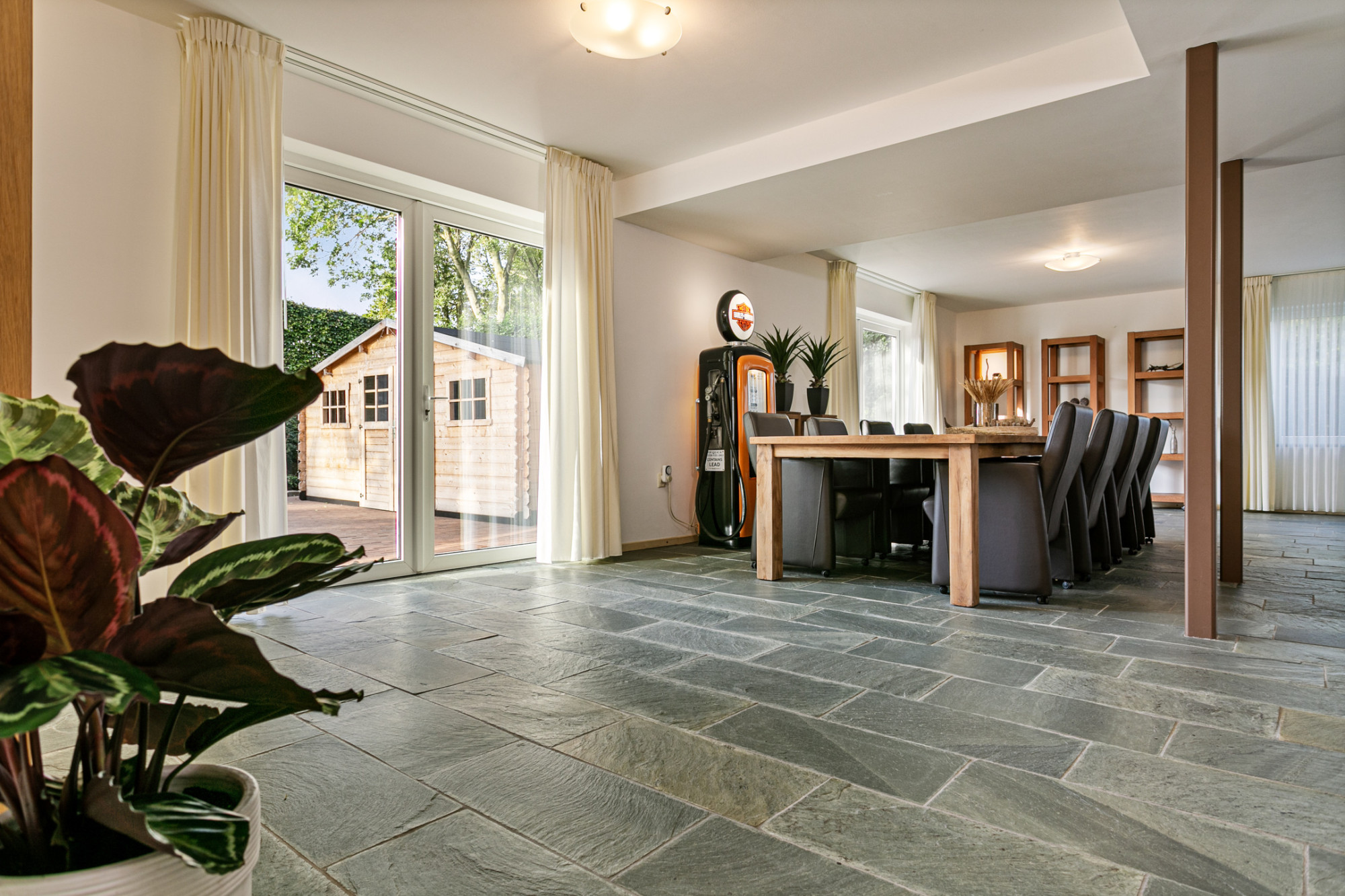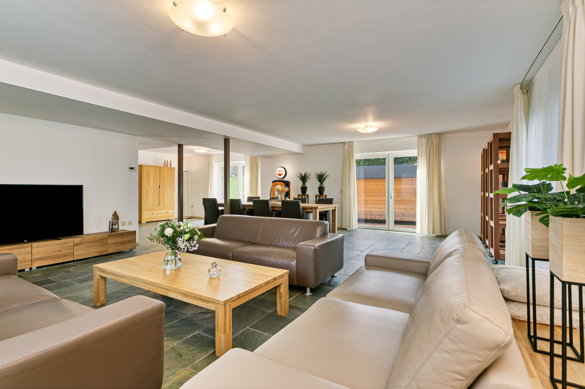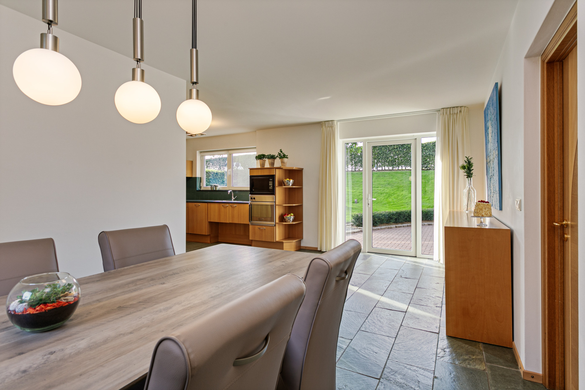 Dankzij de vele raampartijen geniet je hier van een prachtige lichtinval. De woonkamer staat in directe verbinding met de eetkamer, die weer grenst aan de separate leefkeuken.
