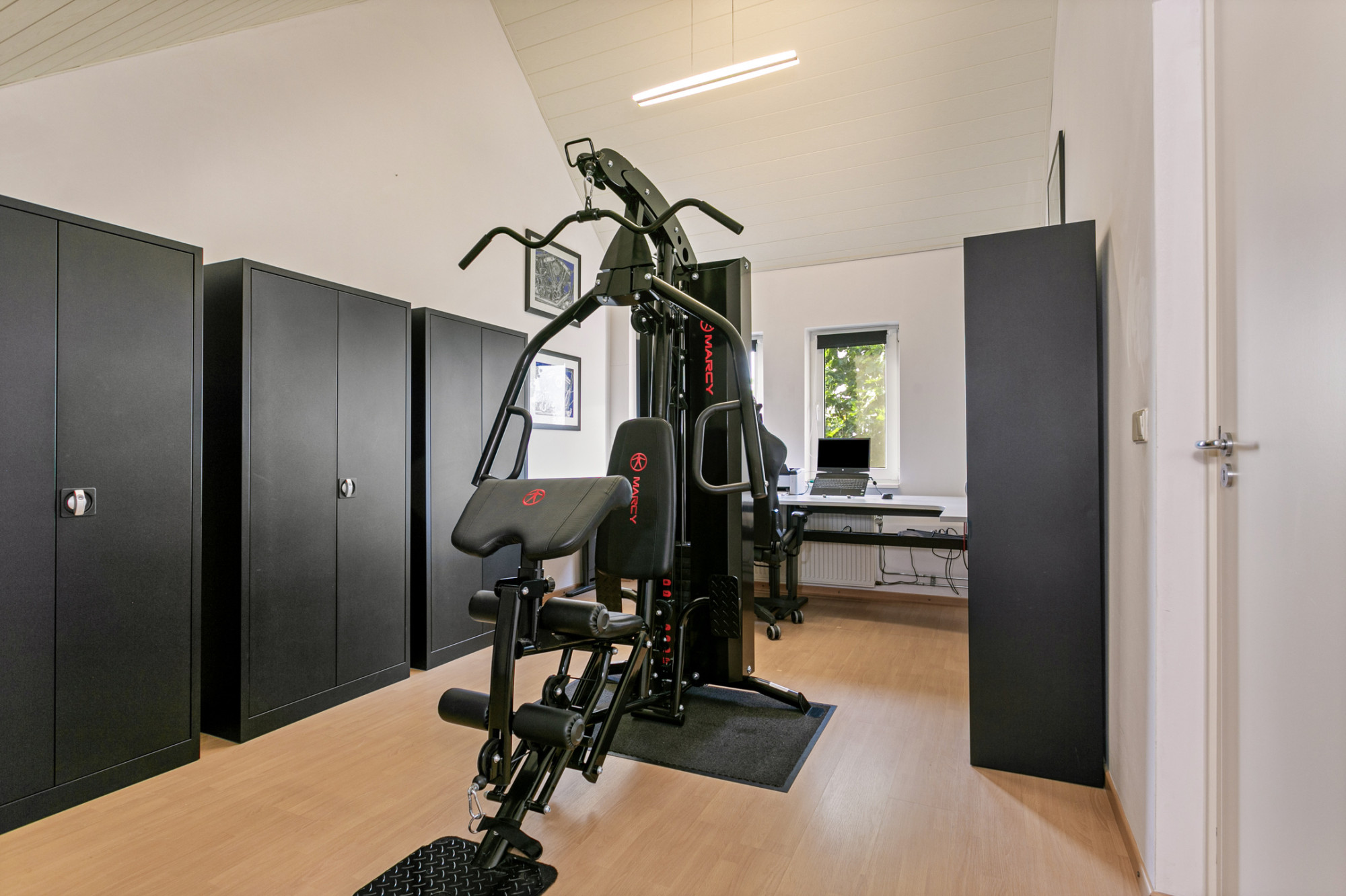 Via een overkapping kom je uit bij de riante L-vormige garage (met bovenliggende vliering, bereikbaar via vaste trap) en met elektrisch bedienbare sectionaal poort en twee aparte toegangsdeuren.