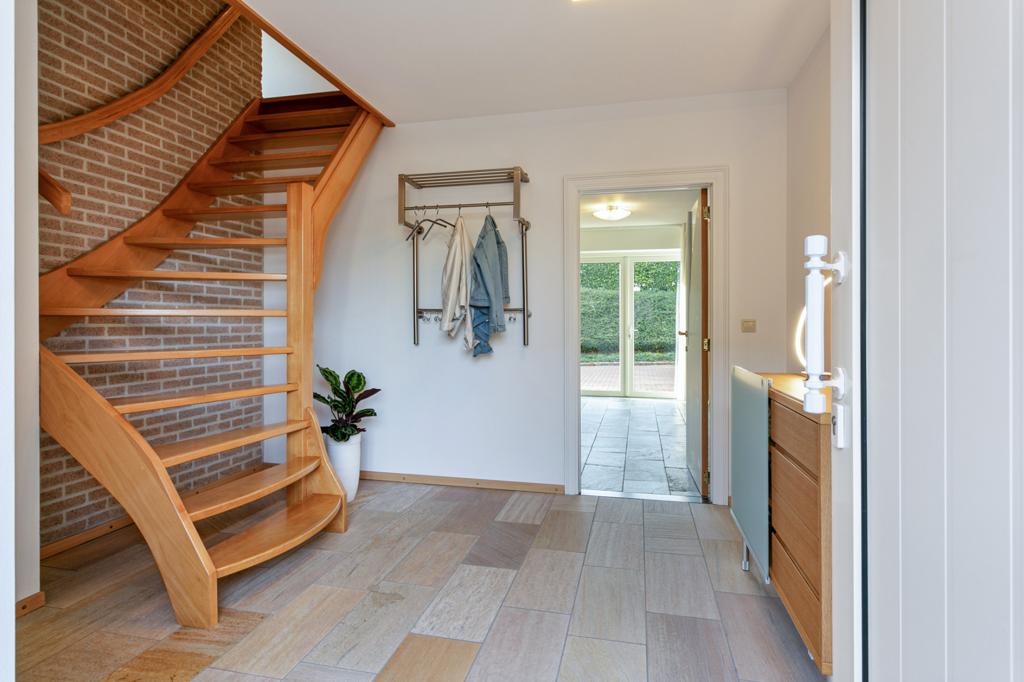 De entreehal geeft toegang tot het gastentoilet, de trap naar de eerste verdieping en de royale woonkamer aan de voorzijde.