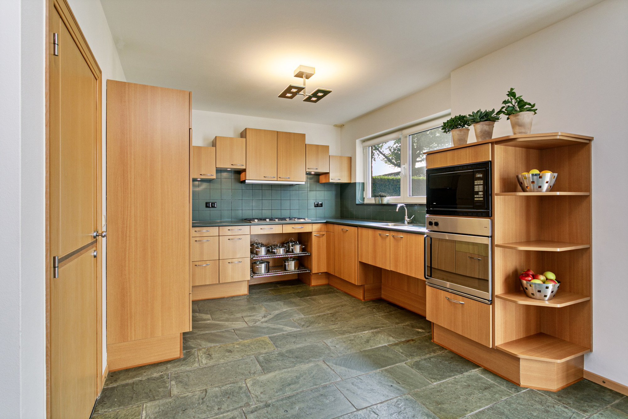De keuken is ruim opgezet en voorzien van een uitgebreide keukeninstallatie met de nodige inbouwapparatuur.