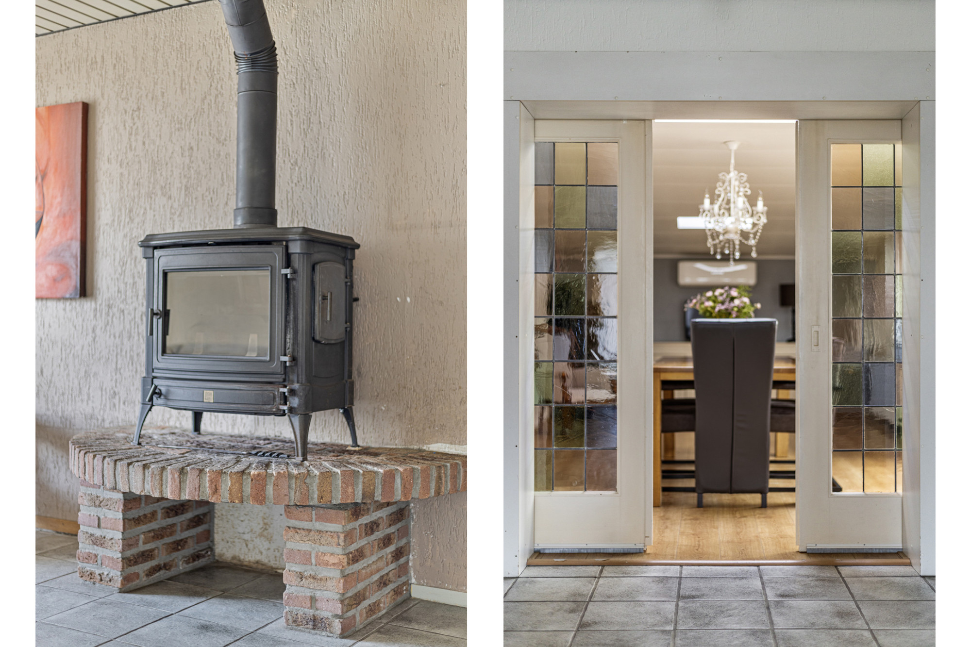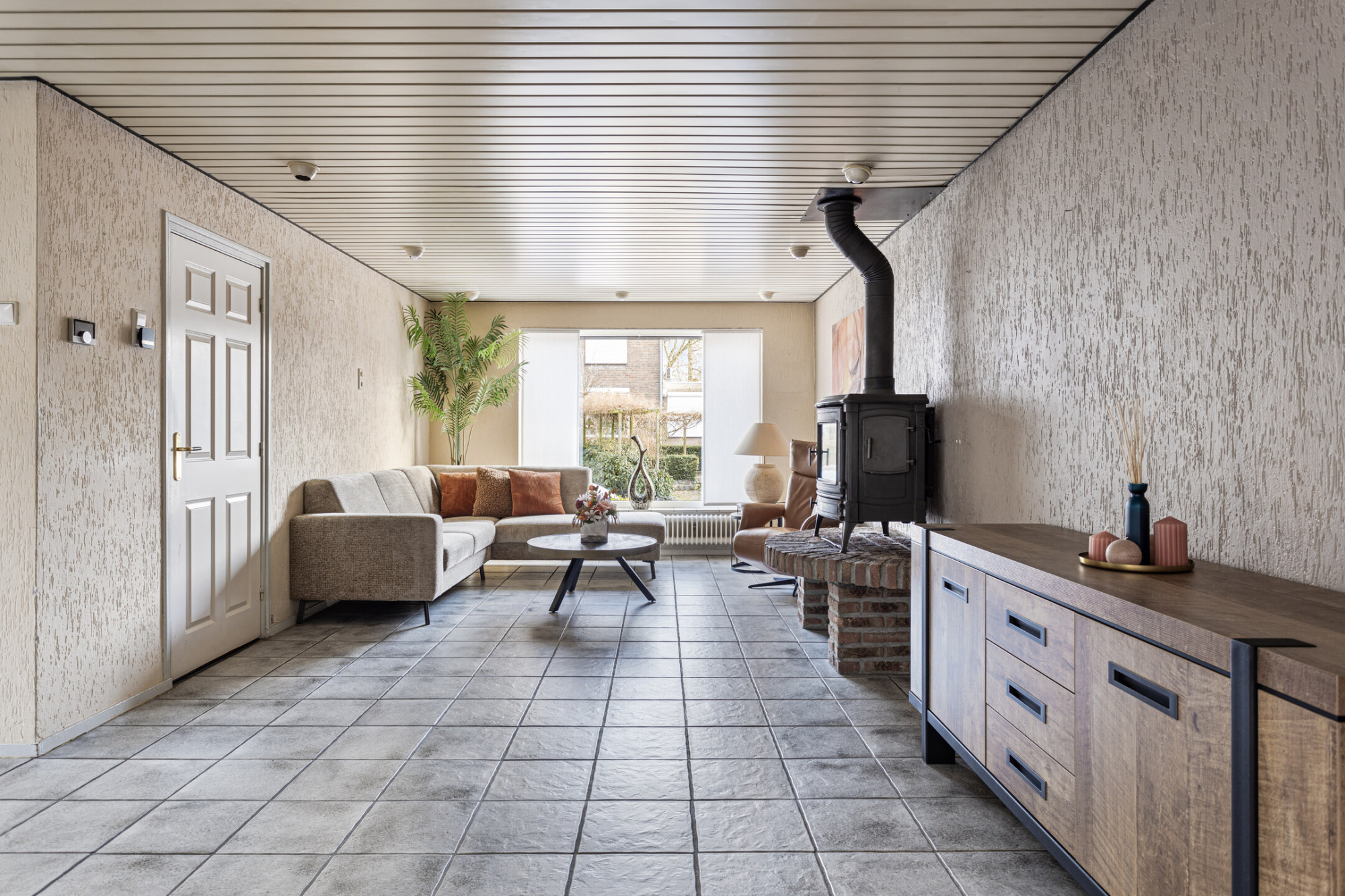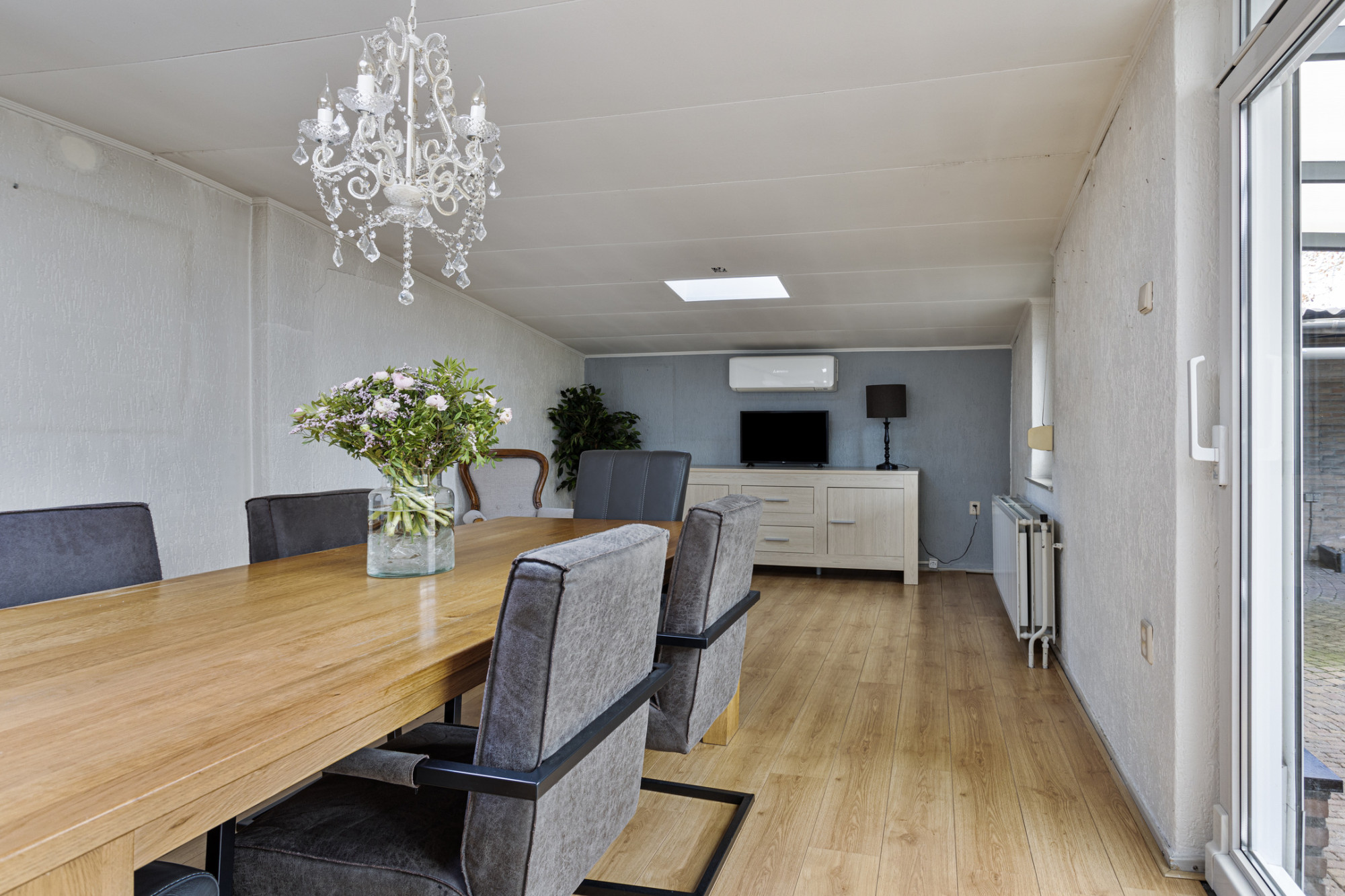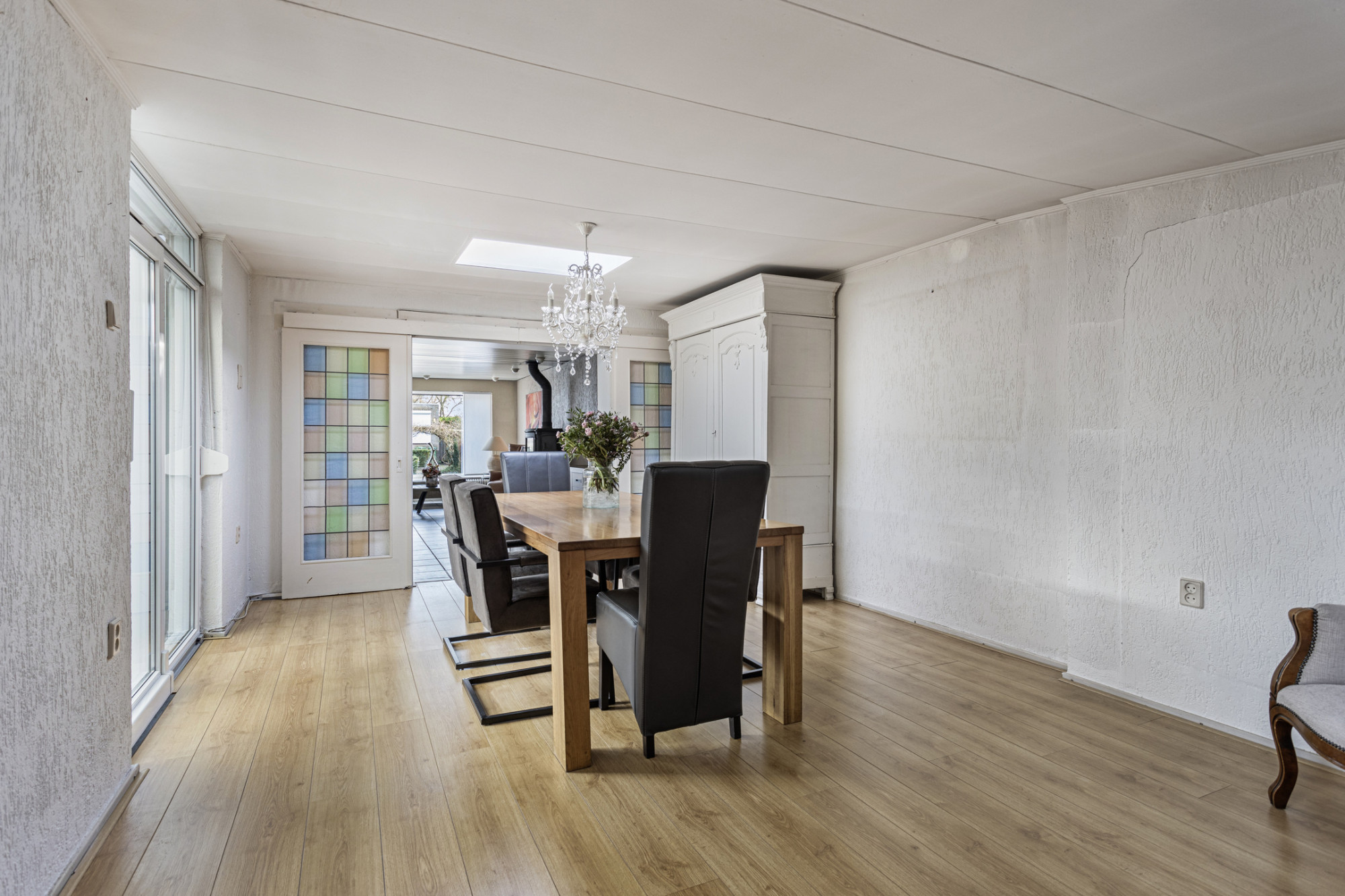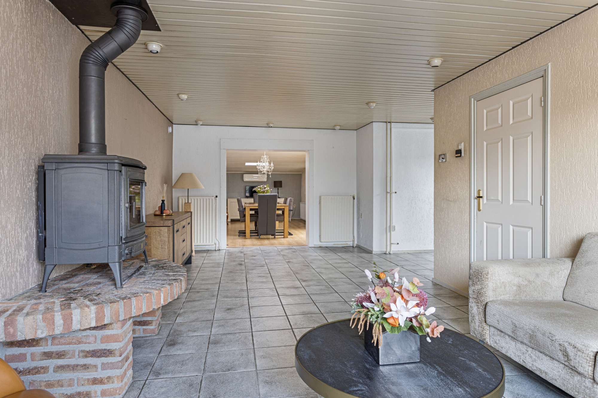 - Woonkamer met open keuken van totaal ca. 35 m² met haard en via schuifdeuren bereikbare aanbouw van ca. 23 m² met airco. Deze ruimte is ideaal als eetkamer, kantoor of slaapkamer.