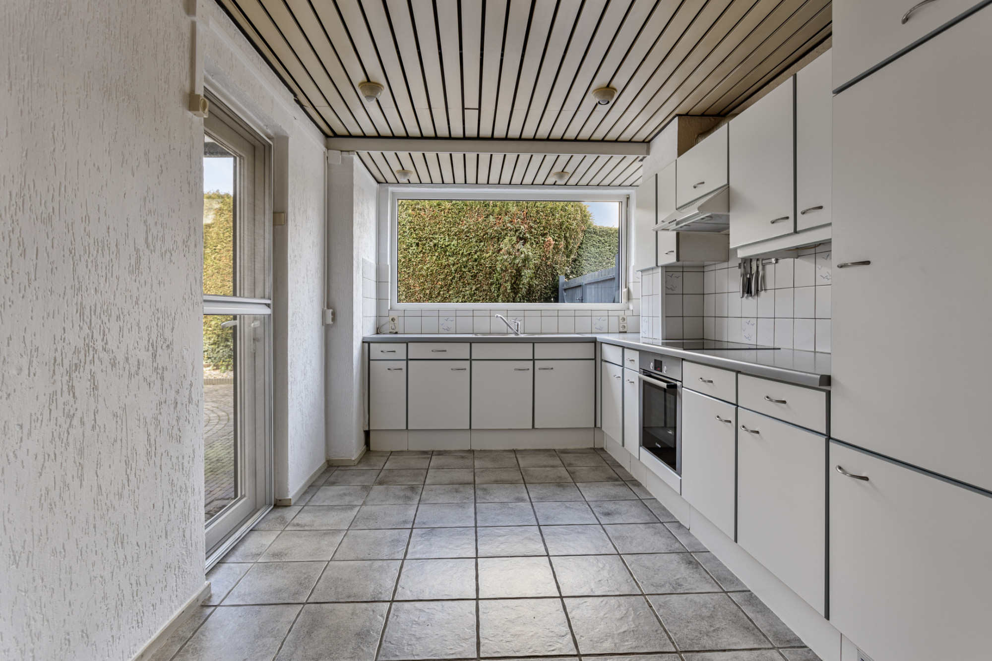 - De open keuken is voorzien van een keurige L-vormige keukenopstelling en biedt toegang tot de achtertuin.