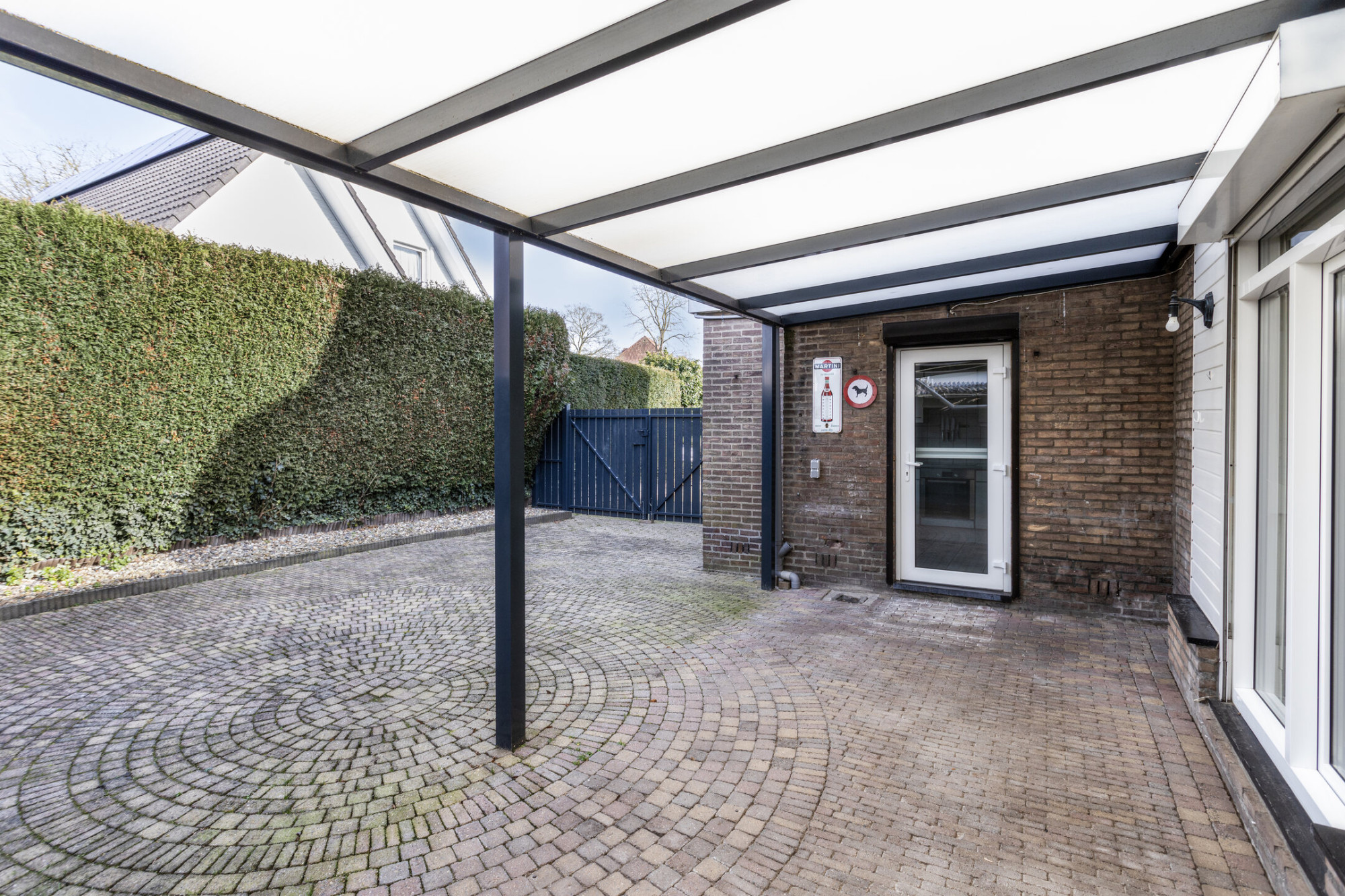 - Via achterom bereikbare onderhoudsarme achtertuin van ca. 100 m² op het zuidoosten met 2 royale terrasoverkappingen en toegang tot de praktische garage van ca. 15 m².