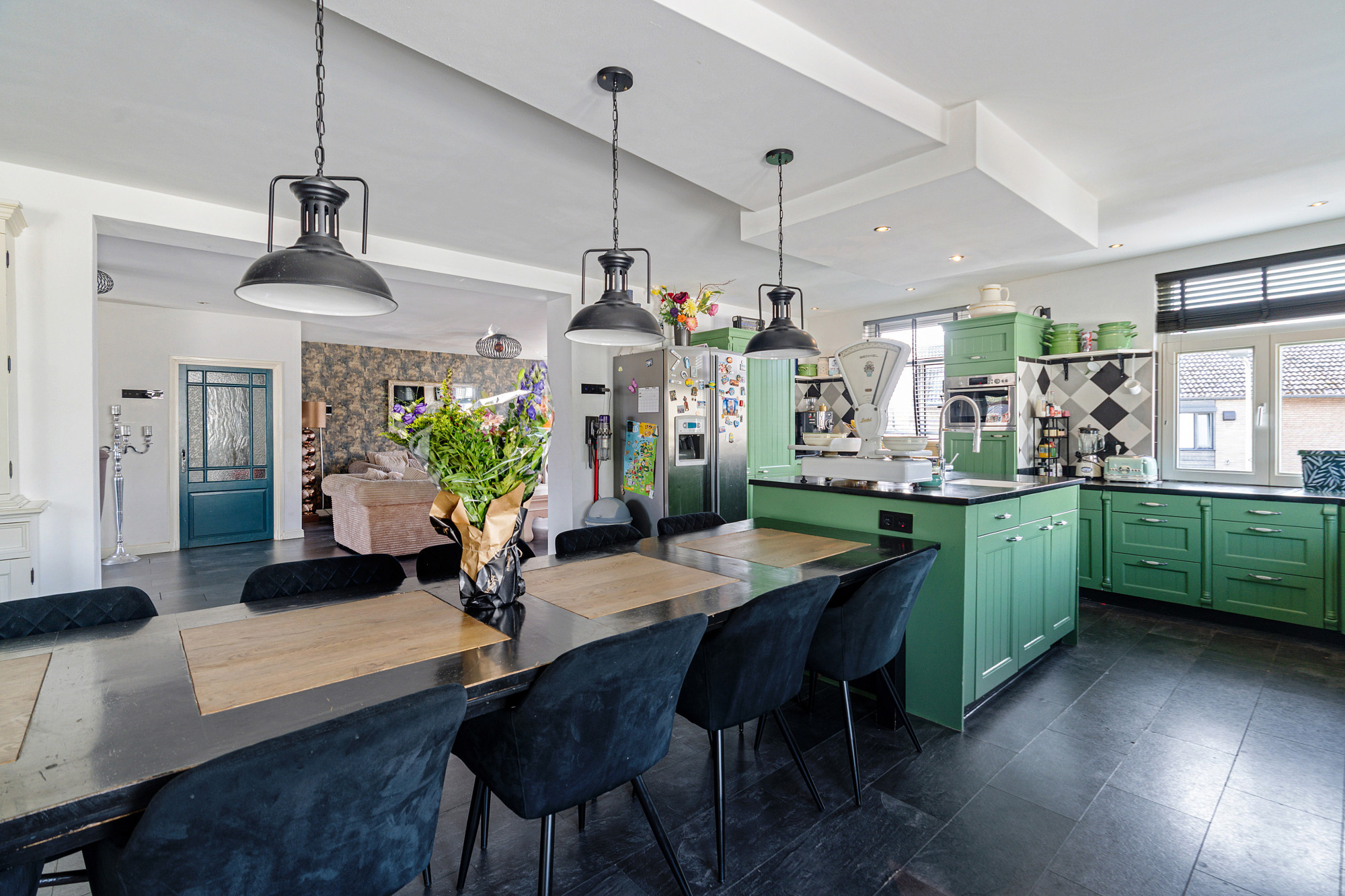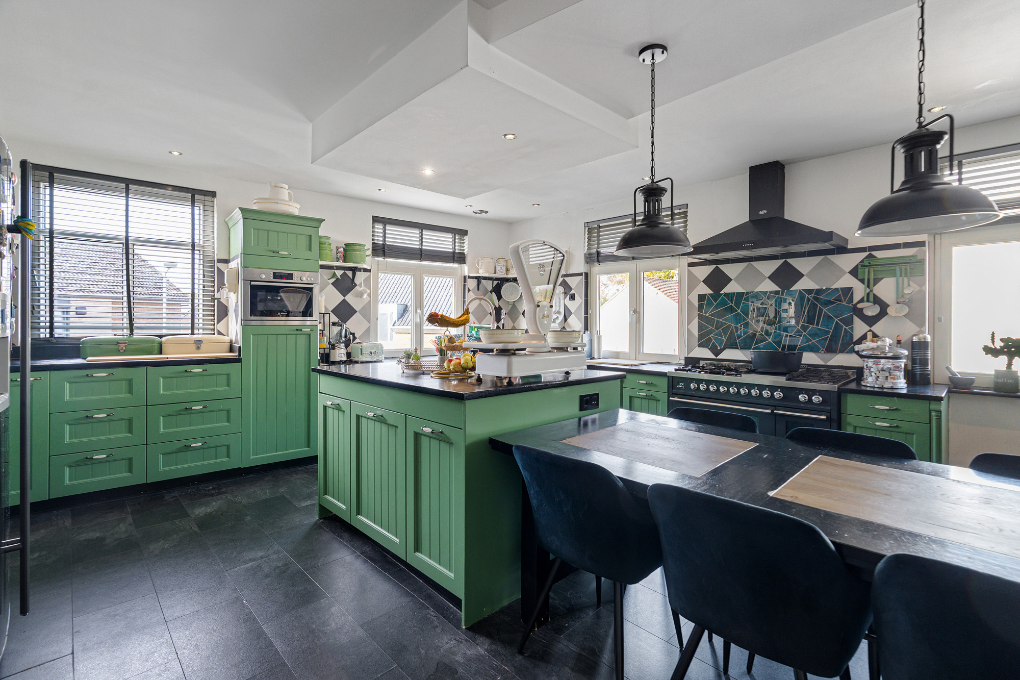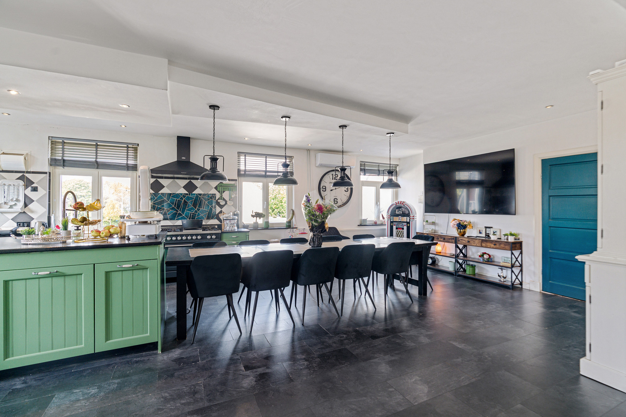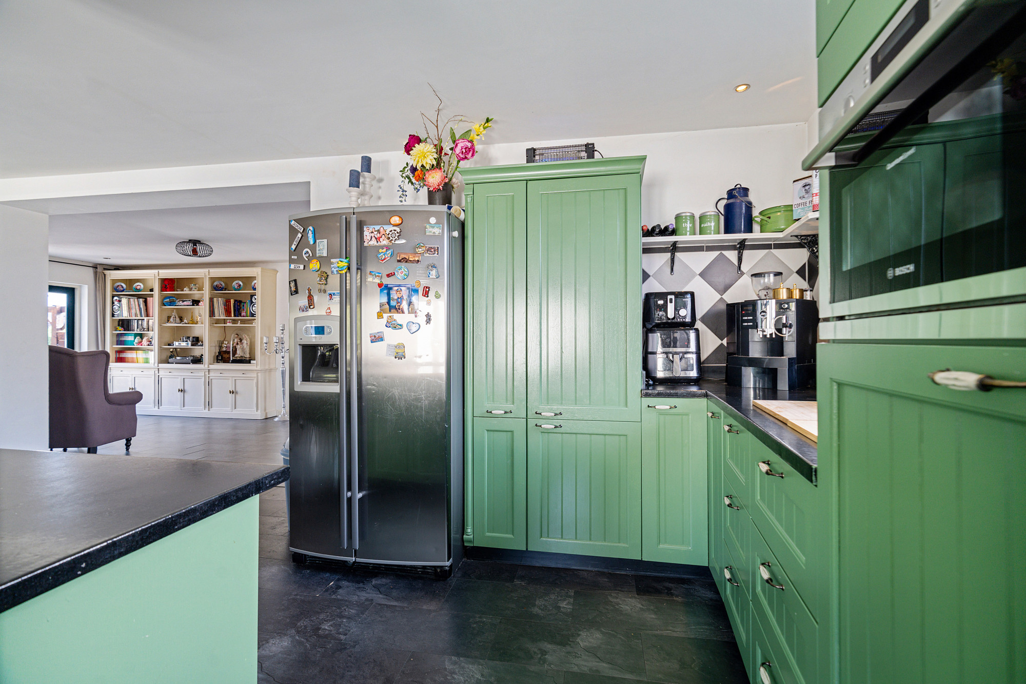 Open keuken voorzien van 6-pits gaskooktoestel met bakplaat en twee ovens, wasemkap, twee koelkasten,