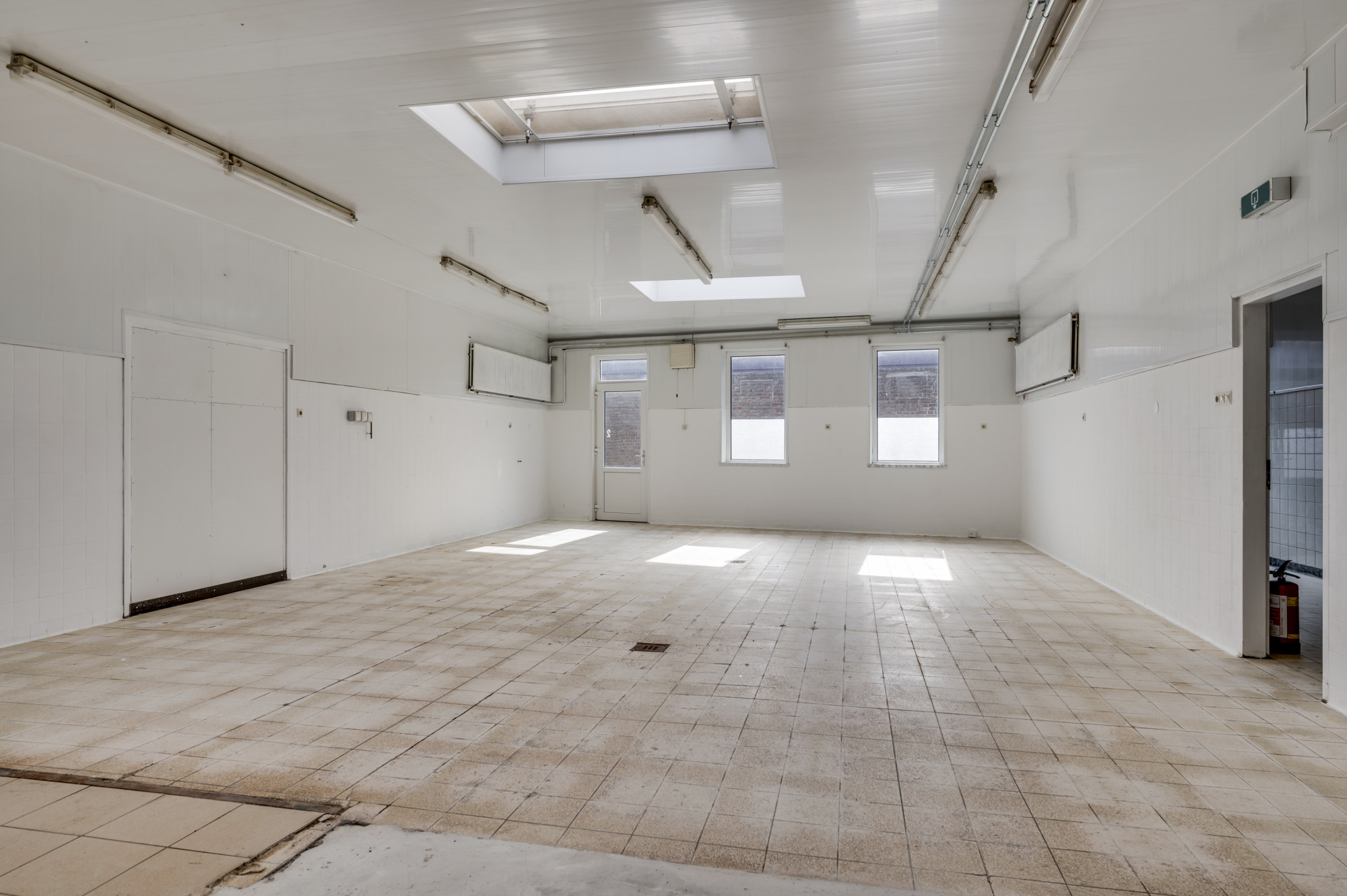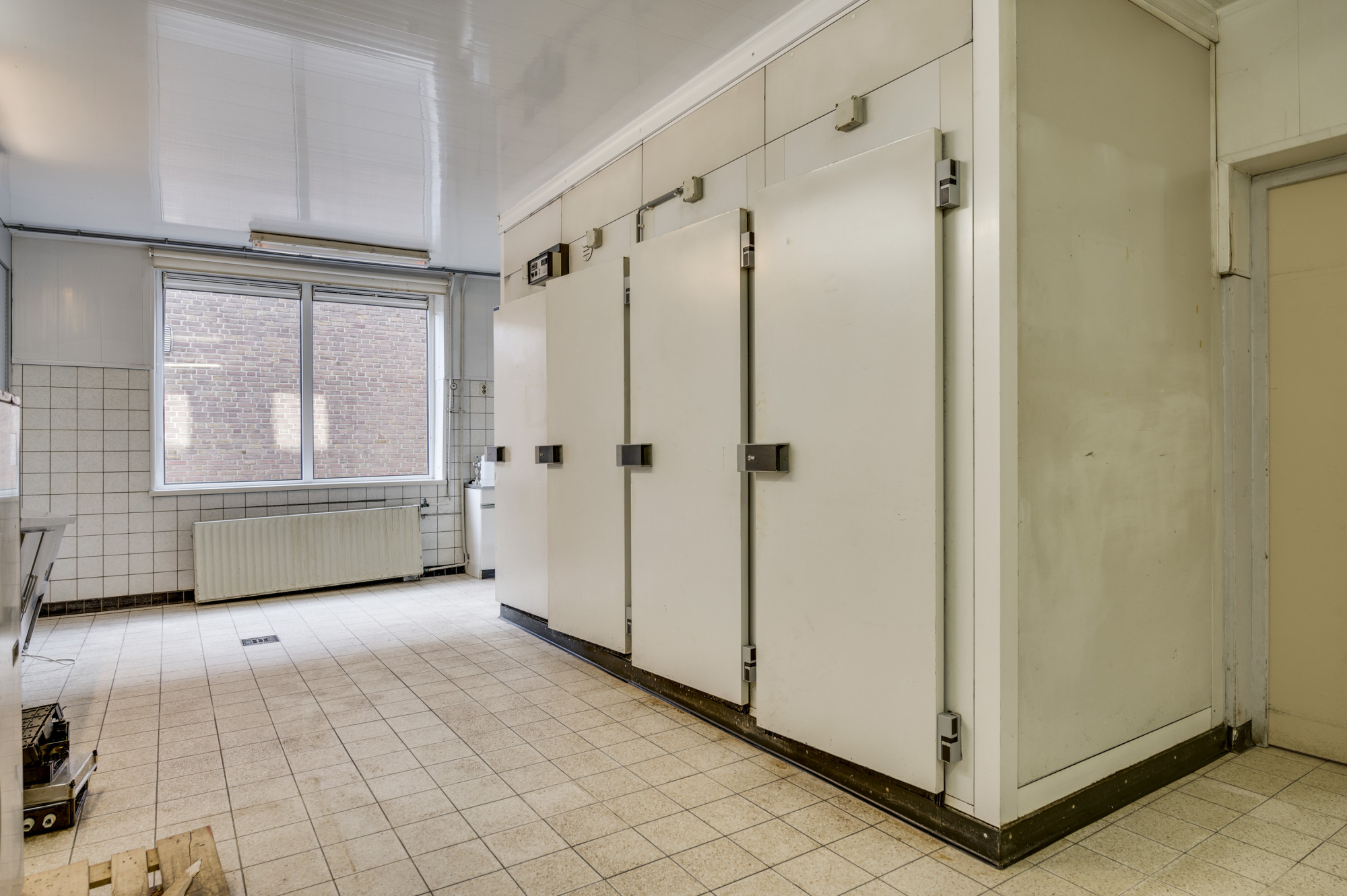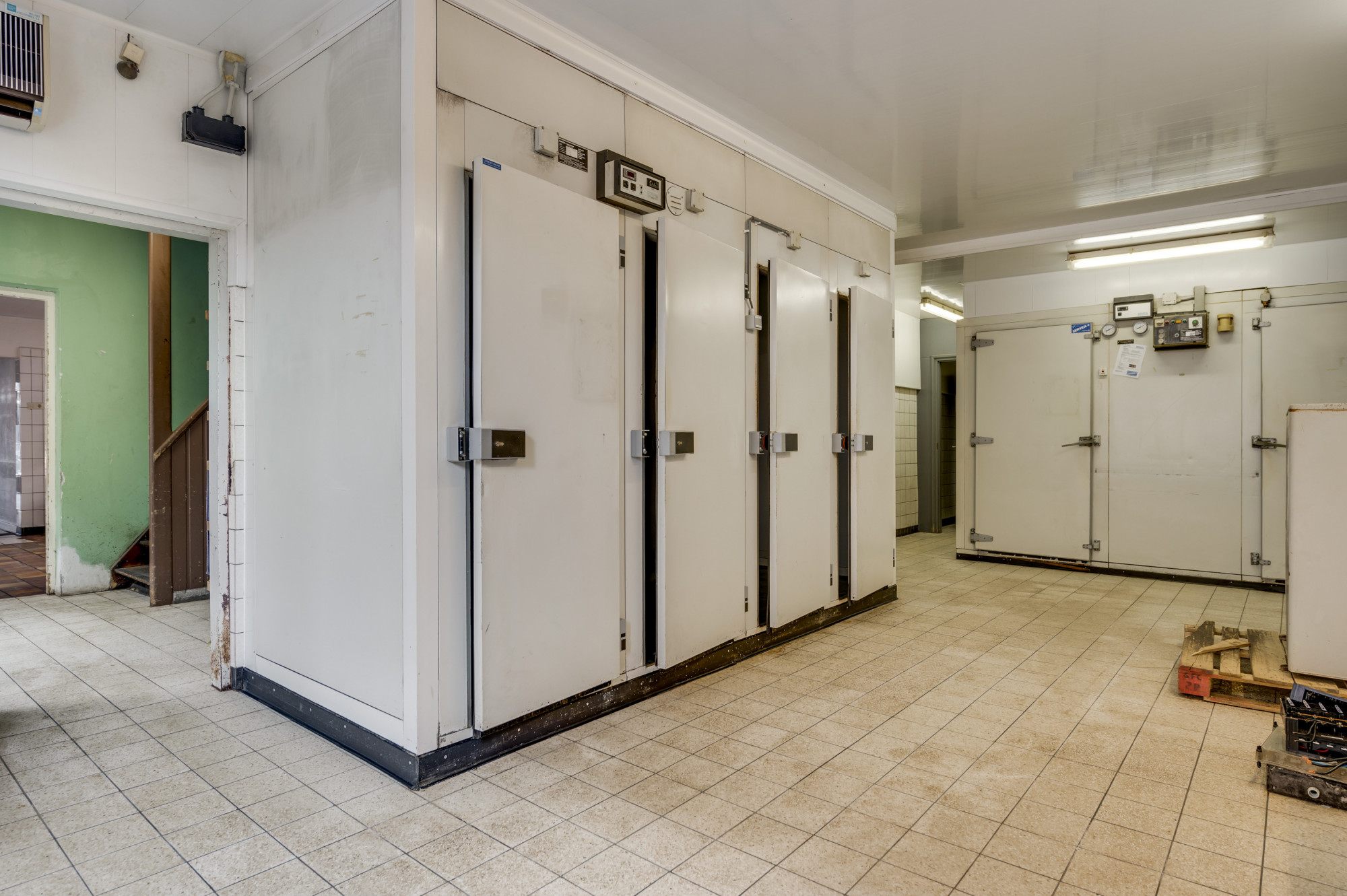 De entree van het pand leidt naar de winkelruimte met een etalage. Vanuit deze ruimte is een magazijn en een bedrijfsruimte toegankelijk alsmede een kantoorruimte. Vanuit de bedrijfsruimte is er een ruime hal toegankelijk, welke toegang geeft tot de toiletruimte met fonteintje en de badkamer met douchecabine en wastafel. De hal geeft verder toegang tot de overige riante bedrijfsruimtes (niet inpandig op foto) en voormalige koelcellen, alsmede via de bedrijfsruimtes uiteindelijk de royale inpandige garage (niet inpandig op foto). Via de centrale hal is er tevens toegang tot de kelder. Middels diverse loopdeuren is de 1e brede vrije achterom te bereiken (met auto toegankelijk), alsmede het achter perceel met een 25 tal parkeerplaatsen op eigen terrein met een extra 2e ontsluiting via de achterzijde.