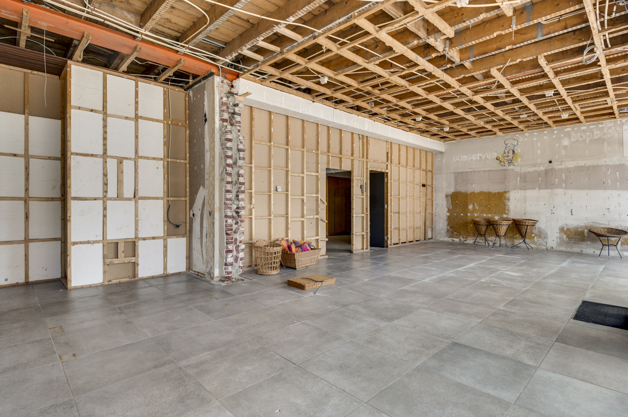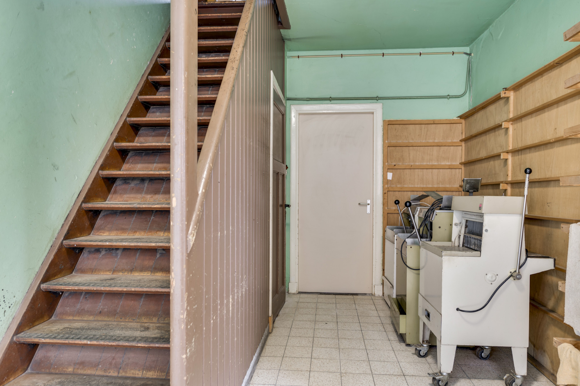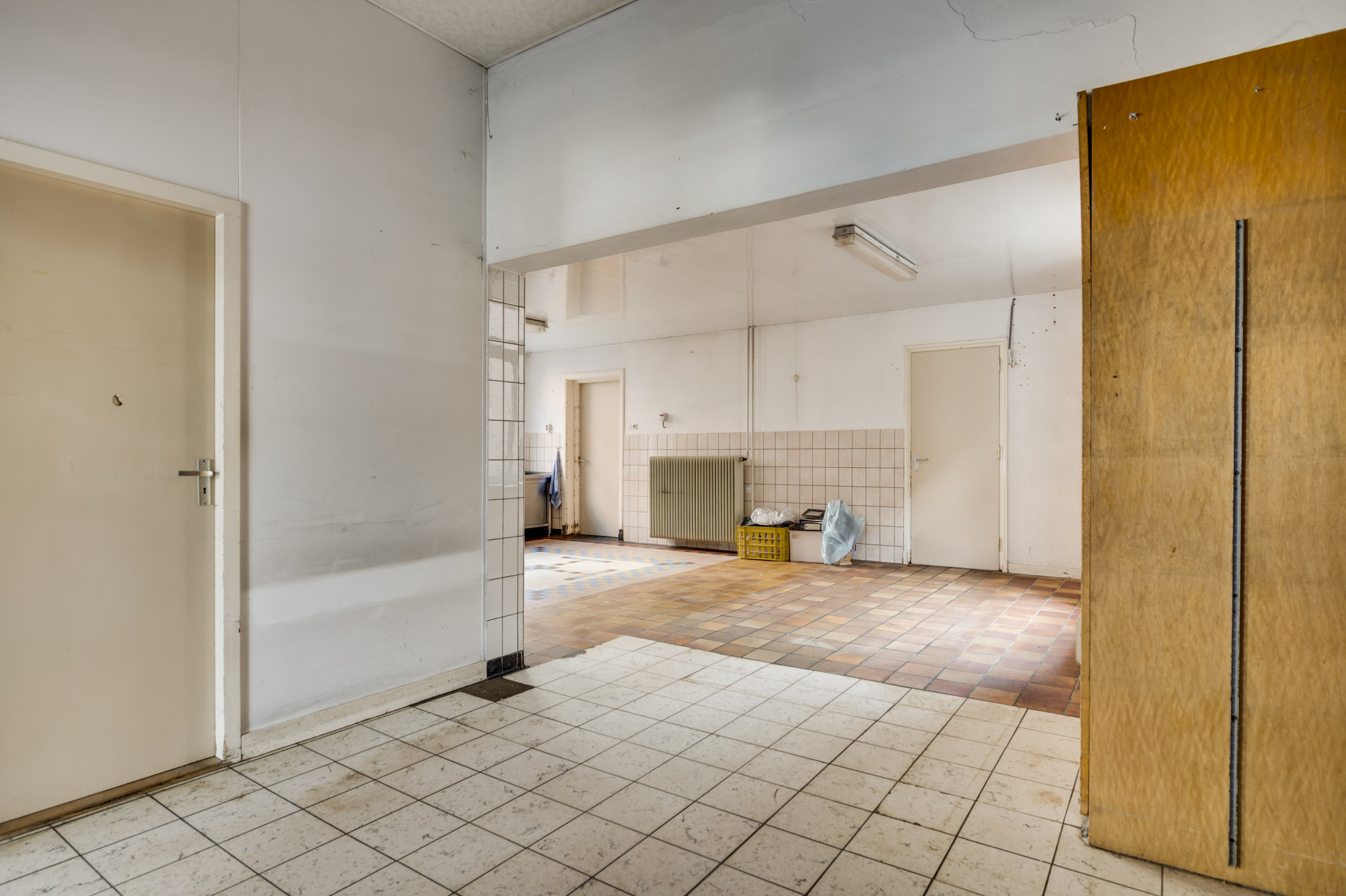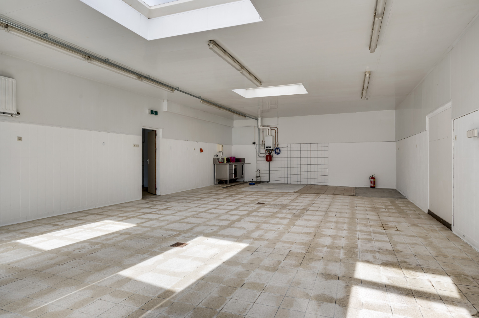 De entree van het pand leidt naar de winkelruimte met een etalage. Vanuit deze ruimte is een magazijn en een bedrijfsruimte toegankelijk alsmede een kantoorruimte. Vanuit de bedrijfsruimte is er een ruime hal toegankelijk, welke toegang geeft tot de toiletruimte met fonteintje en de badkamer met douchecabine en wastafel. De hal geeft verder toegang tot de overige riante bedrijfsruimtes (niet inpandig op foto) en voormalige koelcellen, alsmede via de bedrijfsruimtes uiteindelijk de royale inpandige garage (niet inpandig op foto). Via de centrale hal is er tevens toegang tot de kelder. Middels diverse loopdeuren is de 1e brede vrije achterom te bereiken (met auto toegankelijk), alsmede het achter perceel met een 25 tal parkeerplaatsen op eigen terrein met een extra 2e ontsluiting via de achterzijde.