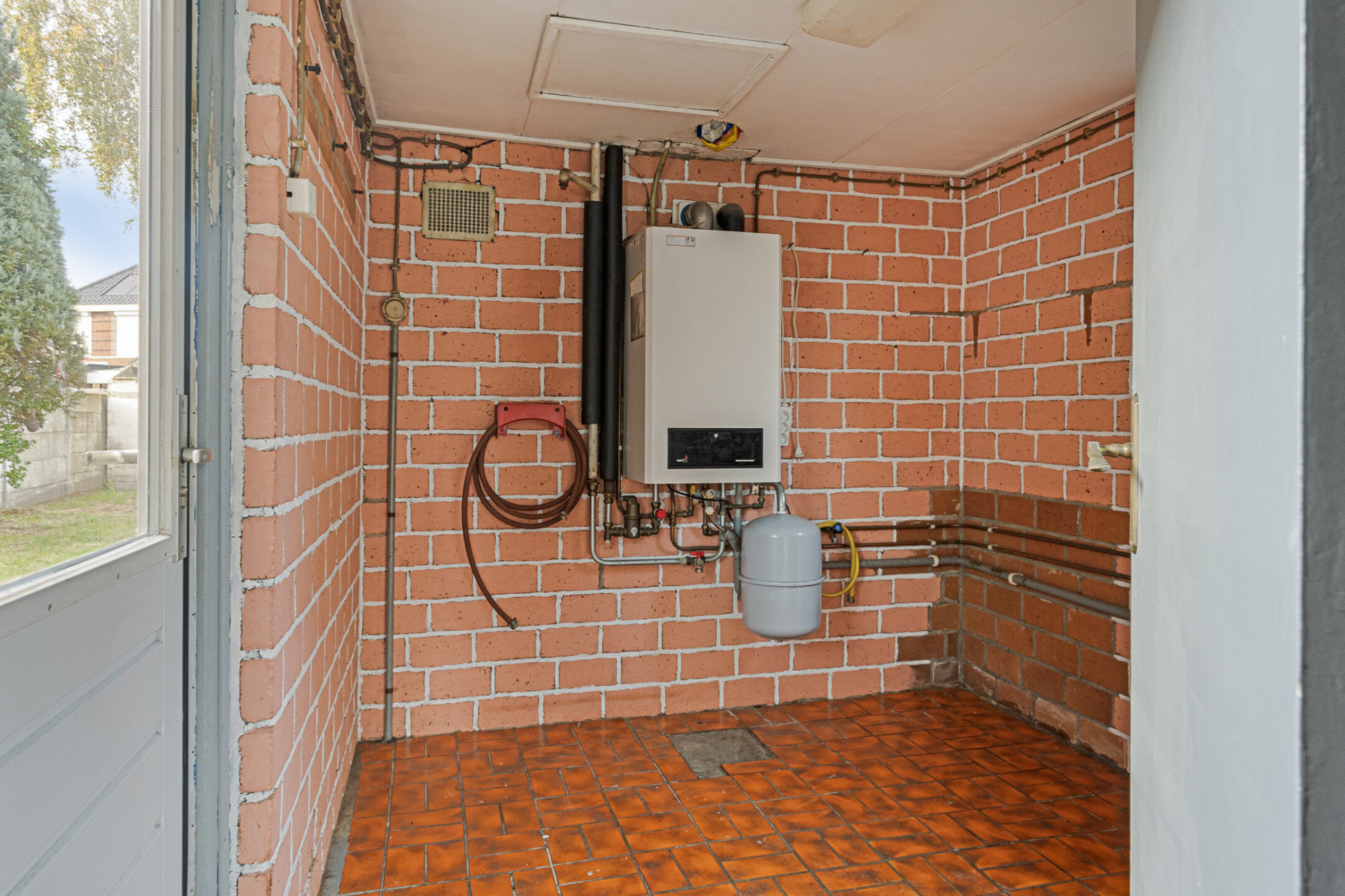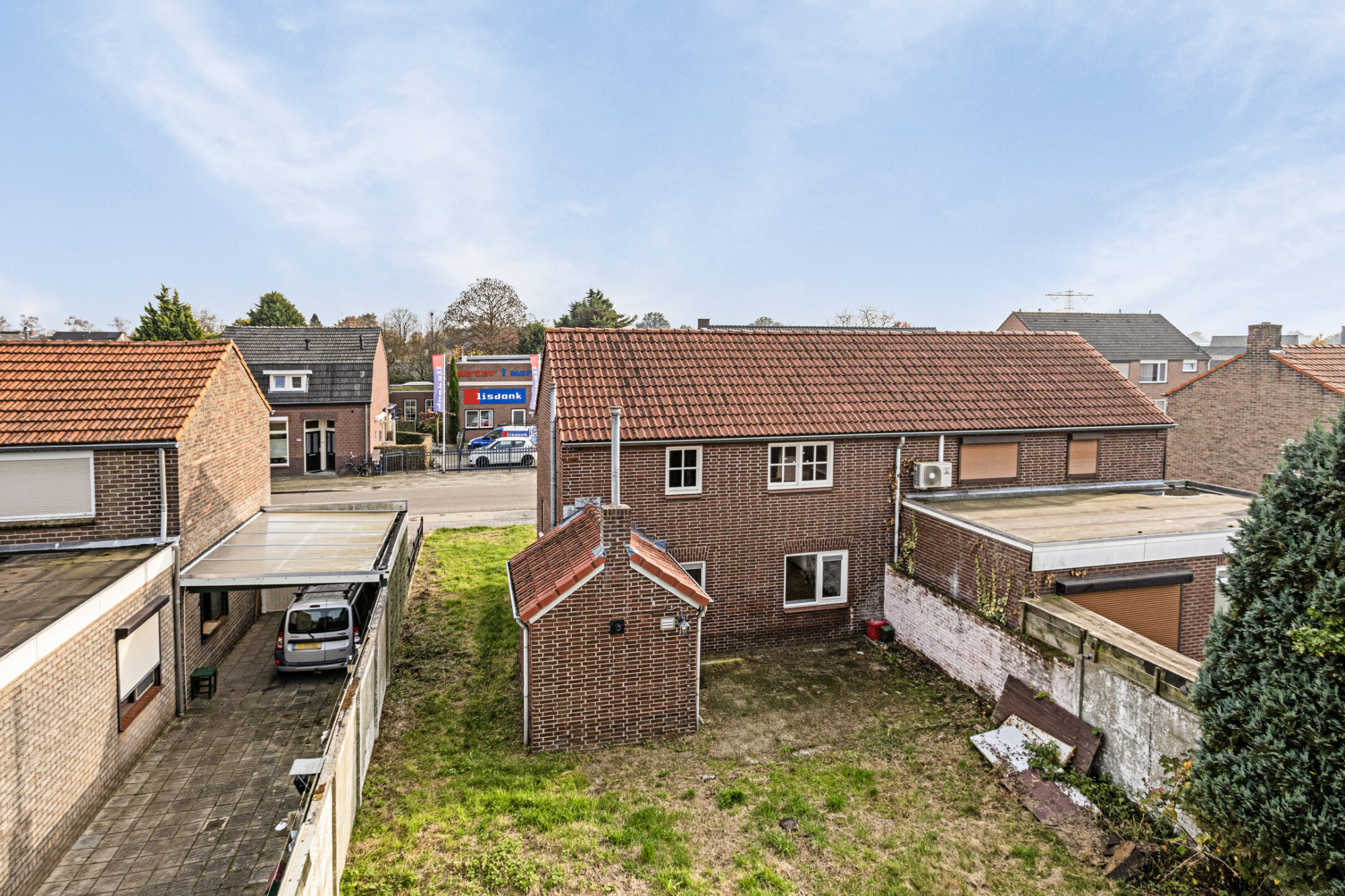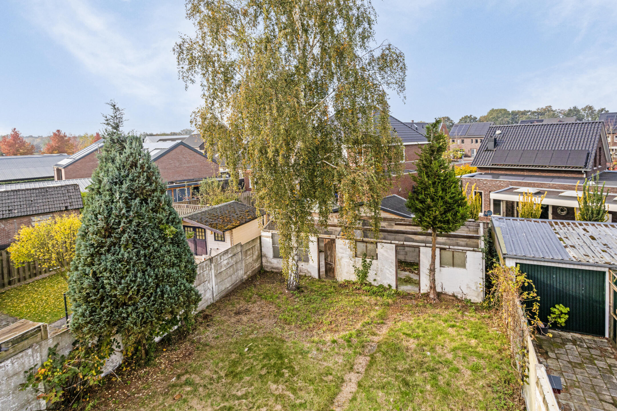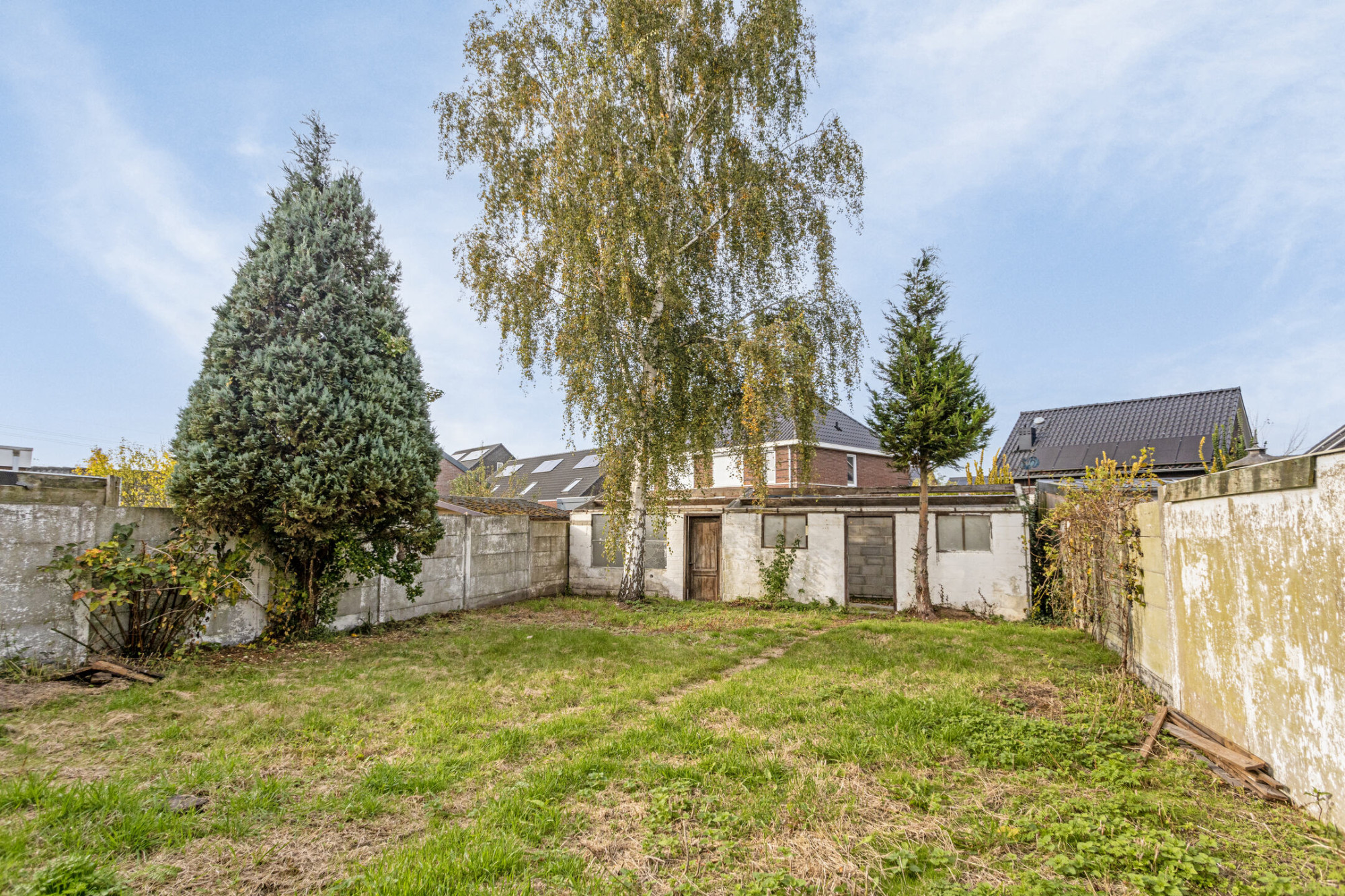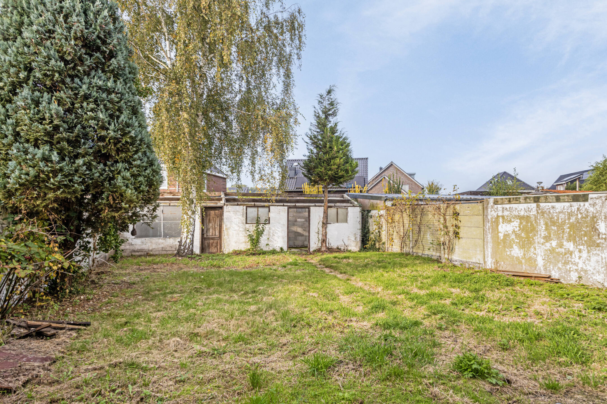Zeer lange achtertuin welke momenteel vooral is voorzien van een stenen gebouw, welke vroeger diende als schuur.