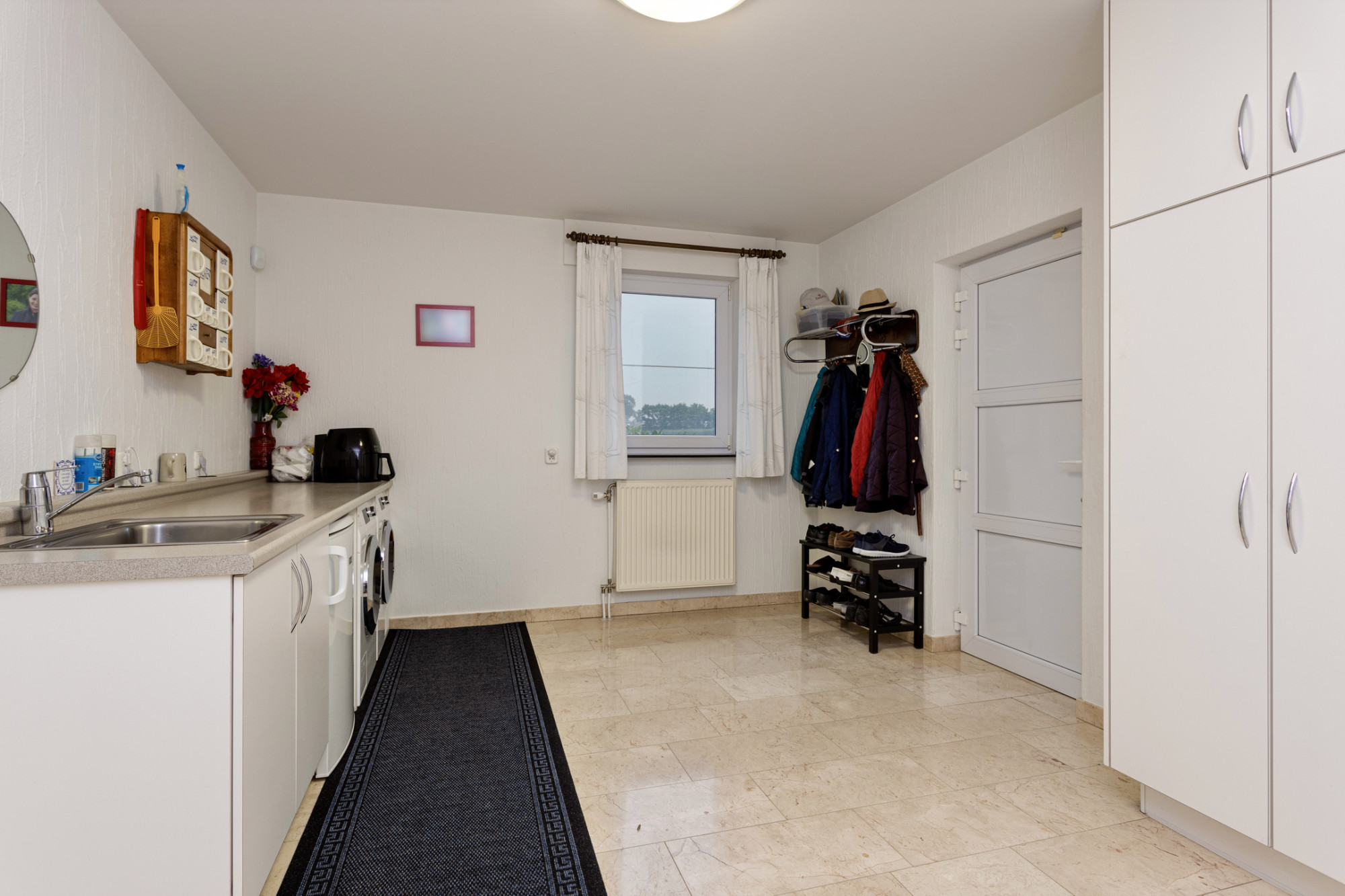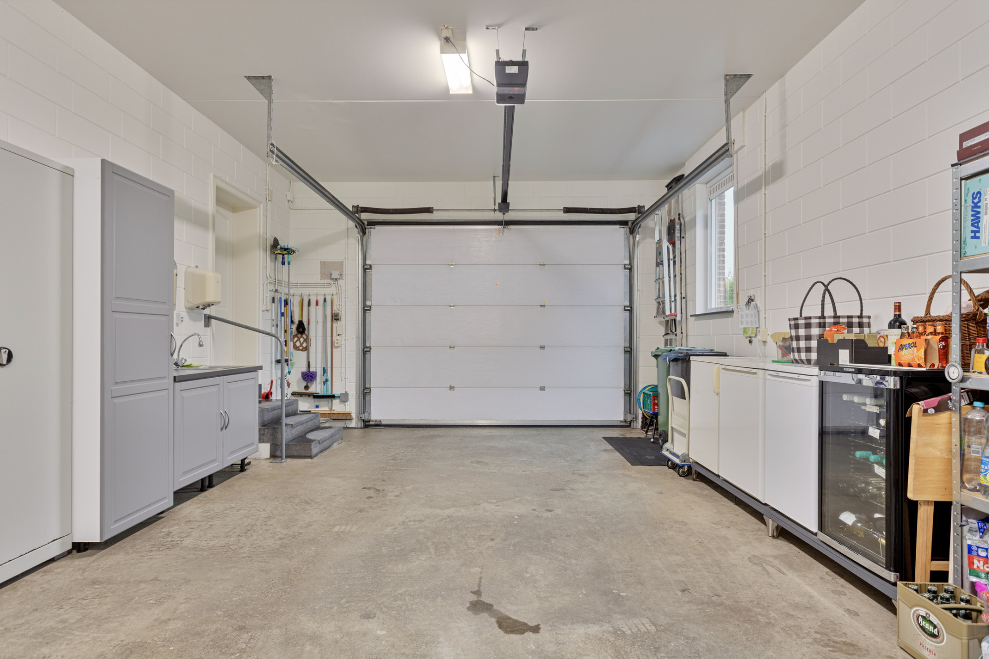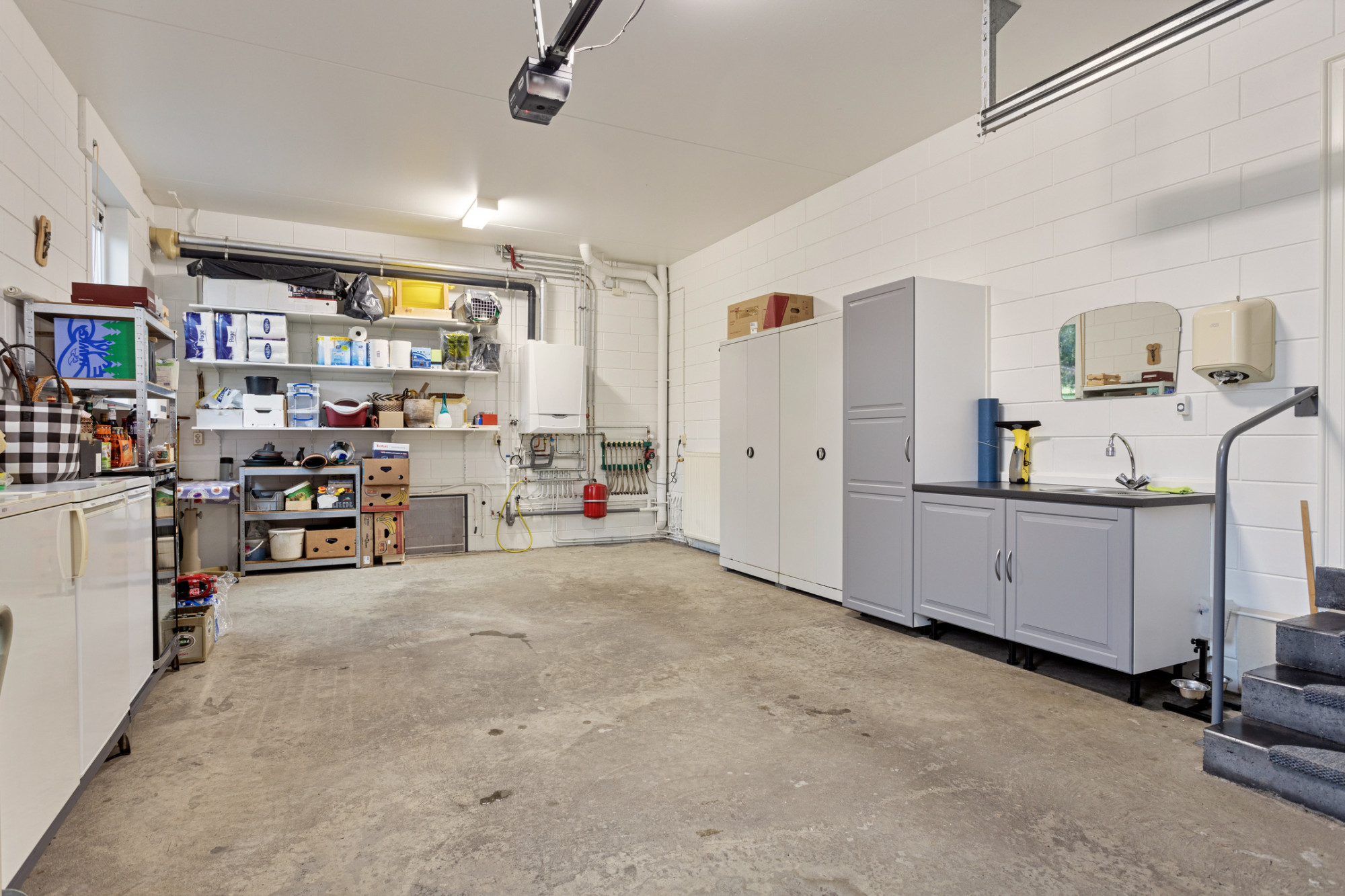 Zéér ruime inpandige garage van ca. 38 m2 met elektrische sectionaalpoort. Hier bevindt zich tevens de CV-installatie, omvormer voor de zonnepanelen en verdeler van de vloerverwarming.