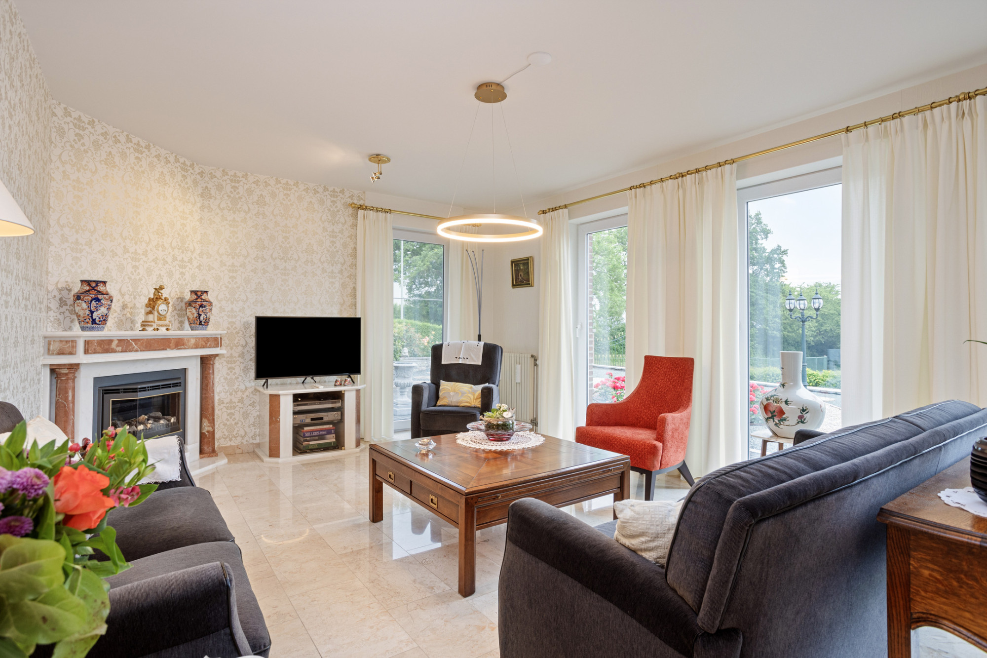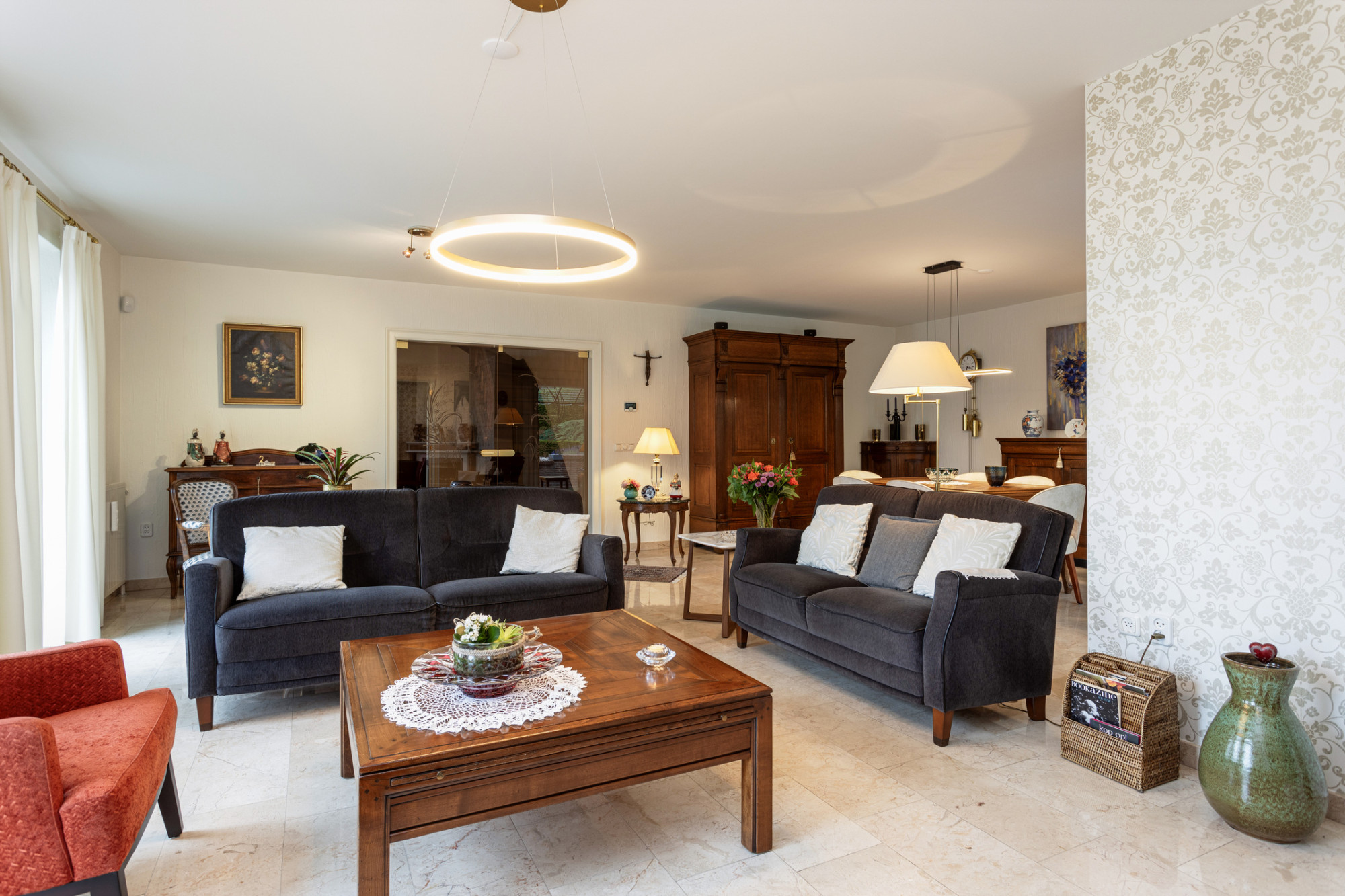 Binnenkomend in de royale entree (ca. 16 m2) springt direct de prachtige eikenhouten trap in het oog. Tevens een separaat toilet en meterkast bevinden zich in de entree. Aan de rechterkant bevindt zich de royale living van ongeveer 55 m2 met haardpartij en schuifpui naar een overdekt terras.
