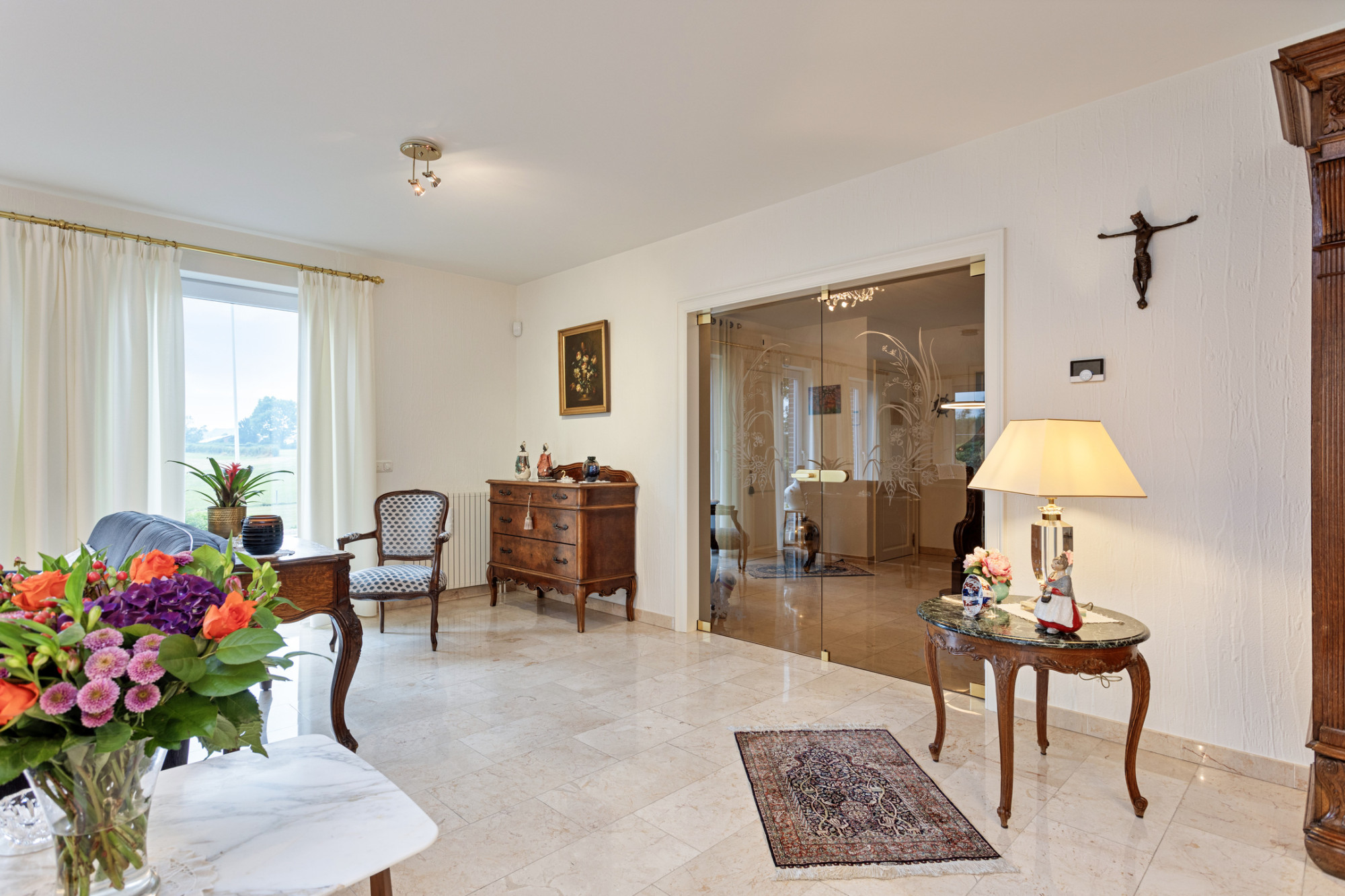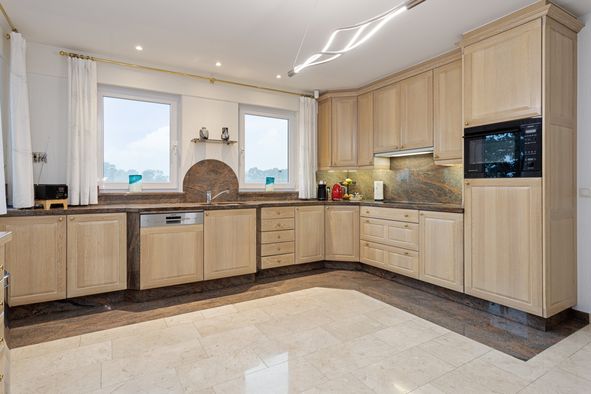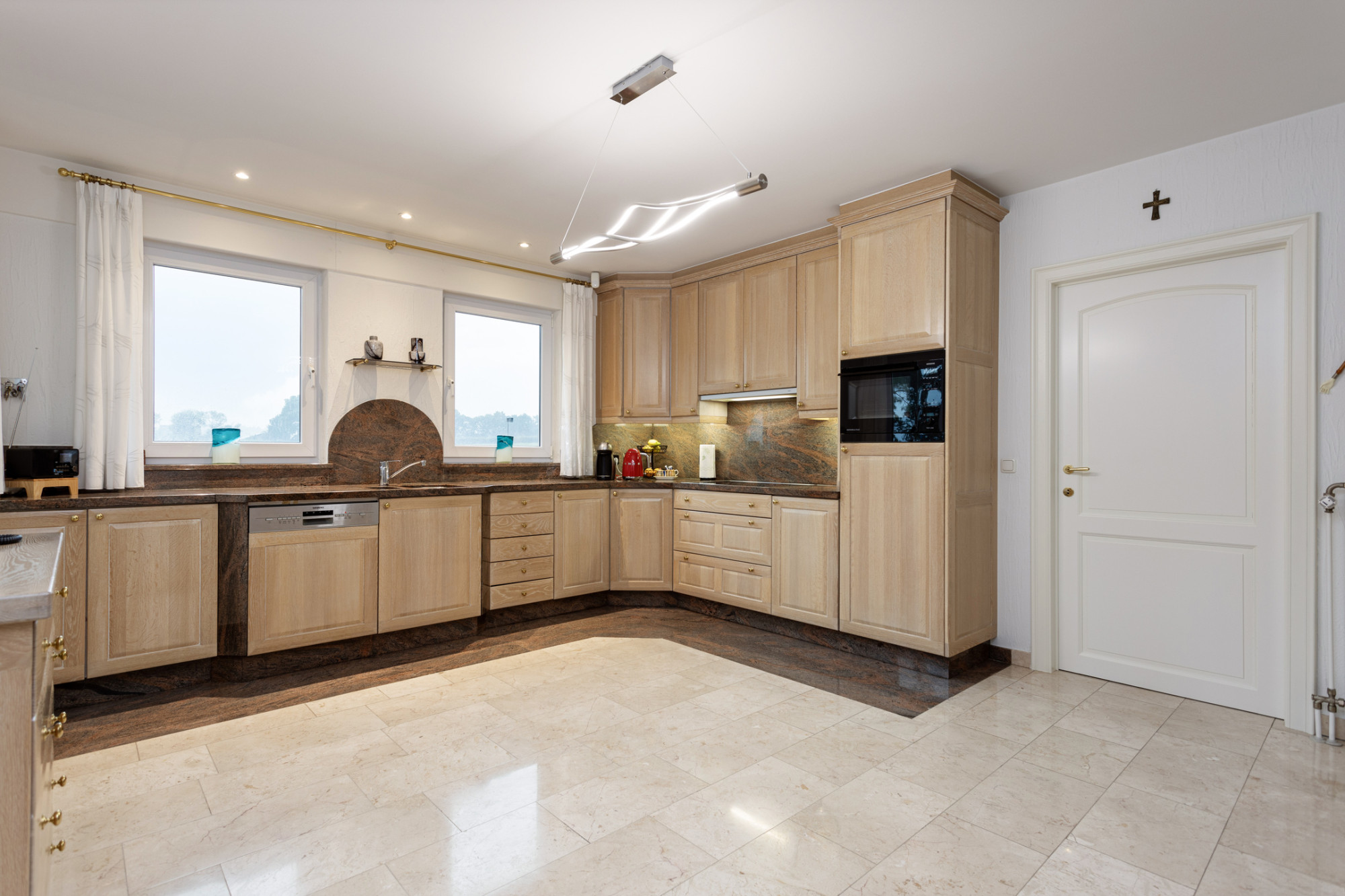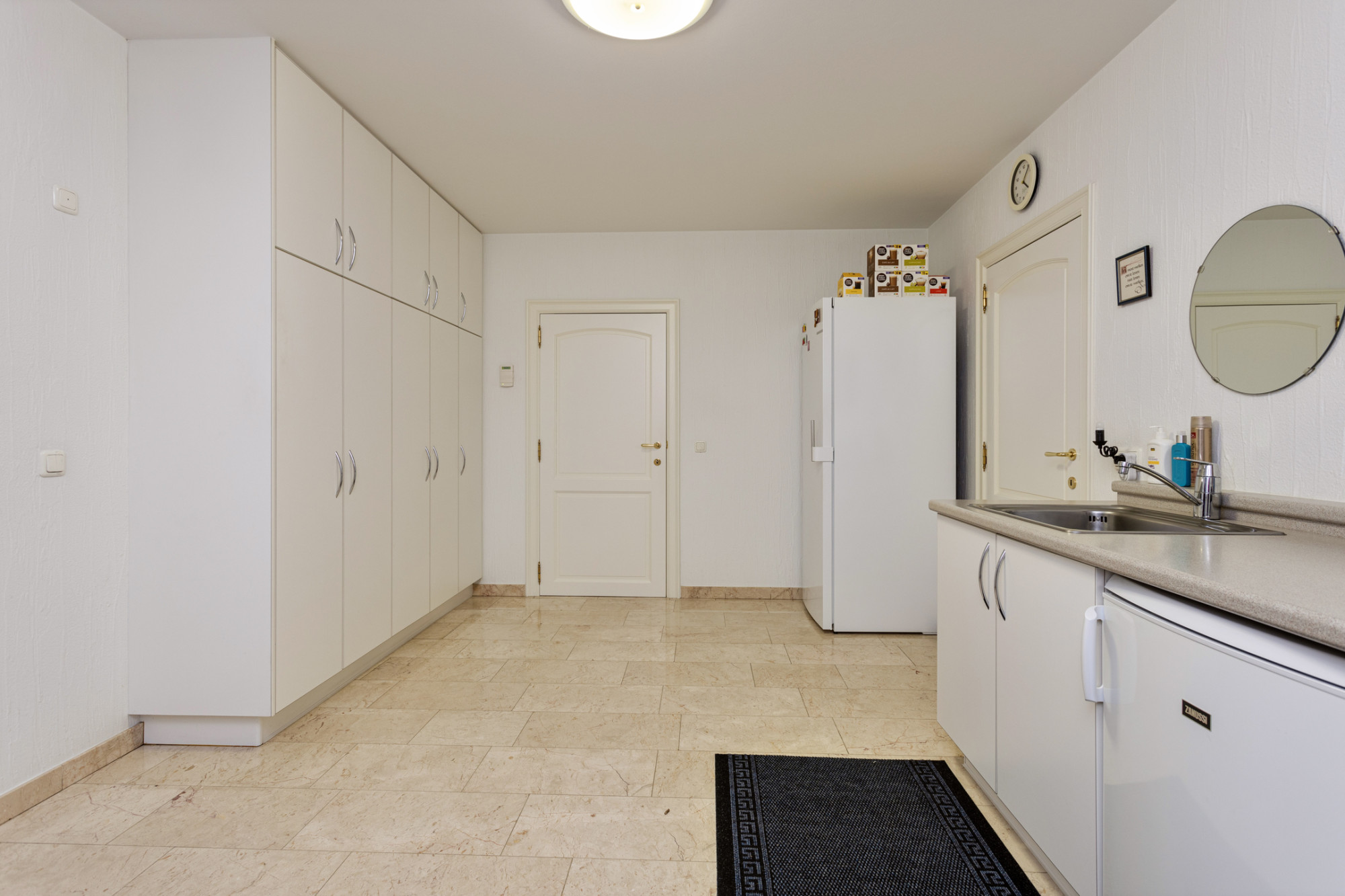 Vanuit de entree aan de linkerzijde bevindt zich de gesloten keuken van ca. 21 m2 voorzien van alle gemakken met aansluitend de bijkeuken met witgoedaansluitingen en toegang tot de royale garage. Tevens is er een slaapkamer of kantoorruimte op de begane grond van ca. 12 m2. De gehele benedenverdieping (m.u.v. garage) is voorzien van vloerverwarming.