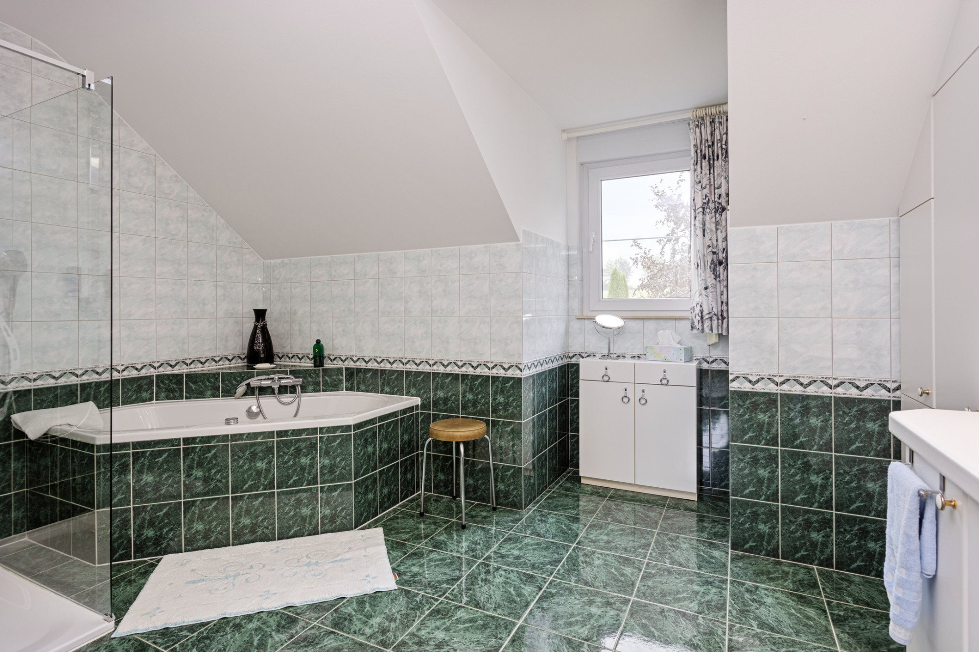 De klassieke badkamer van ca. 16 m2 is voorzien van een hoekligbad, inloopdouche en royaal badmeubel met wastafel en spiegel. Ook in de badkamer is vloerverwarming aanwezig.