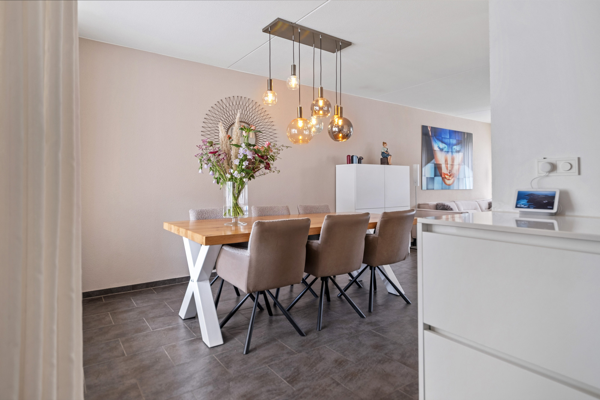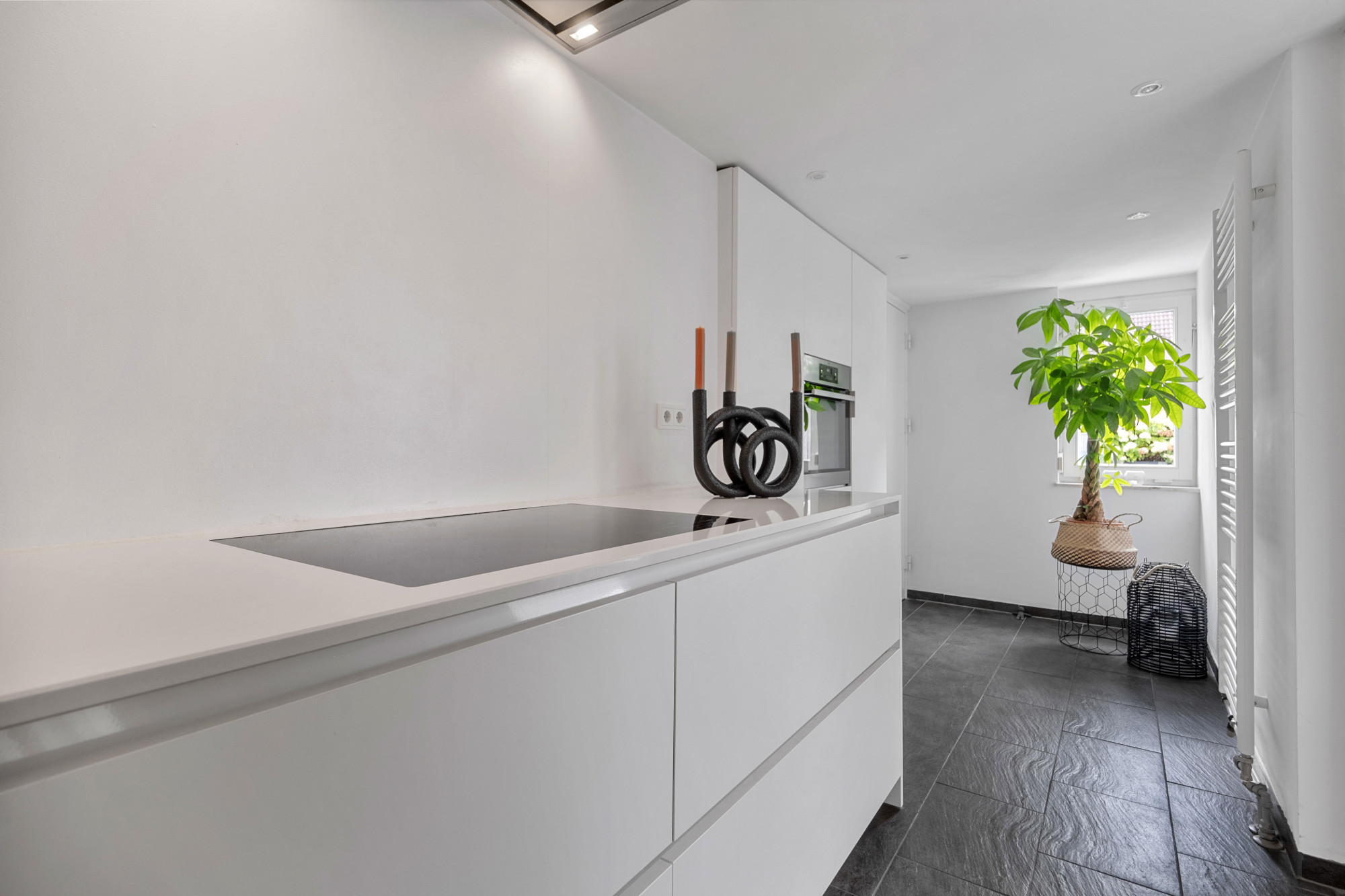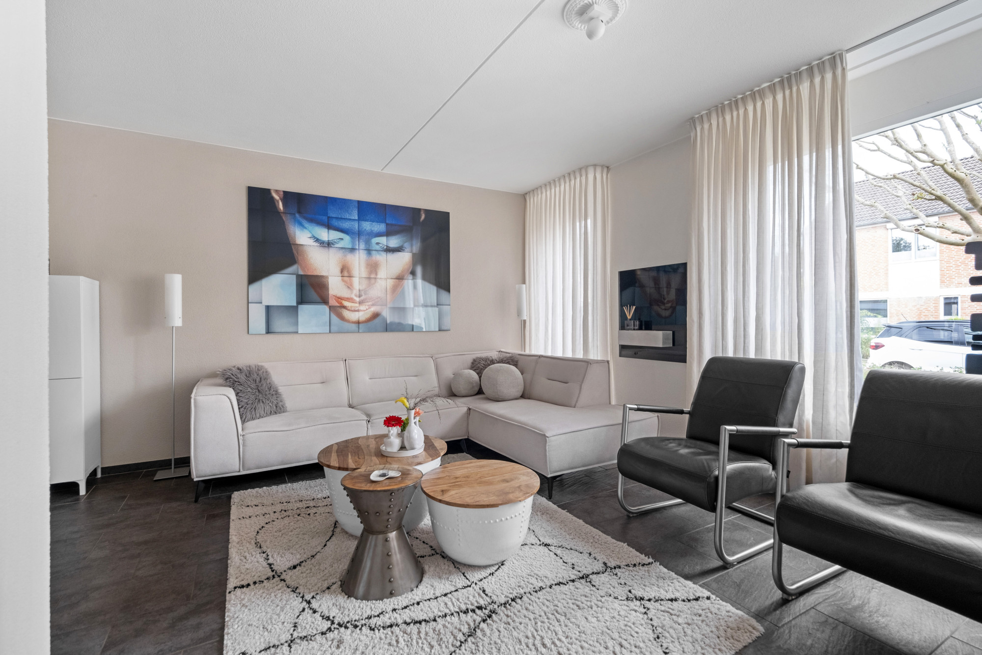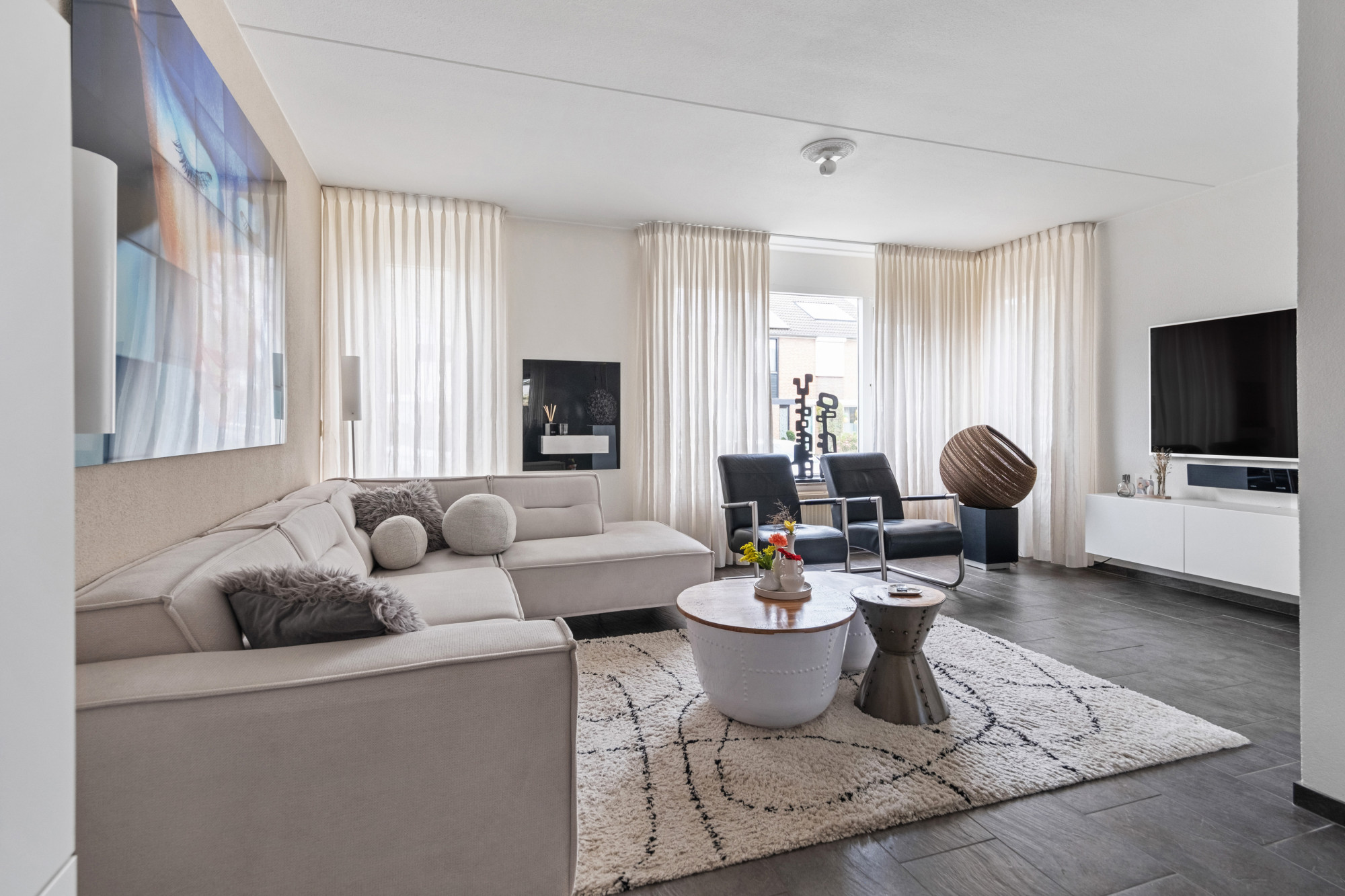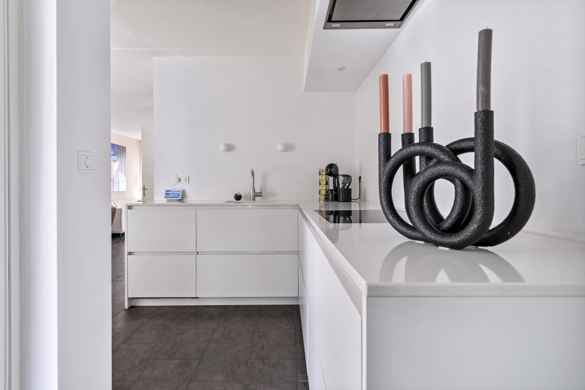 L-vormige woonkamer met fraaie tegelvloer, welke toegang geeft tot de semi-open luxe keuken met composieten werkblad, 4-pits inductiekookplaat, wasemkap, koelkast en combi-oven.