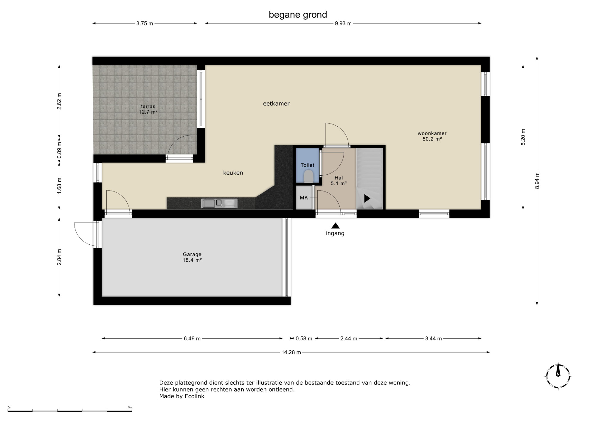 Overdekte entree, hal met trap naar verdieping, geheel betegelde toiletruimte met zwevend closet, meterkast.