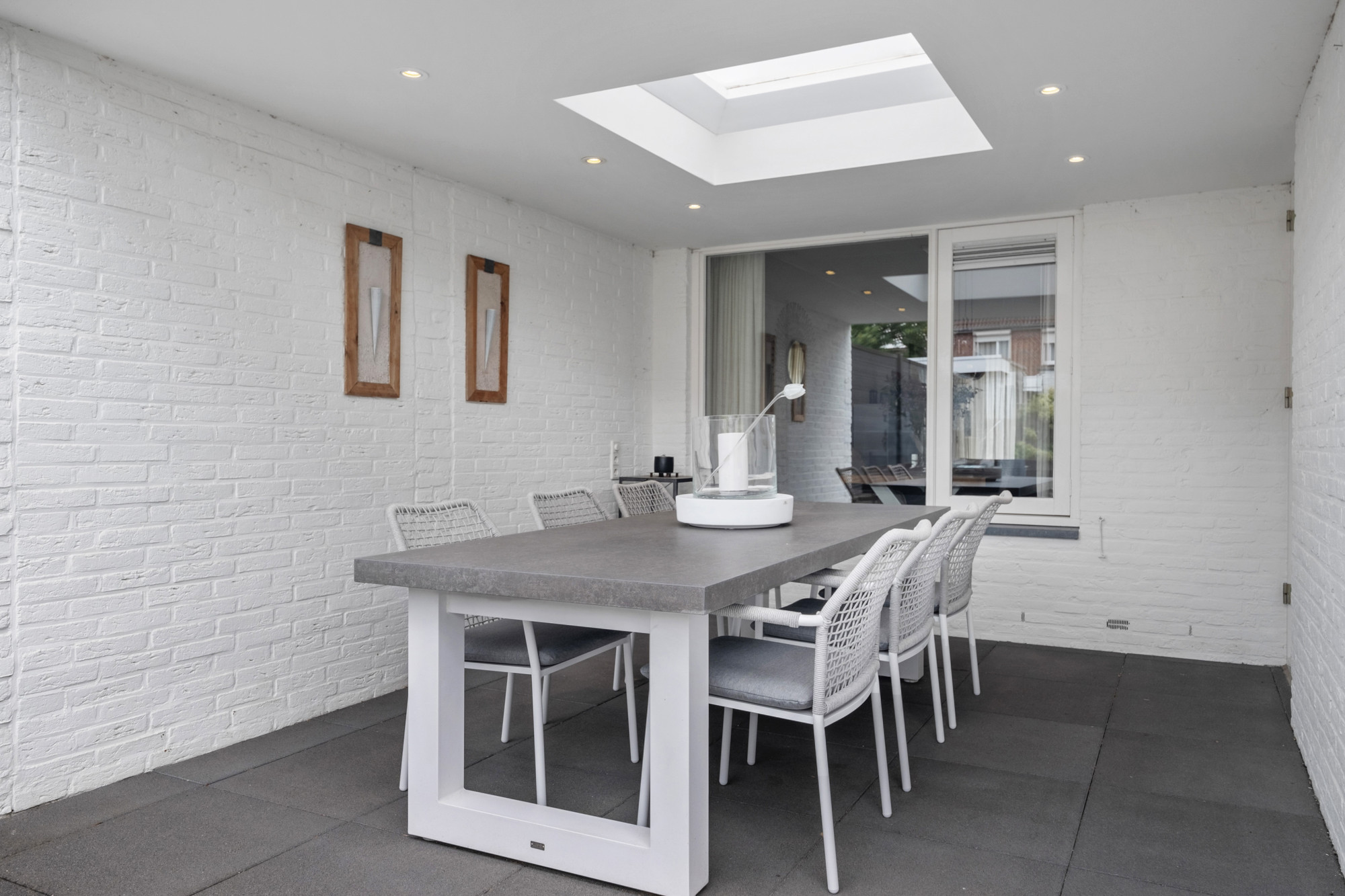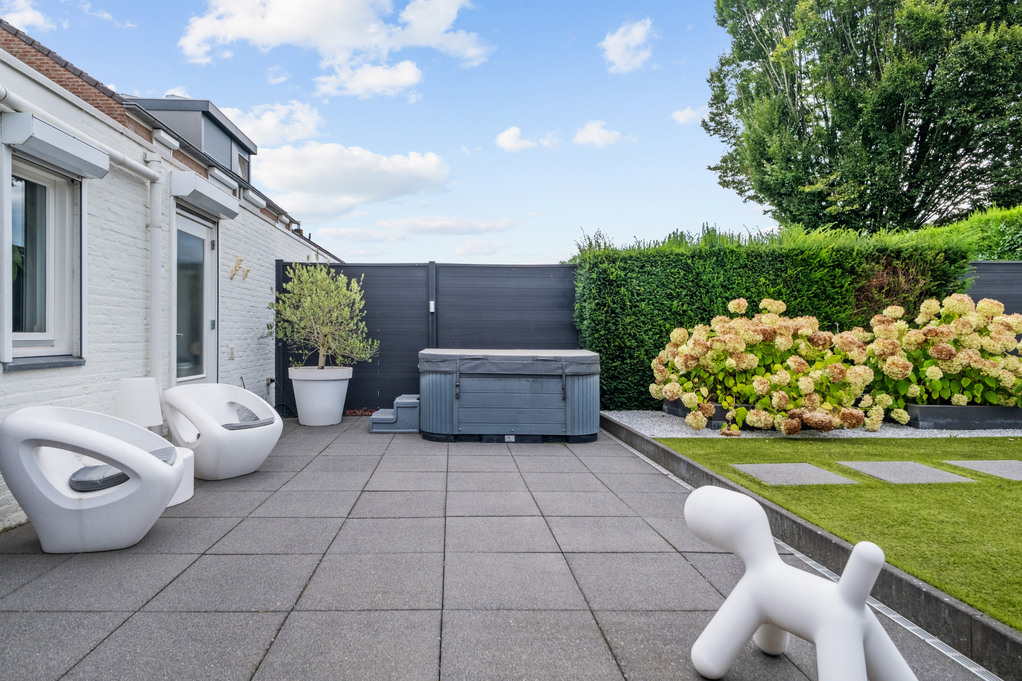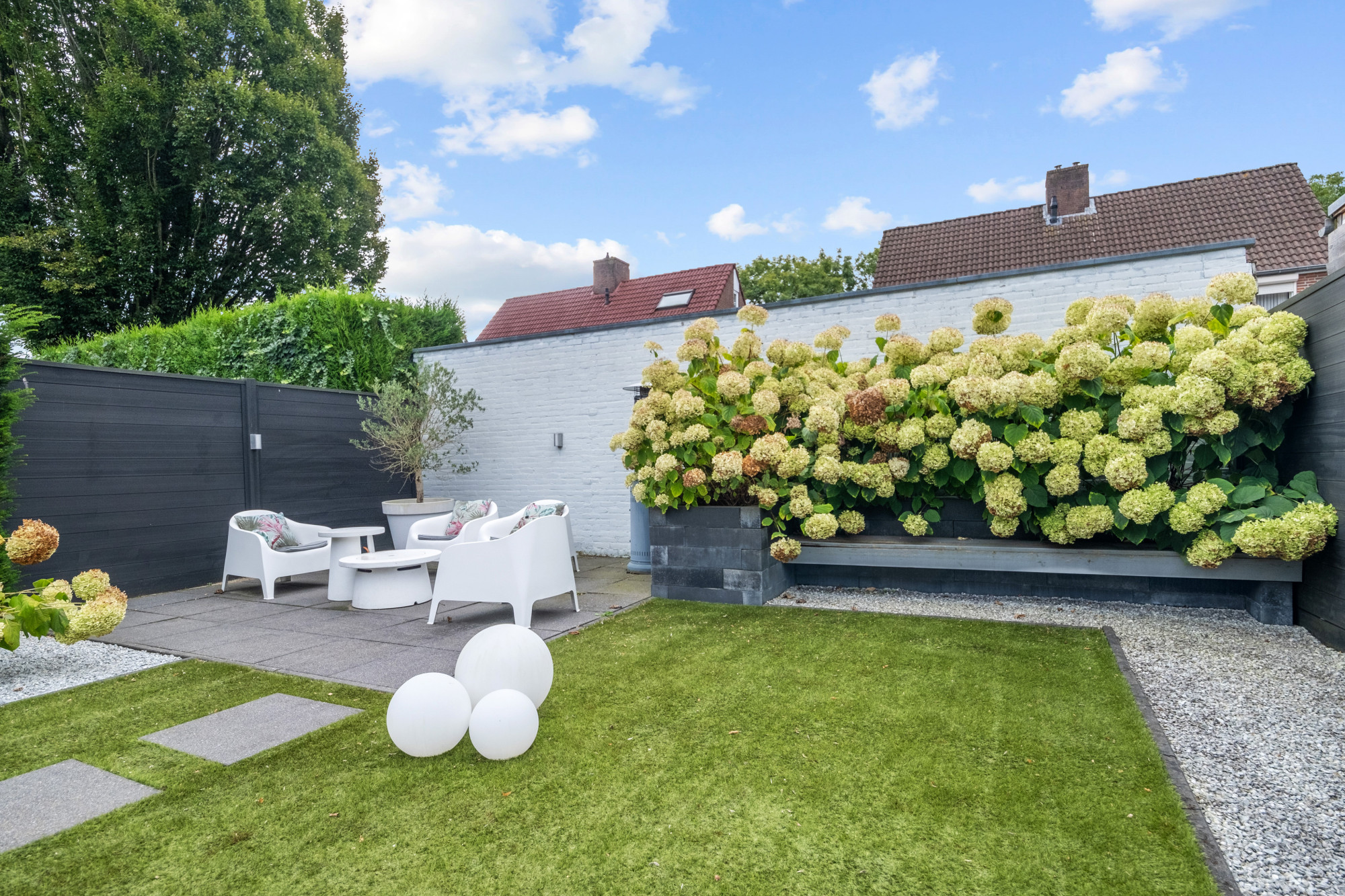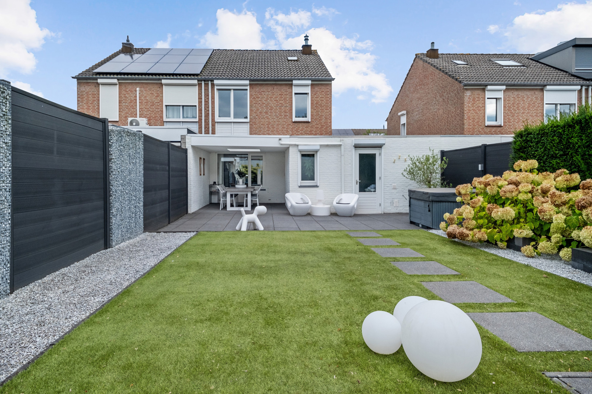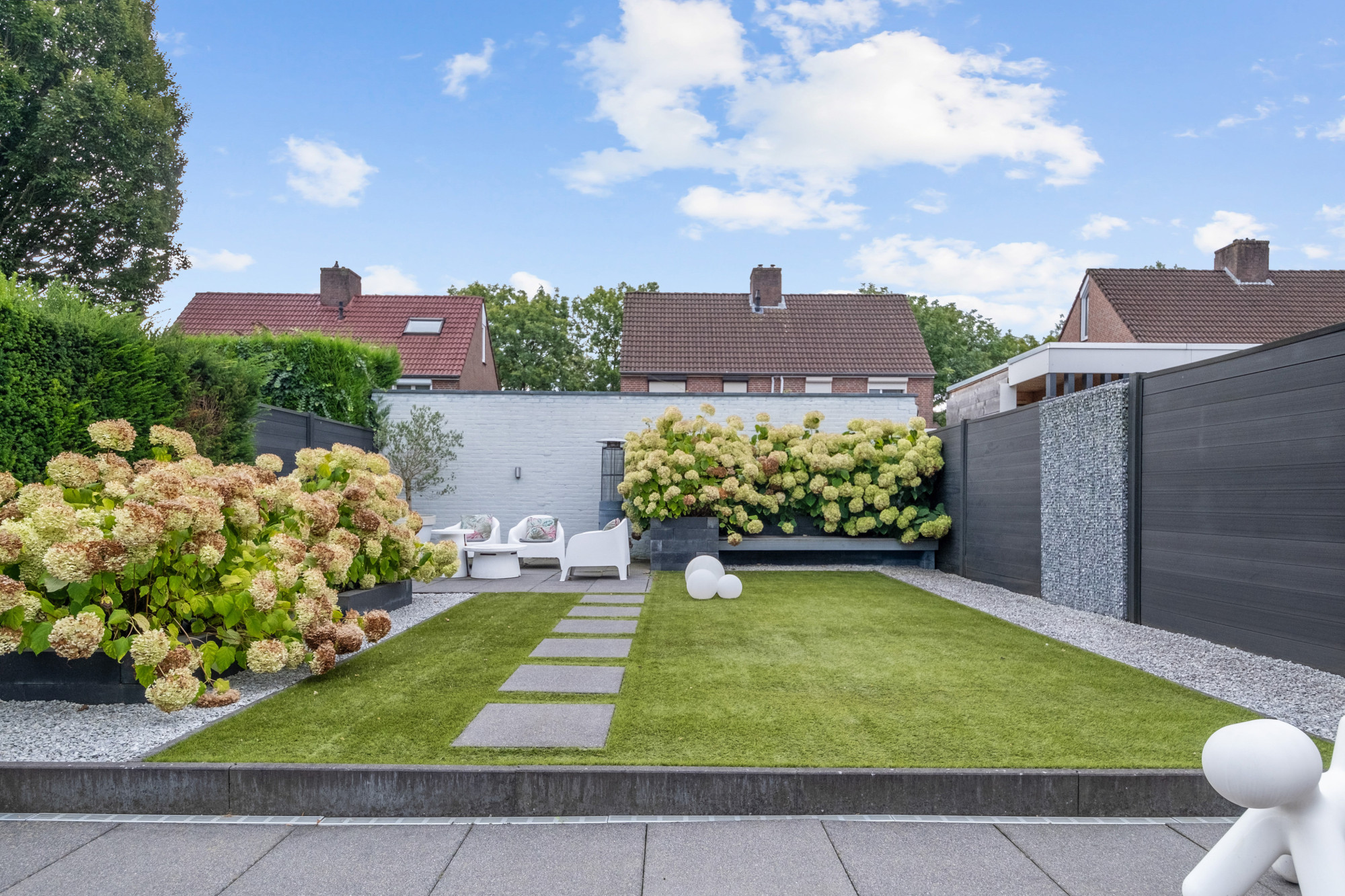 De keuken en de garage geven toegang tot de fraai aangelegde, onderhoudsvriendelijke achtertuin met terrasoverkapping voorzien van spotjes.
