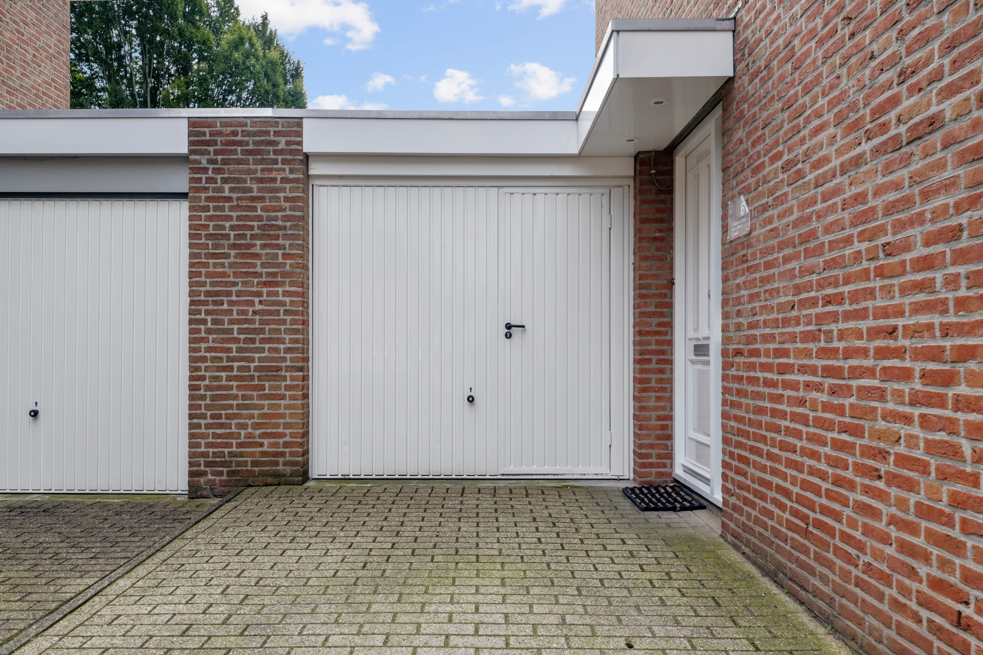 Aanpandige garage met elektrische poort met loopdeur en aansluitmogelijkheid wasapparatuur.