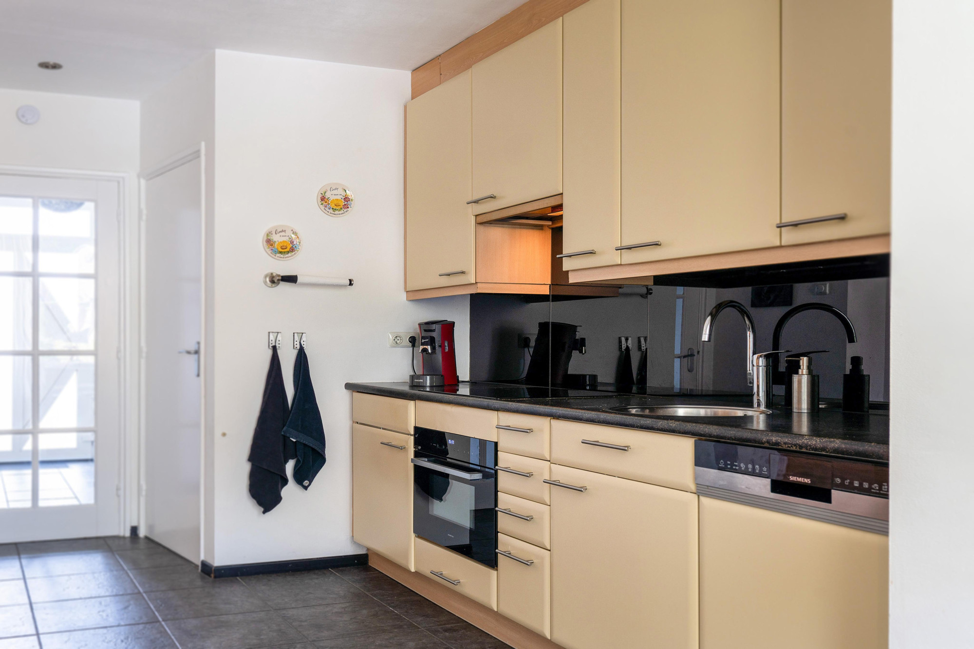 Open Keuken met tegelvloer, inclusief apparatuur: kookplaat, afzuigkap en vaatwasser, oven.