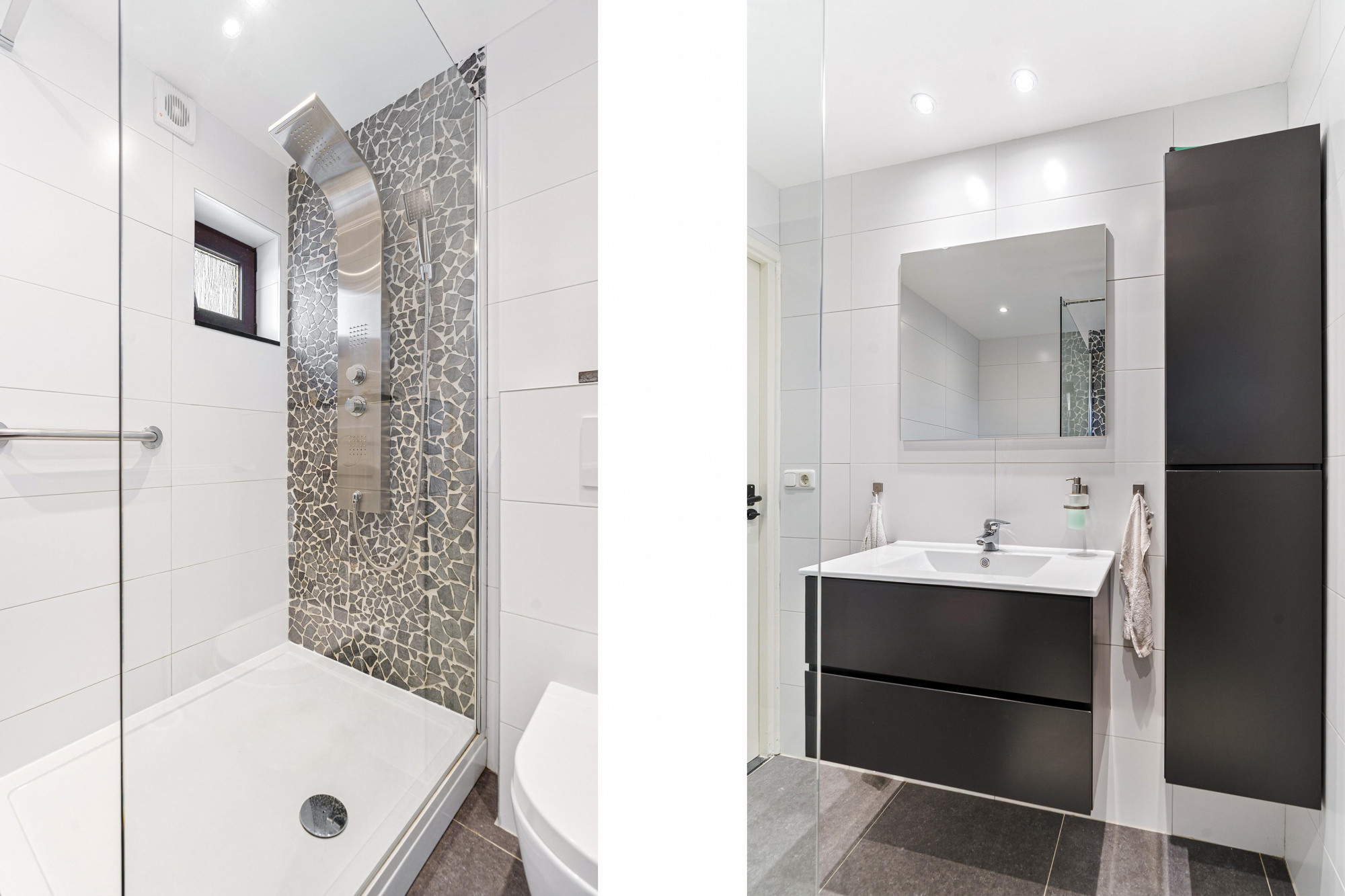 Volledig betegelde schitterende badkamer(nieuw, 2.08mx1.90m) met inloopdouche, vaste wastafel met ombouw en kast en zwevend 2e toilet.