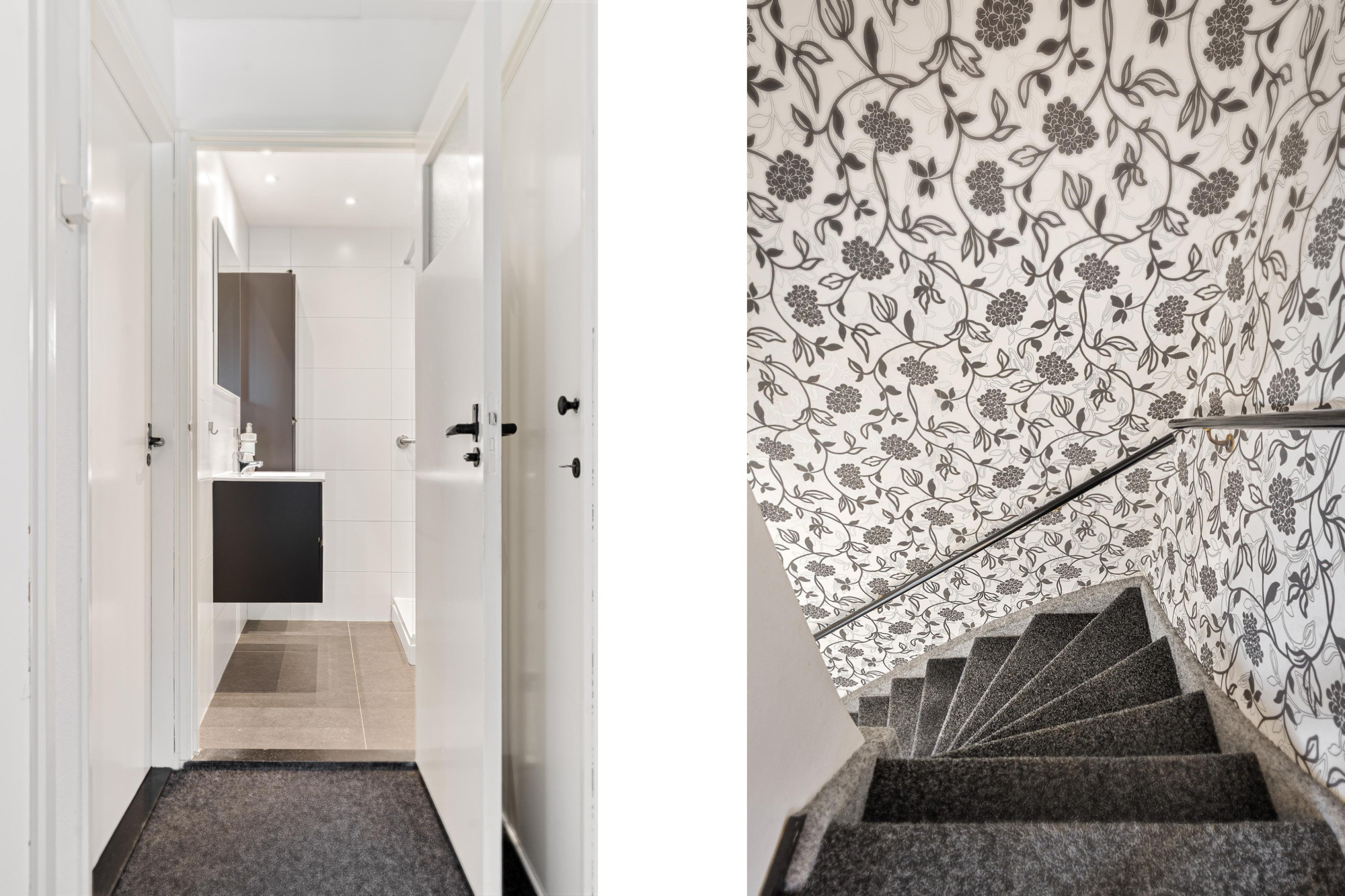 Entree met moderne meterkast en tegelvloer, volledig betegelde zwevend toilet.